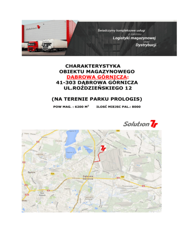 CHARAKTERYSTYKA OBIEKTU MAGAZYNOWEGO DĄBROWA GÓRNICZA: 41-303 DĄBROWA GÓRNICZA UL.ROŹDZIEŃSKIEGO 12 (NA TERENIE PARKU PROLOGIS) POW MAG. : 6200 M2 ILOSĆ MIEJSC PAL.: 8000 CHARAKTERYSTYKA OBIEKTU MAGAZYNOWEGO lokalizacja: magazyn klasy A znajduje się w Dąbrowie Górniczej wysokość netto 10,00 m nośność posadzki 7 T/m2 magazyn wyposażony w sygnalizację pożarową, klapy dymowe oraz tryskacze teren ogrodzony i nadzorowany magazyn wyposażony w system CCTV magazyn wyposażony w rampy załadowcze i doki rozładunkowe plac manewrowy dla samochodów o ładowności 24 ton magazyn wyposażony w ogrzewanie gazowe obiekt szczelny i suchy, możliwe składowanie w temperaturze od +5 do +25 stopni, wilgotność powietrza 65% (+/- 5%) godziny pracy magazynu 24 h od pon-pt. ZAKRES USŁUG Magazyn jest wyposażony w: systemy regałów wysokiego składowania system WMS Qguar do zarządzania gospodarką magazynową nowoczesny transport wewnętrzny całodobowy monitoring i dozór Podczas przyjmowania towarów do magazynu, towary podlegają: kontroli ilościowej i jakościowej oznakowaniu etykietami logistycznymi. Zapewniamy możliwość znakowania według indywidualnych wymagań np. sieci handlowych Towary wydawane są zgodnie ze zleceniem jako: palety jednorodne paczki palety mix pojedyncze sztuki _________________________________________________________________________________ 7r Solution Sp. z o.o. ul. Ludwinowska 7, 30-331 Kraków tel. +48 12 427 31 65 fax. +48 12 427 34 03 http://www.7rsolution.pl Procesy administracyjne wspierane są wysokiej klasy systemem informatycznym Qguar Pro firmy Quantum-Software, które zapewnia: zarządzanie stanami magazynowymi wydawanie produktów zgodnie z zasadami FEFO, FIFO lub według innych uzgodnionych reguł systemową kontrolę m. in. daty ważności produktów, numery serii produktów elektroniczną wymianę danych z Klientami poprzez interfejs do systemów ERP np. SAP czy Symfonia - wymiana danych odbywa się w czasie rzeczywistym generowanie dowolnych etykiet logistycznych tworzenie szczegółowych raportów dla Klientów ZAŁOŻENIA DO OFERTY Istnieje możliwość dokładnej identyfikacji towarów Towar będzie składowany na paletach lub w regałach lub w składzie blokowym 7R ponosi odpowiedzialność za szkody powstałe od momentu przyjęcia towaru do magazynu do chwili jego wydania w trakcie trwania współpracy Termin wystawienia FV w ostatni dzień miesiąca rozliczeniowego Proponowany termin płatności 14 dni od daty wystawienia faktury _________________________________________________________________________________ 7r Solution Sp. z o.o. ul. Ludwinowska 7, 30-331 Kraków tel. +48 12 427 31 65 fax. +48 12 427 34 03 http://www.7rsolution.pl
