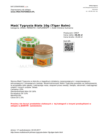 Glinka Agency mail;[email protected] Zapraszamy do sklepu www.MULTISTORE24.PL Warszawa tel. +48 602 395 051 Maść Tygrysia Biała 10g (Tiger Balm) kategoria: ZIOŁA, HERBATKI i SUPLEMENTY > Zioła Chińskie Kulinarne Producent: CMCP Cena netto: 28,46 zł Cena brutto: 35,00 zł Kod QR: Słynna Maść Tygrysia w słoiczku o łagodnym działaniu rozpraszającym i rozgrzewającym, poruszającym i usuwającym zastoje. Wszechstronność Maści Tygrysiej pozwala na zastosowanie w przypadku bólu głowy, cieknącego nosa, ukąszeń przez owady, świądu, obrzmień, nadciągnięć mięśni i innych urazów. Skład: Camphor 25% Dementholised Mint Oil 16% Eucalyptus Oil 13% Menthol 8% Clove Oil 1.5% Prosimy nie łaczyć produktów ziołowych z tej kategorii z innymi produyktami w sklepie w JEDNYM zamówieniu strona: 1/1 wydrukowano: 02-03-2017 http://www.multistore24.pl/masc-tygrysia-biala-10g-tiger-balm.html