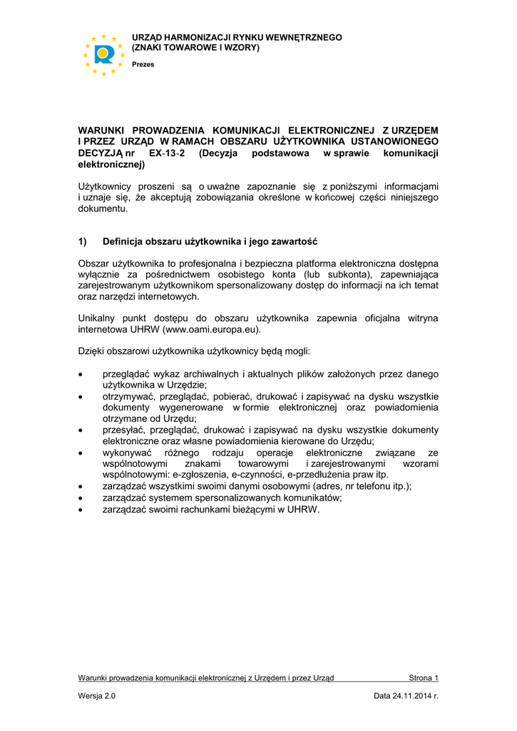 URZĄD HARMONIZACJI RYNKU WEWNĘTRZNEGO (ZNAKI TOWAROWE I WZORY) Prezes WARUNKI PROWADZENIA KOMUNIKACJI ELEKTRONICZNEJ Z URZĘDEM I PRZEZ URZĄD W RAMACH OBSZARU UŻYTKOWNIKA USTANOWIONEGO DECYZJĄ nr EX-13-2 (Decyzja podstawowa w sprawie komunikacji elektronicznej) Użytkownicy proszeni są o uważne zapoznanie się z poniższymi informacjami i uznaje się, że akceptują zobowiązania określone w końcowej części niniejszego dokumentu. 1) Definicja obszaru użytkownika i jego zawartość Obszar użytkownika to profesjonalna i bezpieczna platforma elektroniczna dostępna wyłącznie za pośrednictwem osobistego konta (lub subkonta), zapewniająca zarejestrowanym użytkownikom spersonalizowany dostęp do informacji na ich temat oraz narzędzi internetowych. Unikalny punkt dostępu do obszaru użytkownika zapewnia oficjalna witryna internetowa UHRW (www.oami.europa.eu). Dzięki obszarowi użytkownika użytkownicy będą mogli: • • • • • • • przeglądać wykaz archiwalnych i aktualnych plików założonych przez danego użytkownika w Urzędzie; otrzymywać, przeglądać, pobierać, drukować i zapisywać na dysku wszystkie dokumenty wygenerowane w formie elektronicznej oraz powiadomienia otrzymane od Urzędu; przesyłać, przeglądać, drukować i zapisywać na dysku wszystkie dokumenty elektroniczne oraz własne powiadomienia kierowane do Urzędu; wykonywać różnego rodzaju operacje elektroniczne związane ze wspólnotowymi znakami towarowymi i zarejestrowanymi wzorami wspólnotowymi: e-zgłoszenia, e-czynności, e-przedłużenia praw itp. zarządzać wszystkimi swoimi danymi osobowymi (adres, nr telefonu itp.); zarządzać systemem spersonalizowanych komunikatów; zarządzać swoimi rachunkami bieżącymi w UHRW. Warunki prowadzenia komunikacji elektronicznej z Urzędem i przez Urząd Wersja 2.0 Strona 1 Data 24.11.2014 r. URZĄD HARMONIZACJI RYNKU WEWNĘTRZNEGO (ZNAKI TOWAROWE I WZORY) Prezes 2) Zawartość obszaru użytkownika a) Wykazy plików W obszarze użytkownika znajdować się będzie wykaz wszystkich archiwalnych (zamkniętych) i aktualnych plików założonych przez użytkownika w Urzędzie. Wykaz prezentowany będzie w połączeniu z narzędziami do wyszukiwania, dzięki którym użytkownik będzie mógł zapoznać się ze szczegółowymi informacjami na temat danego pliku. Wykaz dostępny w obszarze użytkownika będzie zawierał jedynie te pliki, w związku z którymi dany zarejestrowany użytkownik występuje jako uczestnik danej procedury (strona, przedstawiciel itp.). Aktualnie dostępne wykazy plików: • • • • wspólnotowe znaki towarowe; wzory wspólnotowe; sprzeciwy dotyczące zgłoszonych znaków towarowych; wpisy, zmiany, kontrole plików. W przyszłości lista ta może zostać rozbudowana. b) Powiadomienia o decyzjach i inne dokumenty Obszar użytkownika umożliwia UHRW powiadamianie użytkownika w sposób wiążący o decyzjach i innych dokumentach drogą elektroniczną. W obszarze użytkownika użytkownik może wybrać opcję komunikacji elektronicznej za pośrednictwem platformy lub innej wiążącej formy komunikacji. W przypadku wybrania opcji komunikacji elektronicznej UHRW będzie powiadamiać użytkownika o wszelkich decyzjach i dokumentach drogą elektroniczną za pośrednictwem obszaru użytkownika, z wyłączeniem przypadków, gdy jest to niemożliwe z przyczyn technicznych. Wyboru opcji komunikacji elektronicznej lub innej formy komunikacji przewidzianej w obowiązujących przepisach użytkownik może dokonać w dowolnym momencie. Zmiana statusu zostanie jednak wprowadzona w życie dopiero po upływie czasu koniecznego ze względów technicznych. Użytkownicy będą mogli skorzystać z opcji otrzymywania komunikatu informującego o dostępności w obszarze użytkownika decyzji lub innego dokumentu oczekującego na dalsze przetwarzanie. Komunikat może mieć postać wiadomości e-mail, wiadomości SMS lub innego środka technicznego przewidzianego do tego celu. Podobny komunikat zostanie zaprezentowany bezpośrednio po zalogowaniu się użytkownika w obszarze użytkownika. Komunikat nie ma skutków prawnych. Ma wyłącznie charakter informacyjny. Uznaje się jednak, że dana decyzja lub inny dokument został(a) podany(-a) do wiadomości użytkownika wraz z upływem piątego dnia od daty, w której dana decyzja lub dokument został(a) dostarczony(-a) przez Urząd do skrzynki Warunki prowadzenia komunikacji elektronicznej z Urzędem i przez Urząd Wersja 2.0 Strona 2 Data 24.11.2014 r. URZĄD HARMONIZACJI RYNKU WEWNĘTRZNEGO (ZNAKI TOWAROWE I WZORY) Prezes odbiorczej użytkownika w obszarze użytkownika. Zalecane jest, aby użytkownicy logowali się w obszarze użytkownika przynajmniej raz w tygodniu w celu zapoznania się z otrzymanymi decyzjami lub innymi dokumentami. W obszarze użytkownika zostaje wskazana data podania do wiadomości danej decyzji lub dokumentu. W przypadku niemożności uzyskania dostępu do decyzji lub innego dokumentu użytkownik powinien niezwłocznie poinformować o takim fakcie UHRW. Użytkownik będzie miał możliwość przeglądania, drukowania lub zapisywania na dysku takich powiadomień w dowolnym momencie. c) Wnioski, korespondencja lub inne dokumenty przesyłane do Urzędu Obszar użytkownika pozwala na składanie wniosków (np. zgłoszenia, przedłużenia praw itp.) oraz przesyłanie korespondencji lub dokumentów w formie elektronicznej. Co do zasady, po pierwszym złożeniu/przesłaniu wniosku, korespondencji lub innego dokumentu w formie elektronicznej kolejne wnioski, korespondencję lub inne dokumenty w tej samej sprawie należy składać/przesyłać w ten sam sposób, z wyłączeniem przypadków, gdy jest to niemożliwe z przyczyn technicznych – wówczas użytkownik może korzystać z innej formy komunikacji. Wnioski, korespondencja lub dokumenty przekazywane do UHRW są poddawane automatycznej kontroli w celu zapewnienia bezpieczeństwa transmisji. W przypadku gdy w wyniku takiej kontro