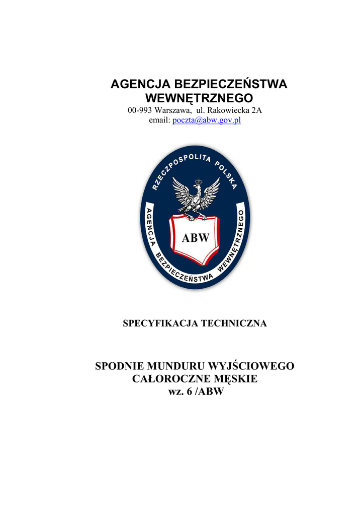 AGENCJA BEZPIECZEŃSTWA WEWNĘTRZNEGO 00-993 Warszawa, ul. Rakowiecka 2A email: [email protected] SPECYFIKACJA TECHNICZNA SPODNIE MUNDURU WYJŚCIOWEGO CAŁOROCZNE MĘSKIE wz. 6 /ABW SPIS TREŚCI L.p. 1 2 3 3.1 3.2 3.3 3.4 3.5 3.6 3.7 3.8 3.9 3.10 3.11 3.12 3.13 4 5 6 6.1 6.2 6.3 7 7.1 7.2 8 9 10 11 Opis podpunktu Rysunek modelowy spodni munduru wyjściowego Opis ogólny wyrobu Wymagania techniczne Wykaz materiałów zasadniczych i dodatków Wymagania techniczno-użytkowe gabardyny mundurowej, artykuł W-0119/E55/226 w kolorze khaki Wymagania techniczno-użytkowe sukna w kolorze granatowym, artykuł W-0419/p.1780 Wymagania techniczno-użytkowe tkaniny podszewkowej wiskozowej w kolorze khaki, artykuł J8324 Wymagania techniczno-użytkowe dzianiny podszewkowej, poliamidowej w kolorze khaki, artykuł 6275/AN/165 Wymagania techniczno – użytkowe tkaniny podszewkowej w kolorze khaki lub szarym, artykuł J7936 Wymagania techniczno-użytkowe włókniny perforowanej z klejem 10-35-10 Wymagania techniczno – użytkowe wkładu odzieżowego – tkaniny bez kleju, artykuł 44169/II/90/Y Wymagania techniczno-użytkowe wkładu odzieżowego – tkaniny bez kleju, artykuł 44125/90/YL Wymagania techniczno-użytkowe włókniny z klejem Rodzaje szwów i ściegów maszynowych Dopuszczalne sztukowanie elementów Tabela klasyfikacji wielkości Zestawienie elementów składowych Opis wykonania spodni munduru wyjściowego Cechowanie, składanie, pakowanie Rozmieszczenie cech dostawcy Składanie Pakowanie, przechowywanie i transport Rysunki techniczne Wykonanie spodni Wymiarowanie spodni Tabele wymiarów wyrobu gotowego Tabela wymiarów stałych i pomocniczych Wszywki Arkusz ewidencji wprowadzonych zmian Numer strony 2 3 4 4 5–7 8 9 10 11 12 12 12 12 13 14 15 16 17 – 19 20 20 20 20 21 21 – 29 30 – 31 32 – 37 37 – 41 42 43 1 1. RYSUNEK MODELOWY Rysunek nr 1 – spodnie munduru wyjściowego całoroczne męskie. 2 2. OPIS OGÓLNY WYROBU. Spodnie munduru wyjściowego całoroczne męskie wchodzą w skład umundurowania wyjściowego i reprezentacyjnego. Spodnie dopasowuje się tak aby krawędź nogawek z tyłu sięgała do górnej krawędzi obcasa. Spodnie munduru wyjściowego nosi się z paskiem skórzanym w kolorze czarnym. Spodnie wykonane są z tkaniny wełniano – poliestrowej w kolorze khaki. Spodnie długie biodrowe. Nogawki lekko zwężone ku dołowi. Doły nogawek skośnie podniesione ku przodowi. W przedniej nogawce, przy szwie paska, założona fałdka, od której biegnie w dół zaprasowany kant spodni. Szwy boczne, łączące przednie nogawki z tylnymi, przestębnowane po przedniej nogawce, na całej długości szwu bocznego wszyta jest wypustka koloru granatowego. Spodnie posiadają: Kieszenie boczne z jedną wypustką w przednich nogawkach. Kieszeń z wypustką i patką zapinaną na dziurkę i guzik w prawej, tylnej nogawce. Kolanówkę wszytą w przednie nogawki. Góra spodni wykończona pasem. Lewa część paska przedłużona, zapinana na dziurkę i guzik. W szwie środkowym przodu spodni umieszczony rozporek zapinany na guziki i dziurki. Na pasku rozmieszczonych jest siedem podtrzymywaczy pasa. Do paska przyszyte są guziki służące do przypięcia szelek. W doły nogawek wszyta taśma brzegowa oraz wkładka z podwójnej, jedwabnej podszewki, która wystaje powyżej podwinięcia dołu spodni około 2,5 cm. 3 3. WYMAGANIA TECHNICZNE. Spodnie powinny charakteryzować się: - dobrą układalnością, - odpornością na deformacje, - estetycznym wykonaniem – szwy powinny być ciągłe, wytrzymałe, wykonane prawidłowo (bez marszczeń i wyciągnięć), z prawidłowym wiązaniem ściegu w szwie. 3.1 WYKAZ MATERIAŁÓW ZASADNICZYCH I DODATKÓW. Wykaz materiałów zasadniczych i dodatków przedstawiono w tabeli nr 1. Tabela nr 1 Lp. Nazwa materiału /dodatku 1 gabardyna mundurowa w kolorze khaki, artykuł W-0119/E55/226 2 sukno w kolorze granatowym, artykuł W-0419/p.1780 dzianina podszewkowa, poliamidowa w kolorze tkaniny zasadniczej, artykuł 6275/AN/165 tkanina podszewkowa, wiskozowa w kolorze tkaniny zasadniczej, artykuł J8324 tkanina podszewkowa, z jedwabiu wiskozowego, splot płócienny w kolorze khaki lub szarym, artykuł J7936 3 4 5 6 włóknina z klejem 7 włóknina perforowana z klejem 10-35-10 8 wkład odzieżowy – tkanina bez kleju, artykuł 44169/II/90/Y 9 nici w kolorze tkaniny zasadniczej 10 taśma konfekcyjna w kolorze tkaniny zasadniczej 11 12 taśma lica w kolorze tkaniny zasadniczej taśma wieszakowa w kolorze tkaniny zasadniczej 13 guziki odzieżowe w kolorze tkaniny zasadniczej 14 15 16 17 18 19 wieszak odzieżowy wszywka firmowo-informacyjna etykieta jednostkowa etykieta na worek foliowy worek foliowy ość plastikowa Zastosowanie, wymagania zgodna z wymaganiami punkt 3.2 specyfikacji technicznej - tabela nr 2 zgodna z wymaganiami punkt 3.3 specyfikacji technicznej - tabela nr 3 zgodna z wymaganiami punkt 3.5 specyfikacji technicznej - tabela nr 5 zgodna z wymaganiami punkt 3.4 specyfikacji technicznej - tabela nr 4 zgodna z wymaganiami punkt 3.6 specyfikacji technicznej - tabela nr 6 zgodna z wymaganiami punkt 3.9 specyfikacji technicznej - tabela nr 9 zgodna z wymaganiami punkt 3.7 specyfikacji technicznej - tabela nr 7 zgodna z wymaganiami punkt 3.8 specyfikacji technicznej - tabela nr 8 rdzeniowe poliestrowo-poliestrowe o masie liniowej 150 dtex x 3, 200 dtex x 2 lub 250 dtex x 2 rdzeniowe poliestrowo-poliestrowe o masie liniowej 240 dtex x 2 lub 210 dtex x o splocie płóciennym (nieciągliwa) o szerokości 13mm o szerokości 6mm o szerokości 6mm poliestrowe, czterootworowe o średnicy 15mm profilowany z metalowym uchwytem zgodna z wymaganiami punkt 3.8 specyfikacji technicznej - tabela 8 do etykiety jednostkowej 4 3.2 WYMAGANIA TECHNICZNO – UŻYTKOWE GABARDYNY MUNDUROWEJ, artykuł W-0119/E55/226 w kolorze khaki. Wymagania techniczno – użytkowe przedstawia tabela nr 2. Tabela nr 2 zestawienie wymagań technicznych oraz metod badań przędz przeznaczony