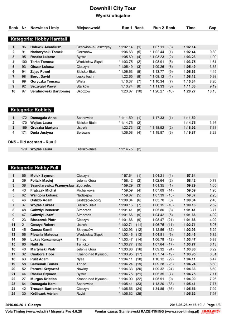 Downhill City Tour Wyniki oficjalne Rank Nr Nazwisko i Imię Miejscowość Run 1 Rank Run 2 Rank Time Gap 1:02.14 1:02.44 1:03.23 1:03.75 1:05.49 1:06.63 1:08.12 1:10.34 1:11.33 1:20.27 0.30 1.09 1.61 3.35 4.49 5.98 8.20 9.19 18.13 1:11.59 1:14.75 1:18.92 1:19.87 3.16 7.33 8.28 57.64 58.42 59.29 59.59 59.87 1:00.04 1:00.16 1:01.41 1:01.66 1:01.66 1:02.71 1:02.93 1:03.46 1:03.47 1:03.77 1:03.86 1:03.95 1:04.11 1:04.24 1:04.33 1:04.75 1:04.90 1:05.41 1:05.56 1:05.62 0.78 1.65 1.95 2.23 2.40 2.52 3.77 4.02 4.02 5.07 5.29 5.82 5.83 6.13 6.22 6.31 6.47 6.60 6.69 7.11 7.26 7.77 7.92 7.98 Kategoria: Hobby Hardtail 1 2 3 4 5 6 7 8 9 10 96 91 95 100 93 94 98 99 92 97 Holewik Arkadiusz Nadarzyński Tomek Raszka Łukasz Terka Tomasz Olszar Łukasz Zając Paweł Borot David Goryczka Tomasz Szczygieł Paweł Serafinowski Bartłomiej Czerwionka-Leszczyny Gorzanów Bystra Wodzisław Śląski Cieszyn Bielsko-Biała cesky tesin Wisła Starków Skoczów * 1:02.14 (1) 1:06.63 (5) 1:05.69 (4) * 1:03.75 (2) * 1:05.49 (3) * 1:06.63 (5) 1:22.65 (9) 1:10.37 (7) 1:13.74 (8) 1:23.87 (10) Sosnowiec Bielsko-Biala Ustroń Borówno * 1:11.59 * 1:14.75 1:22.73 1:36.58 (1) (2) (3) (4) Bielsko-Biala * 1:14.75 (2) Cieszyn Jelenia Góra Zgorzelec Michałkowa Nadziejów Jastrzębie-Zdrój Bielsko Biała Simoradz Simoradz Cieszyn Ustroń Skrzyszów Wodzisław Sląski Trinec Terlicko Jelenia Góra Krasno nad Kysucou Nysa Trinec Nowiny Bystra Krasno nad Kysucou Sosnowiec Cieszyn Rzyki * 57.64 * 58.42 * 59.29 * 59.59 * 59.87 * 1:00.04 * 1:00.16 * 1:01.41 * 1:01.66 * 1:01.66 * 1:02.71 * 1:02.93 * 1:03.46 * 1:03.47 * 1:03.77 * 1:03.86 * 1:03.95 * 1:04.11 * 1:04.24 * 1:04.33 * 1:04.75 * 1:04.90 * 1:05.41 * 1:05.56 * 1:05.62 (1) (2) (3) (4) (5) (6) (7) (8) (9) (9) (11) (12) (13) (14) (15) (16) (17) (18) (19) (20) (21) (22) (23) (24) (25) 1:07.11 (3) * 1:02.44 (1) * 1:03.23 (2) 1:08.91 (5) 1:09.26 (6) 1:13.77 (9) * 1:08.12 (4) * 1:10.34 (7) * 1:11.33 (8) * 1:20.27 (10) Kategoria: Kobiety 1 2 3 4 172 170 169 171 Domagała Anna Wojtas Laura Gruszka Martyna Duda Justyna 1:17.33 (1) * 1:18.92 * 1:19.87 (2) (3) 1:04.21 1:02.64 1:01.35 1:07.09 1:07.39 1:03.70 1:06.15 1:05.80 1:04.42 1:08.47 1:06.75 1:12.56 1:04.81 1:06.78 1:07.64 1:09.32 1:07.74 1:10.12 1:09.28 1:09.32 1:05.35 1:05.91 1:13.20 1:34.85 (4) (2) (1) (14) (15) (3) (10) (8) (5) (21) (11) (32) (6) (12) (17) (24) (19) (29) (23) (24) (7) (9) (33) (36) DNS - Did not start - Run 2 170 Wojtas Laura Kategoria: Hobby Full 1 2 3 4 5 6 7 8 9 9 11 12 13 14 15 16 17 18 19 20 21 22 23 24 25 55 39 38 43 62 46 37 48 47 23 21 45 56 59 60 40 32 63 58 52 44 27 64 42 30 Molek Szymon Foitzik Maciej Szyndlarewicz Przemysław Frątczak Michał Waligóra Łukasz Oślizło Adam Wojtas Łukasz Gabzdyl Ireneusz Gabzdyl Józef Błaszczak Piotr Goszyc Robert Gamża Kamil Plewnia Mateusz Lukas Karczmarzyk Nutil Jiri Martyński Piotr Cimbora Tibor Pulit Adam Cervenak Tomas Paruzel Krzysztof Raszka Szymon Murgas Kristian Domagała Kamil Troszok Bartłomiej Króliczek Adrian 2016-06-26 / Cieszyn Vola Timing (www.vola.fr) / Msports Pro 4.0.28 2016-06-26 at 16:19 / Page 1/3 VolaSoftControlPdf Pomiar czasu: Stanisławski RACE-TIMING (www.race-timing.pl) Downhill City Tour Wyniki oficjalne Rank Nr 26 27 28 29 30 31 32 33 34 35 36 37 38 39 40 41 26 41 57 29 24 49 61 53 28 33 54 50 25 31 36 51 Nazwisko i Imię Miejscowość Run 1 Rank Branny Dominik Ludwisiak Rafał Gorgol Martin Łysoń Tomasz Lorek Adrian Biesek Damian Lucivjansky Maros Ondrej Garai Vojuts Daniel Wac Mateusz Cieślik Konrad Kupień Daniel Sztoler Maciek Radim Adamek Kupka Jakub Marek Kamil Cieszyn Kowary Trinec Rzyki Cieszyn Chełm Śląski Spisska Nova Ves Cesky Tesin Krasno nad Kysucou Tychy Wisła Imielin Cieszyn Ostrava Cieszyn Bielsko-Biała * 1:06.07 * 1:06.37 * 1:06.44 * 1:06.55 1:12.04 * 1:07.32 * 1:07.67 * 1:07.68 * 1:08.20 * 1:09.34 1:14.76 * 1:09.70 * 1:09.86 1:22.31 1:18.44 * 1:26.09 (26) (27) (28) (29) (37) (30) (31) (32) (33) (34) (38) (35) (36) (40) (39) (41) Rzyki Rzyki Chełm Śląski Imielin * 1:06.55 * 1:05.62 * 1:07.32 * 1:09.70 (29) (25) (30) (35) Bielsko-Biała * 1:26.09 (41) Cieszyn Rybnik Wisła Bielsko-Biała Kraków Chrzanów Ustroń Wisła Paczków Goleszów Kozielno Hażlach Limanowa Limanowa Cieszyn Jonkowo Czarny Bór Kraków Cieszyn Zborov nad Bystricou Pogórze Wisła Łódź Wisła * 59.72 * 59.89 1:39.07 * 1:01.21 * 1:01.49 * 1:01.67 * 1:01.80 * 1:01.90 * 1:02.70 * 1:02.94 * 1:03.58 * 1:04.32 * 1:04.33 * 1:04.33 * 1:04.69 * 1:04.83 * 1:04.91 * 1:04.93 * 1:06.19 1:13.08 * 1:08.54 * 1:09.38 * 1:09.43 1:11.68 Run 2 Rank 1:07.68 (18) 1:08.65 (22) 1:07.39 (15) * 1:07.05 (13) 1:09.39 1:08.25 1:09.97 1:27.64 * 1:09.69 (26) (20) (28) (35) (27) 1:13.20 (33) * 1:11.93 (30) * 1:12.14 (31) Time Gap 1:06.07 1:06.37 1:06.44 1:06.55 1:07.05 1:07.32 1:07.67 1:07.68 1:08.20 1:09.34 1:09.69 1:09.70 1:09.86 1:11.93 1:12.14 1:26.09 8.43 8.73 8.80 8.91 9.41 9.68 10.03 10.04 10.56 11.70 12.05 12.06 12.22 14.29 14.50 28.45 59.72 59.89 1:00.76 1:01.21 1:01.49 1:01.67 1:01.80 1:01.90 1:02.70 1:02.94 1:03.58 1:04.32 1:04.33 1:04.33 1:04.69 1:04.83 1:04.91 1:04.93 1:06.19 1:08.52 1:08.54 1:09.38 1:09.43 1:09.49 0.17 1.04 1.49 1.77 1.95 2.08 2.18 2.98 3.22 3.86 4.60 4.61 4.61 4.97 5.11 5.19 5.21 6.47 8.80 8.82 9.66 9.71 9.77 DNS - Did not start - Run 2 29 30 49 50 Łysoń Tomasz Króliczek Adrian Biesek Damian Kupień Daniel DNF - Do not finish - Run 2 51 Marek Kamil Kategoria: Junior 1 2 3 4 5 6 7 8 9 10 11 12 13 13 15 16 17 18 19 20 21 22 23 24 125 139 143 131 136 138 121 142 132 123 133 122 146 145 124 147 134 135 148 128 126 140 137 144 Nytra Wojtek Kocjan Jakub Raszyk Tomasz Juraszek Wiktor Kasperek Mateusz Kowal Kamil Kunrad Kamil Goryczka Marek Dąbski Damian Panek Łukasz Borówka Wojciech Pomiećko Michał Sukiennik Adrian Sukiennik Sebastian Bojko Mateusz Kołodziejski Konrad Sowa Dawid Sadowski Kacper Gaura Tomasz Rieciciar Marcel Radomski Dawid Cieślar Szymon Zalega Michał Maziec Adam 2016-06-26 / Cieszyn Vola Timing (www.vol