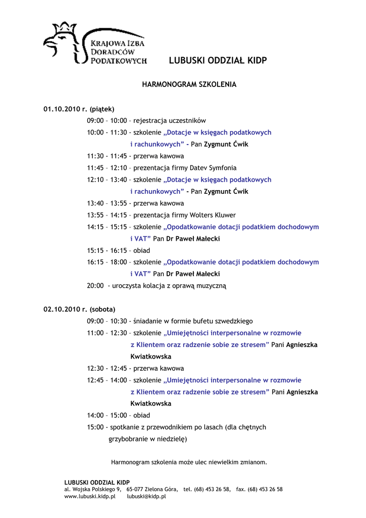 LUBUSKI ODDZIAŁ KIDP HARMONOGRAM SZKOLENIA 01.10.2010 r. (piątek) 09:00 – 10:00 – rejestracja uczestników 10:00 - 11:30 - szkolenie „Dotacje w księgach podatkowych i rachunkowych” - Pan Zygmunt Ćwik 11:30 - 11:45 - przerwa kawowa 11:45 – 12:10 – prezentacja firmy Datev Symfonia 12:10 – 13:40 – szkolenie „Dotacje w księgach podatkowych i rachunkowych” - Pan Zygmunt Ćwik 13:40 – 13:55 - przerwa kawowa 13:55 – 14:15 – prezentacja firmy Wolters Kluwer 14:15 – 15:15 – szkolenie „Opodatkowanie dotacji podatkiem dochodowym i VAT” Pan Dr Paweł Małecki 15:15 - 16:15 – obiad 16:15 – 18:00 – szkolenie „Opodatkowanie dotacji podatkiem dochodowym i VAT” Pan Dr Paweł Małecki 20:00 - uroczysta kolacja z oprawą muzyczną 02.10.2010 r. (sobota) 09:00 – 10:30 - śniadanie w formie bufetu szwedzkiego 11:00 – 12:30 – szkolenie „Umiejętności interpersonalne w rozmowie z Klientem oraz radzenie sobie ze stresem” Pani Agnieszka Kwiatkowska 12:30 - 12:45 - przerwa kawowa 12:45 – 14:00 – szkolenie „Umiejętności interpersonalne w rozmowie z Klientem oraz radzenie sobie ze stresem” Pani Agnieszka Kwiatkowska 14:00 – 15:00 – obiad 15:00 - spotkanie z przewodnikiem po lasach (dla chętnych grzybobranie w niedzielę) Harmonogram szkolenia moŜe ulec niewielkim zmianom. LUBUSKI ODDZIAŁ KIDP al. Wojska Polskiego 9, 65-077 Zielona Góra, tel. (68) 453 26 58, fax. (68) 453 26 58 www.lubuski.kidp.pl [email protected]