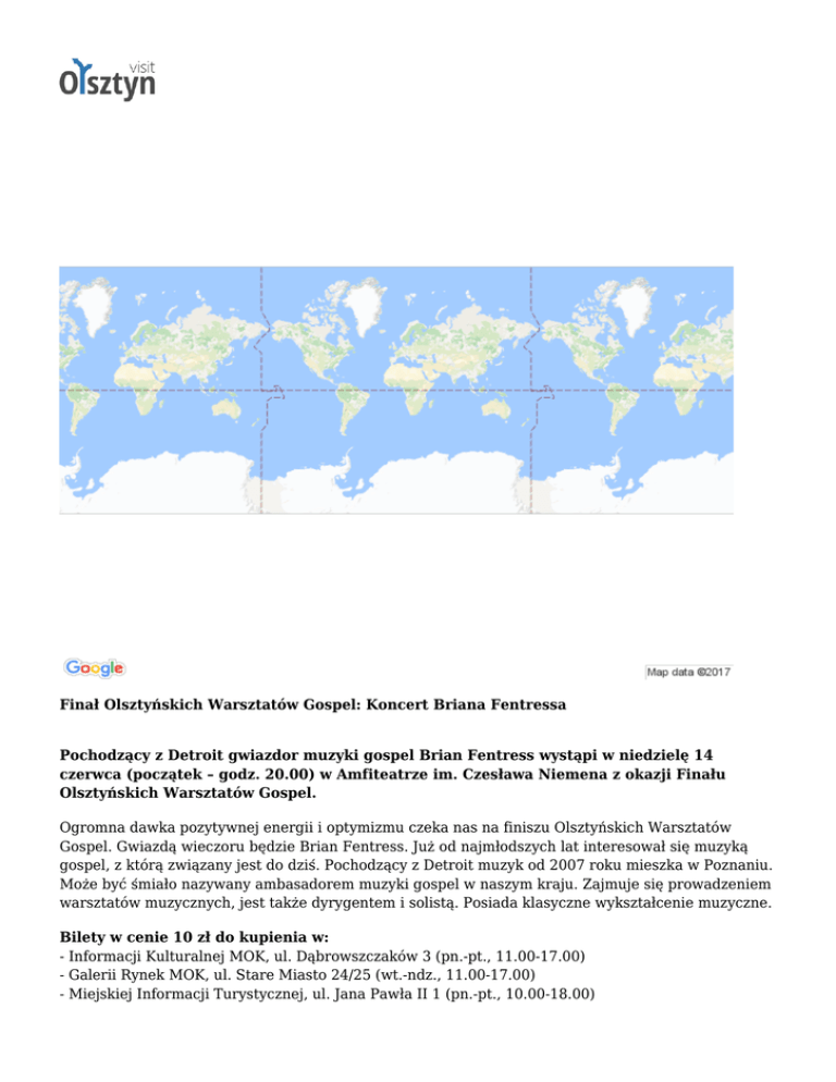 Finał Olsztyńskich Warsztatów Gospel: Koncert Briana Fentressa Pochodzący z Detroit gwiazdor muzyki gospel Brian Fentress wystąpi w niedzielę 14 czerwca (początek – godz. 20.00) w Amfiteatrze im. Czesława Niemena z okazji Finału Olsztyńskich Warsztatów Gospel. Ogromna dawka pozytywnej energii i optymizmu czeka nas na finiszu Olsztyńskich Warsztatów Gospel. Gwiazdą wieczoru będzie Brian Fentress. Już od najmłodszych lat interesował się muzyką gospel, z którą związany jest do dziś. Pochodzący z Detroit muzyk od 2007 roku mieszka w Poznaniu. Może być śmiało nazywany ambasadorem muzyki gospel w naszym kraju. Zajmuje się prowadzeniem warsztatów muzycznych, jest także dyrygentem i solistą. Posiada klasyczne wykształcenie muzyczne. Bilety w cenie 10 zł do kupienia w: - Informacji Kulturalnej MOK, ul. Dąbrowszczaków 3 (pn.-pt., 11.00-17.00) - Galerii Rynek MOK, ul. Stare Miasto 24/25 (wt.-ndz., 11.00-17.00) - Miejskiej Informacji Turystycznej, ul. Jana Pawła II 1 (pn.-pt., 10.00-18.00) Organizatorzy: Stowarzyszenie MISSIO MUSICA Kościół Zielonoświątkowy Kościół Chrześcijan Baptystów Współorganizacja: Miejski Ośrodek Kultury w Olsztynie 1)Amfiteatr im. Czesława Niemena, (2015-06-14 20:00-2015-06-14 21:00) www.visit.olsztyn.eu