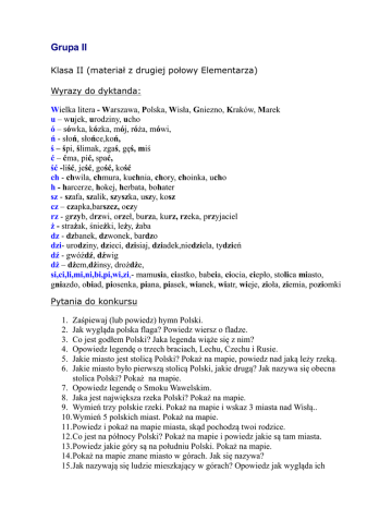 Grupa II Klasa II (materiał z drugiej połowy Elementarza) Wyrazy do dyktanda: Wielka litera - Warszawa, Polska, Wisła, Gniezno, Kraków, Marek u – wujek, urodziny, ucho ó – sówka, kózka, mój, róża, mówi, ń - słoń, słońce,koń, ś – śpi, ślimak, zgaś, gęś, miś ć – ćma, pić, spać, ść -liść, jeść, gość, kość ch - chwila, chmura, kuchnia, chory, choinka, ucho h - harcerze, hokej, herbata, bohater sz - szafa, szalik, szyszka, uszy, kosz cz – czapka,barszcz, oczy rz - grzyb, drzwi, orzeł, burza, kurz, rzeka, przyjaciel ż - strażak, śnieżki, leży, żaba dz - dzbanek, dzwonek, bardzo dzi- urodziny, dzieci, dzisiaj, dziadek,niedziela, tydzień dź - gwóźdź, dźwig dż – dżem,dżinsy, drożdże, si,ci,li,mi,ni,bi,pi,wi,zi,- mamusia, ciastko, babcia, ciocia, ciepło, stolica miasto, gniazdo, obiad, piosenka, piana, piasek, wianek, wiatr, wieje, zioła, ziemia, poziomki Pytania do konkursu 1. 2. 3. 4. 5. 6. Zaśpiewaj (lub powiedz) hymn Polski. Jak wygląda polska flaga? Powiedz wiersz o fladze. Co jest godłem Polski? Jaka legenda wiąże się z nim? Opowiedz legendę o trzech braciach, Lechu, Czechu i Rusie. Jakie miasto jest stolicą Polski? Pokaż na mapie, powiedz nad jaką leży rzeką. Jakie miasto było pierwszą stolicą Polski, jakie drugą? Jak nazywa się obecna stolica Polski? Pokaż na mapie. 7. Opowiedz legendę o Smoku Wawelskim. 8. Jaka jest największa rzeka Polski? Pokaż na mapie. 9. Wymień trzy polskie rzeki. Pokaż na mapie i wskaz 3 miasta nad Wisłą.. 10. Wymień 5 polskich miast. Pokaż na mapie. 11. Powiedz i pokaż na mapie miasta, skąd pochodzą twoi rodzice. 12. Co jest na północy Polski? Pokaż na mapie i powiedz jakie są tam miasta. 13. Powiedz jakie góry są na południu Polski. Pokaż na mapie. 14. Pokaż na mapie znane miasto w górach. Jak się nazywa? 15. Jak nazywają się ludzie mieszkający w górach? Opowiedz jak wygląda ich ludowy strój. 16. Wymień 2 miasta nad polskim morzem, pokaż je na mapie i powiedz jak się nazywają. Jak nazywa się polskie morze. 17. Wymień pory roku, i powiedz o każdej z nich. 18. Wymień nazwy miesięcy. 19. Kiedy piszemy wyrazy dużą literą? – podaj przykłady. 20. Wymień dni tygodnia. 21. Kim był Jan Paweł II? 22. Wymień 2 największe święta kościelne. Które z nich lubisz i dlaczego? 23. W którym miesiącu są święta Bożego Narodzenia i jakie znasz tradycje związane z tymi świętami? 24. Kiedy są Święta Wielkanocne i jakie znasz tradycje związane z tymi świętami? 25. Do jakiej polskiej szkoły uczęszczasz, kto jest patronem twojej szkoły? Dlaczego uczysz się języka polskiego? 26. Dlaczego piszemy ó w wyrazach: lód, wóz, kózka? 27. Kto to jest: lekarz, weterynarz, aptekarz, piekarz, krawiec? 28. Powiedz wyraz, w którym jest sylaba: -sia, -sie, -sio. 29. Powiedz wyraz, w którym jest sylaba: -nia, -nie, -nio. 30. Powiedz wyraz, w którym jest sylaba: -bia, -bie, -bio, -biu. 31. Powiedz wyraz, w którym jest sylaba: -pia, -pie, -pio, -piu. 32. Powiedz wyraz, w którym jest sylaba: -wia, -wie, -wio. 33. Powiedz wyraz, w którym jest sylaba: -cia, -cią, -cie, - cię, -cio, -ciu. 34. Powiedz wyraz, w którym jest sylaba: -zia, -zie, -zio. 35. Powiedz wyraz, w którym jest sylaba: -mia, -mie, -mię. 36. Powiedz wyraz, w którym są litery zmiękczone przez „kreseczkę”: -ć, -ś, -ń, -ź. 37. Powiedz wyraz, w którym są dwuznaki: sz, cz, ch, rz, dz, dż, dź. 38. Podziel na sylaby wyrazy: szczoteczka, niedźwiedź, niedziela, koszula. 39. Zamień „r” na „rz” w wyrazach: rower, traktor, tor, mur, góra. 40. Zamień „rz” na „r” w wyrazach: morze, lekarz, żołnierz, marynarz. 41. Powiedz wyrazy przeciwne do wyrazów: mało, lekko, jasno, zimno. Zestaw pytań dla grupy II przygotowały: Elzbieta Wolska, Marta Czaczkowska Elzbieta Tumilowska