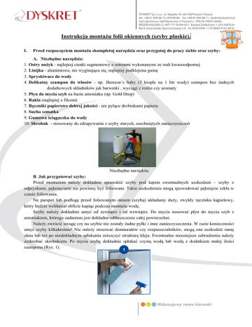 Instrukcja montażu folii okiennych (szyby płaskie). I. Przed rozpoczęciem montażu skompletuj narzędzia oraz przygotuj do pracy siebie oraz szyby: A. Niezbędne narzędzia: 1. Ostry nożyk - najlepiej cienki segmentowy z ostrzami wykonanymi ze stali kwasoodpornej 2. Linijka - aluminiowa, nie wyginająca się, najlepiej podklejona gumą 3. Spryskiwacz do wody 4. Delikatny szampon do włosów - np. Jhonson’s baby (3 krople na 1 litr wody) szampon bez żadnych dodatkowych składników jak barwniki , wyciągi z roślin czy aromaty 5. Płyn do mycia szyb na bazie amoniaku (np. Gold Drop) 6. Rakla (najlepiej z filcem) 7. Ręczniki papierowe dobrej jakości - nie pylące drobinkami papieru 8. Sucha szmatka 9. Gumowa ściągaczka do wody 10. Skrobak - stosowany do zdrapywania z szyby starych, zaschniętych zanieczyszczeń Niezbędne narzędzia B. Jak przygotować szyby: Przed montażem należy dokładnie sprawdzić szyby pod kątem ewentualnych uszkodzeń – szyby z odpryskami, pęknięciami nie powinny być foliowane. Takie uszkodzenia mogą spowodować pęknięcie szkła w czasie foliowania. Na parapet lub podłogę przed foliowanym oknem (szybą) układamy duży, zwykły ręcznika kąpielowy, który będzie wchłaniał obficie kapiąc podczas montażu wodę. Szyby należy dokładnie umyć od zewnątrz i od wewnątrz. Do mycia stosować płyn do mycia szyb z amoniakiem, którego zadaniem jest dokładne odtłuszczenie całej powierzchni. Należy zwrócić uwagę czy na szybie nie zostały żadne pyłki i inne zanieczyszczenia. W razie konieczności umyć szyby kilkakrotnie! Nie należy stosować denaturatów czy rozpuszczalników, mogą one uszkodzić ramę okna lub też po niedokładnym spłukaniu zniszczyć strukturę kleju. Ewentualne mocniejsze zabrudzenia należy zeskrobać skrobakiem. Po mycia szybę dokładnie spłukać czystą wodą lub wodą z dodatkiem małej ilości szamponu (Rys. 1). Folię montować przy temperaturze minimu 10°C. Unikać też montażu w bardzo słoneczne dni – wtedy woda znacznie szybciej odparowuje, uniemożliwiając pozycjonowanie folii na szybie. II. Montaż folii: 1. Dokładnie mierzymy szybę i docinamy folię, zachowując zapas 2-3cm z każdej strony (Rys. 2). 2. Umytą szybę spryskujemy roztworem wody z szamponem. 3. Usuwamy warstwę ochronną z folii i spryskujemy ją bardzo obficie również roztworem wody z szamponem. Do rozwarstwiania folii od podkładu stosujemy metodę dwóch kawałków taśmy papierowej, przyklejonej w narożniku folii z obu jej stron. Ciągnąc w przeciwne strony kwałki taśmy folia rozwarstwi się od podkładu (Rys. 3). Przy zdejmowaniu podkładu możemy sobie pomóc „przyklejając” tylko na wodę folię na sąsiedniej szybie folią ochronną w naszą stronę (Rys. 4). 4. Folię umieszczamy na szybie – klejem do tafli szkła. Delikatnie układamy folię na szkle – eliminując ewentualne zagniecenia (Rys. 5) 5. Ponownie spryskujemy folię roztworem (Rys. 6). Następnie miękką raklą wyciskamy wodę spod folii – rozpoczynamy od środka okna w górę i w dół a następnie miejsce przy miejscu od środka w lewo i w prawo na zewnątrz (Rys. 7). 6. Na koniec delikatnie odcinamy nadmiar folii na krawędziach. Do tego celu używamy platikowej rakli bez filcu tnąc nożykiem z nowym ostrzem (każda krawędź to nowe ostrze!). Rakiel przykładamy całą krawędzią do szyby i ramy okna i dopiero na nim opieramy ostrze. Tak ustawione narzędzia w całości przesuwamy wzdłuż krawędzi szyby (Rys. 8). 7. Przy foliach zewnętrznych stosujemy sylikonowanie krawędzi folii. 8. Widoczne pod folią drobinki wody (w postaci „smug”) mogą parować jeszcze przez okres od kilku godzin do kilku tygodni w zależności od ich wielkości, temperatury otoczenia, wilgotności... 9. Jeśli pozostały jakiekolwiek drobinki kurzu między szybą a folią, należy je wycisnąć rakielką poza obszar montażu (jeszcze przed ostatecznym wyciśnięciem wody spod folii). Może się to jednak okazać niemożliwe. 10. W okresie schnięcia kleju (około 6 tygodni) szyby nie mogą być myte! Opracowali: Piotr Łunkiewicz Michał Sosiński Barbara Wojciechowska