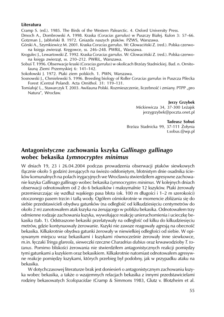 Literatura Cramp S. (ed.). 1985. The Birds of the Western Palearctic. 4. Oxford University Press. Dmoch A., Dombrowski A. 1998. Kraska (Coracias garrulus) w Puszczy Białej. Kulon 3: 57–66. Gotzman J., Jabłoński B. 1972. Gniazda naszych ptaków. PZWS, Warszawa. Górski A., Szymkiewicz M. 2001. Kraska Coracias garrulus. W: Głowaciński Z. (red.). Polska czerwona księga zwierząt. Kręgowce, ss. 246–248. PWRiL, Warszawa. Krogulec J., Lewartowski Z. 1992. Kraska Coracias garrulus. W: Głowaciński Z. (red.). Polska czerwona księga zwierząt, ss. 210–212. PWRiL, Warszawa. Sobuś T. 1996. Obserwacje kraski (Coracias garrulus) w okolicach Brzózy Stadnickiej. Bad. n. Ornitofauną Ziemi Przemyskiej 6: 141–142. Sokołowski J. 1972. Ptaki ziem polskich. 1. PWN, Warszawa. Sosnowski J., Chmielewski S. 1996. Breeding biology of Roller Coracias garrulus in Puszcza Pilecka Forest (Central Poland). Acta Ornithol. 31: 119–131. Tomiałojć L., Stawarczyk T. 2003. Awifauna Polski. Rozmieszczenie, liczebność i zmiany. PTPP „pro Natura”, Wrocław. Jerzy Grzybek Mickiewicza 34, 37-300 Leżajsk [email protected] Tadeusz Sobuś Brzóza Stadnicka 99, 37-111 Żołynia [email protected] Antagonistyczne zachowania kszyka Gallinago gallinago wobec bekasika Lymnocryptes minimus W dniach 19, 23 i 26.04.2004 podczas prowadzenia obserwacji ptaków siewkowych (łącznie około 5 godzin) żerujących na świeżo odsłoniętym, błotnistym dnie osadnika ścieków komunalnych na polach irygacyjnych we Wrocławiu stwierdziłem agresywne zachowanie kszyka Gallinago gallinago wobec bekasika Lymnocryptes minimus. W kolejnych dniach obserwacji odnotowałem od 2 do 6 bekasików i maksymalnie 12 kszyków. Ptaki żerowały przemieszczając się wzdłuż wąskiego pasa błota (ok. 100 m długości i 1–2 m szerokości) otoczonego pasem trzcin i taflą wody. Ogółem ośmiokrotnie w momencie zbliżania się do siebie przedstawicieli obydwu gatunków (na odległość od kilkudziesięciu centymetrów do około 2 m) zanotowałem atak kszyka na żerującego w pobliżu bekasika. Odnotowałem trzy odmienne rodzaje zachowania kszyka, wywołujące reakcję unieruchomienia i ucieczkę bekasika (tab. 1). Odstraszone bekasiki przelatywały na odległość od kilku do kilkudziesięciu metrów, gdzie kontynuowały żerowanie. Kszyki nie zawsze reagowały agresją na obecność bekasika. Kilkakrotnie obydwa gatunki żerowały w niewielkiej odległości od siebie. W opisywanym miejscu wraz bekasikami i kszykami równocześnie żerowały inne siewkowce, m.in. łęczaki Tringa glareola, sieweczki rzeczne Charadrius dubius oraz krwawodzioby T. totanus. Pomimo bliskości żerowania nie stwierdziłem antagonistycznych reakcji pomiędzy tymi gatunkami a kszykiem oraz bekasikiem. Kilkakrotnie natomiast odnotowałem agresywne reakcje pomiędzy kszykami, których przebieg był podobny, jak w przypadku ataku na bekasika. W dotychczasowej literaturze brak jest doniesień o antagonistycznym zachowaniu kszyka wobec bekasika, a także o wzajemnych relacjach bekasika z innymi przedstawicielami rodziny bekasowatych Scolopacidae (Cramp & Simmons 1983, Glutz v. Blotzheim et al. 55 Tabela 1. Agresywne zachowanie kszyka Gallinago gallinago i reakcja na nie bekasika Lymnocryptes minimus Table 1. Aggressive behaviour of a Snipe and responses by a Jack Snipe. (1) – pose of the Snipe, (2) – response of the Jack Snipe Zachowanie kszyka Gallinago gallinago (1) Przykucnięcie, przyłożenie do podłoża głowy i korpusu, nagłe uniesienie tyłu ciała i wierzchu ogona oraz rozłożenie sterówek w kierunku bekasika w celu demonstracji ich biało-pomarańczowego ubarwienia. Cały rytuał trwał około 2 sekund Uniesienie i wyciągnięcie ciała ku górze na wyprostowanych nogach, wyciągnięcie dzioba w kierunku bekasika, przy rozłożonej przynasadowej i złożonej części dłoniowej skrzydeł Bezpośredni atak przy pochylonych i wyciągniętych do przodu głowie i dziobie N Reakcja bekasika Lymnocryptes minimus (2) 3 Nagłe unieruchomienie – przykucnięcie i przywarcie do podłoża na szeroko rozstawionych nogach, z pochyloną głową i wyciągniętym do przodu dziobem; po kilkunastu sekundach odlot ptaka 2 jw. 3 Natychmiastowa ucieczka ptaka (początkowo bieg, następnie odlot) 1977). Jest to niewątpliwie związane ze skrytym trybem życia i przebywaniem bekasika zwykle w miejscach porośniętych zwartą roślinnością, która uniemożliwia ich obserwację. Znacznie lepiej rozpoznano antagonistyczne zachowania kszyka wobec innych siewkowców Charadrii oraz przedstawicieli własnego gatunku (Cramp 1983, Glutz v. Blotzheim et al. 1977). Według Glutza i innych (1977) oraz Crampa (1983) poza kszyka polegająca na uniesieniu i rozłożenie sterówek (patrz: akapit 1 w tab. 1) jest głównym antagonistycznym zachowaniem wobec przedstawicieli własnego gatunku i innych siewkowców, charakterystycznym dla obydwu płci. Podobne antagonistyczne pozy przybierają również samce na tokowiskach. Głównym elementem takiego rytuału jest ukazanie ciemnej plamy, zlokalizowanej w dystalnej części środkowych sterówek. Pozę tę przybierają ptaki zarówno w pozycji stojącej (przy wyprostowanych nogach), jak i leżącej (przy wyciągniętej do przodu głowie; porównaj: rys. C na s. 417 w Cramp 1983 oraz rys. 15 na s. 71 w Glutz v. Blotzheim et al. 1977). Pozostałe zachowania przedstawione w tabeli 1 nie znajdują odpowiedników w opisanych dotychczas pozach, a w świetle złożoności postaw kszyka, zwłaszcza w okresie godowym, mogą stanowić ich zmodyfikowaną formę. Reakcja bekasika polegająca na nagłym unieruchomieniu – przykucnięciu i przywarciu do podłoża – stanowi charakterystyczną pozę tego gatunku, która przybierana jest w momencie zagrożenia, np. w momencie pojawienia się człowieka, czy zaniepokojenia (Cramp 1983, Fearnside 1990, por. Sikora & Maniakowski 2000). Niniejsze obserwacje wskazują także, że pozycję taką przy
