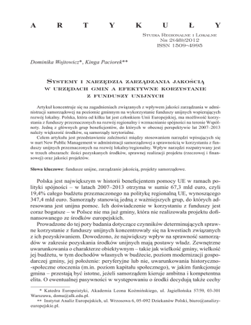 a r t y k u ł y Studia Regionalne i Lokalne Nr 2(48)/2012 ISSN 1509–4995 Dominika Wojtowicz*, Kinga Paciorek** Systemy i narzędzia zarządzania jakością w urzędach gmin a efektywne korzystanie z funduszy unijnych Artykuł koncentruje się na zagadnieniach związanych z wpływem jakości zarządzania w administracji samorządowej na poziomie gminnym na wykorzystanie funduszy unijnych wspierających rozwój lokalny. Polska, która od kilku lat jest członkiem Unii Europejskiej, ma możliwość korzystania z funduszy przeznaczonych na rozwój regionalny i wzmacnianie spójności na terenie Wspólnoty. Jedną z głównych grup beneficjentów, do których w obecnej perspektywie lat 2007–2013 należy większość środków, są samorządy terytorialne. Celem artykułu jest przedstawienie zależności między stosowaniem narzędzi wpisujących się w nurt New Public Management w administracji samorządowej a sprawnością w korzystaniu z funduszy unijnych przeznaczonych na rozwój lokalny/regionalny. Wpływ narzędzi rozpatrywany jest w trzech obszarach: ilości pozyskanych środków, sprawnej realizacji projektu (rzeczowej i finansowej) oraz jakości projektów. Słowa kluczowe: fundusze unijne, zarządzanie jakością, projekty samorządowe. Polska jest największym w historii beneficjentem pomocy UE w ramach polityki spójności – w latach 2007–2013 otrzyma w sumie 67,3 mld euro, czyli 19,4% całego budżetu przeznaczonego na politykę regionalną UE, wynoszącego 347,4 mld euro. Samorządy stanowią jedną z ważniejszych grup, do których adresowana jest unijna pomoc. Ich doświadczenie w korzystaniu z funduszy jest coraz bogatsze – w Polsce nie ma już gminy, która nie realizowała projektu dofinansowanego ze środków europejskich. Prowadzone do tej pory badania dotyczące czynników determinujących sprawne korzystanie z funduszy unijnych koncentrowały się na kwestiach związanych z ich pozyskiwaniem. Dowodzono, że największy wpływ na sprawność samorządów w zakresie pozyskania środków unijnych mają postawy władz. Zewnętrzne uwarunkowania o charakterze obiektywnym – takie jak wielkość gminy, wielkość jej budżetu, w tym dochodów własnych w budżecie, poziom modernizacji gospodarczej gminy, jej położenie: peryferyjne lub nie, uwarunkowania historyczno-społeczne otoczenia (m.in. poziom kapitału społecznego), w jakim funkcjonuje gmina – przestają być istotne, jeżeli samorządem kieruje ambitna i kompetentna elita. O ewentualnej pasywności w występowaniu o środki decydują także cechy * Katedra Europeistyki, Akademia Leona Koźmińskiego, ul. Jagiellońska 57/59, 03-301 Warszawa, [email protected]. ** Instytut Analiz Europejskich, ul. Wrzosowa 6, 05-092 Dziekanów Polski, biuro@analizy europejskie.pl. 6 Dominika Wojtowicz, Kinga Paciorek systemu wdrażania pomocy unijnej, z których wynikają m.in.: ryzyko związane z wysokimi kosztami przygotowania dokumentacji projektowej przy braku pewności otrzymania dotacji; niespójność prowadzonej polityki inwestycyjnej z celami funduszy; obawa przed podejmowaniem poważnych zobowiązań finansowych; nieufność w rzetelność i bezstronność oceny i zatwierdzania wniosków; obawa przed dyscypliną zakresu rzeczowego projektu i dyscypliną finansową w projekcie czy brak niezbędnych dokumentów, takich jak plany rozwoju, zagospodarowania przestrzennego czy plany inwestycyjne (Samulowski 2007). Do tej pory nie podjęto natomiast badań nad rolą stosowanych w jednostkach samorządu terytorialnego narzędzi, które wpisują się w nurt tzw. nowego zarządzania publicznego w efektywnym korzystaniu z funduszy unijnych. Założenia badawcze i metodologia W niniejszym artykule autorki podejmują próbę weryfikacji tezy dotyczącej wpływu jakości zarządzania w administracji samorządowej przy wykorzystaniu narzędzi wpisujących się w nurt New Public Management (NPM) na sprawne korzystanie ze środków pomocy unijnej. Wpływ zbadany został w kilku aspektach: ilości pozyskanych środków, sprawności w realizacji projektu oraz jakości realizowanych projektów. Kwestie te ujęto w następujących pytaniach badawczych: • Czy istnieje związek między jakością zarządzania gminą a ilością pozyskanych środków? • Czy i w jakim zakresie wdrożone narzędzia i procedury zarządzania usprawniają proces realizacji projektów dofinansowanych ze środków unijnych? • Jakie są uwarunkowania związane ze skutecznością stosowanych narzędzi i procedur zarządzania w zakresie wykorzystania funduszy unijnych przez samorządy? • Czy stosowane narzędzia i procedury wpływają na merytoryczną jakość projektów, czy mogą tylko usprawnić proces ich wykorzystania (zagwarantować terminowość, dyscyplinę budżetową itp.)? Wpływ jakości zarządzania w polskich samorządach terytorialnych na wykorzystanie funduszy zbadany został na podstawie analizy danych wtórnych i pierwotnych. Po pierwsze, podjęto próbę zbadania korelacji między ilością pozyskanych środków a jakością zarządzania w gminach. W tym celu posłużono się danymi zebranymi w ramach opracowywanego co roku, publikowanego na łamach dziennika Rzeczpospolita rankingu samorządów oraz danymi Ministerstwa Rozwoju Regionalnego i Ministerstwa Finansów. W dalszej części skoncentrowano się na analizie typu studium przypadku, do którego wybrano urząd gminy Dzierżoniów. Zarządzanie jakością w administracji publicznej jako źródło sprawności samorządów Mimo mnogości teorii i występowania w nich pewnych różnic koncepcyjnych odnośnie do nowego modelu zarządzania w sektorze publicznym można przyjąć, że wszystkie one zakładają poprawę skuteczności funkcjonowania instytucji Systemy i narzędzia zarządzania jakością w urzędach gmin… 7 samorządowych, dzięki wewnętrznym rozwiązaniom wdrażanym w poszczególnych jednostkach w odpowiedzi na wyzwania zewnętrzne (Wilson, Doig 2000, s. 65). Rozwią