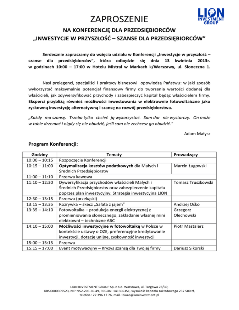 ZAPROSZENIE NA KONFERENCJĘ DLA PRZEDSIĘBIORCÓW „INWESTYCJE W PRZYSZŁOŚĆ – SZANSE DLA PRZEDSIĘBIORCÓW” Serdecznie zapraszamy do wzięcia udziału w Konferencji „Inwestycje w przyszłość – szanse dla przedsiębiorców”, która odbędzie się dnia 13 kwietnia 2013r. w godzinach 10:00 – 17:00 w Hotelu Mistral w Markach k/Warszawy, ul. Słoneczna 1. Nasi prelegenci, specjaliści i praktycy biznesowi opowiedzą Państwu: w jaki sposób wykorzystać maksymalnie potencjał finansowy firmy do tworzenia wartości dodanej dla właścicieli, jak zdywersyfikować przychody i zabezpieczyć kapitał będąc właścicielem firmy. Eksperci przybliżą również możliwości inwestowania w elektrownie fotowoltaiczne jako zyskowną inwestycję alternatywną i szansę na rozwój przedsiębiorstwa. „Każdy ma szansę. Trzeba tylko chcieć ją wykorzystać. Sam dar nie wystarczy. On może w tobie drzemać i nigdy się nie obudzić, jeśli sam nie zechcesz go obudzić.” Adam Małysz Program Konferencji: Godziny 10:00 – 10:15 10:15 – 11:00 11:00 – 11:10 11:10 – 12:30 12:30 – 13:15 13:15 – 13:35 13:35 – 14:10 14:10 – 15:00 15:00 – 15:15 15:15 – 17:00 Tematy Rozpoczęcie Konferencji Optymalizacja kosztów podatkowych dla Małych i Średnich Przedsiębiorstw Przerwa kawowa Dywersyfikacja przychodów właścicieli Małych i Średnich Przedsiębiorstw oraz zabezpieczenie kapitału poprzez plan inwestycyjny. Strategia inwestycyjna LION Przerwa (przekąski) Rozrywka – skecz „Sałata z jajem” Fotowoltaika – produkcja energii elektrycznej z promieniowania słonecznego, zakładanie własnej mini elektrowni – techniczne ABC Możliwości inwestycyjne w fotowoltaikę w Polsce w kontekście ustawy o OZE, preferencyjne kredytowanie inwestycji, dotacje unijne, zyskowność inwestycji Przerwa Event motywacyjny – Kryzys szansą dla Twojej firmy Prowadzący Marcin Ługowski Tomasz Truszkowski Andrzej Ośko Grzegorz Olechowski Piotr Mastalerz Dariusz Sikorski LION INVESTMENT GROUP Sp. z o.o. Warszawa, ul. Targowa 78/39, KRS 0000309523, NIP: 952-205-36-49, REGON: 141506351, wysokość kapitału zakładowego 237 500 zł, telefon.: 22 396 17 76, mail.: [email protected] ZAPROSZENIE NA KONFERENCJĘ DLA PRZEDSIĘBIORCÓW „INWESTYCJE W PRZYSZŁOŚĆ – SZANSE DLA PRZEDSIĘBIORCÓW” Unia Europejska przyjęła tzw. „Pakiet klimatyczny”, który zobowiązuje państwa członkowskie do zwiększania udziału energii ze źródeł odnawialnych. Rząd Polski w dokumencie „Polityka energetyczna Polski do 2030r.” zobowiązał się do udziału energii ze źródeł odnawialnych do 15% w 2015r. i 20% w 2030r. Projekt nowej ustawy o odnawialnych źródłach energii OZE wprowadzi rewolucyjne zmiany w systemie wsparcia dla tworzonych elektrowni fotowoltaicznych dla których proponowane wsparcie wynosi do 1,30 zł/1kWh. Elektrownie fotowoltaiczne będą miały również zapewniony skup wyprodukowanej energii elektrycznej. System wsparcia obowiązywał będzie przez 15 lat. Dodatkowo Bank Ochrony Środowiska S.A. przygotował dla inwestorów preferencyjne kredyty na inwestycje fotowoltaiczne, możliwe będzie również wsparcie inwestycji z funduszy unijnych. Produkcja energii elektrycznej poprzez elektrownie fotowoltaiczne uznawana jest obecnie przez analityków za jedną z najlepszych inwestycji alternatywnych. Perspektywy rozwoju tego rynku związane są z koniecznością dywersyfikacji produkcji energii, oraz zmniejszającymi się złożami surowców. Shell opublikował raport, w którym oszacowano, że do połowy lat 60. tego wieku fotowoltaika może stać się największym źródłem energii na Świecie. Trend „fotowoltaiczny” można zaobserwować w inwestycjach najbogatszych ludzi na Świecie: MidAmerican Energy Holdings, należący do Warrena Buffetta zdecydował się wydać 2,5 miliarda dolarów na budowę dwóch elektrowni słonecznych w Kalifornii, które będą największymi na świecie przedsięwzięciami fotowoltaicznymi. Prelegenci: 1) Marcin Ługowski – Prezes Zarządu Lion Investment Group Sp. z o.o., specjalista w zakresie zarządzania finansami. W latach 2003 – 2008 zarządzał strukturami sprzedaży w grupie kapitałowej POLPAGER (IT Polpager S.A., SFERIA S.A.) W latach 2009 – 2011 pracował na stanowisku Dyrektora Sprzedaży Sieci Własnej PKO BP BANKOWY PTE S.A., gdzie był odpowiedzialny za rozwój i zarządzanie sprzedażą, w tym czasie Sieć Własna PKO BP BANKOWY OFE zanotowała ponad 7 krotny wzrost sprzedaży. 2) Tomasz Truszkowski – Ekspert ds. inwestycji, praktyk na rynkach inwestycyjnych od 2002r., wykładowca w Szkole Inwestowania. W latach 1998 – 2005 pracował w Narodowym Banku Polski, gdzie odpowiadał za analizy ekonomiczno – statystyczne i opracowania dotyczące sektora finansowego na potrzeby Rady Polityki Pieniężnej i Zarządu NBP. Od 2008r. prowadzi własną działalność gospodarczą współpracując z firmami inwestycyjnymi, prowadząc w całym kraju szkolenia z zakresu inwestowania i zarządzania finansami. LION INVESTMENT GROUP Sp. z o.o. Warszawa, ul. Targowa 78/39, KRS 0000309523, NIP: 952-205-36-49, REGON: 141506351, wysokość kapitału zakładowego 237 500 zł, telefon.: 22 396 17 76, mail.: [email protected] ZAPROSZENIE NA KONFERENCJĘ DLA PRZEDSIĘBIORCÓW „INWESTYCJE W PRZYSZŁOŚĆ – SZANSE DLA PRZEDSIĘBIORCÓW” 3) Andrzej Ośko – Kierownik ds. Klienta Biznesowego Lion Investment Group Sp. z o.o. Od początku swojej kariery zawodowej związany ze sprzedażą i obsługą klienta. Perfekcjonista, w tym co robi jakość stawia zawsze na pierwszym miejscu. Zaangażowany ojciec dwóch synów. Posiadacz nieskrępowanej wyobraźni, która ujście znajduje w twórczości kabaretowej, aktor teatrów offowych, twórca wielu skeczów. 4) Grzegorz Olechowski – Project Manager w Xdisc S.A. (polski producent paneli fotowoltaicznych), absolwent Automatyki i Robotyki na Politechnice Warszawskiej, projektant systemów,