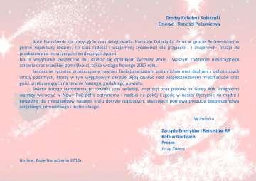 Drodzy Koledzy i Koleżanki Emeryci i Renciści Pożarnictwa Boże Narodzenie to tradycyjnie czas świętowania Narodzin Dzieciątka Jezus w grocie Betlejemskiej w gronie najbliższej rodziny. To czas radości i wzajemnej życzliwości dla przyjaciół i znajomych- okazja do przekazywania im szczerych i serdecznych życzeo. Na te wyjątkowe świąteczne dni, dzieląc się opłatkiem Życzymy Wam i Waszym rodzinom nieustającego zdrowia oraz wszelkiej pomyślności, także w ciągu Nowego 2017 roku. Serdeczne życzenia przekazujemy również funkcjonariuszom pożarnictwa oraz druhom z ochotniczych straży pożarnych, którzy w tym wyjątkowym okresie będą czuwad nad bezpieczeostwem mieszkaoców oraz gości przebywających na terenie Naszego, gorlickiego powiatu. Święta Bożego Narodzenia to również czas refleksji, inspiracji oraz planów na Nowy Rok. Pragniemy wszyscy wkroczyd w Nowy Rok pełni optymizmu i nadziei na pokój i zgodę w naszej Ojczyźnie na mądre i korzystne dla mieszkaoców naszego kraju decyzje rządzących, skutkujące poprawą poczucia bezpieczeostwa socjalnego, zdrowotnego i materialnego. W imieniu Zarządu Emerytów i Rencistów RP Koła w Gorlicach Prezes Jerzy Świerz Gorlice, Boże Narodzenie 2016r.
