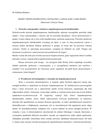 Dr Elżbieta Bednarz OSOBY NIEPEŁNOSPRAWNE UMYSŁOWO A DZIAŁANIE ŁASKI BOŻEJ Zbawienie i Chrzest Wiary 1. Potrzeby emocjonalne i duchowe niepełnosprawnych intelektualnie Dziecko/osoba dorosła niepełnosprawna intelektualnie ujawnia szczególnie potrzebę stałej opieki i więzi emocjonalnej z innymi, jak też potrzebę akceptacji i bycia dostrzeżonym w grupie. Często zdarza się u tych osób nieadekwatna, zaniżona samoocena. Potrzeby społeczne niepełnosprawnych intelektualnie wyrażają się także w tym, że chcą przebywać razem z innymi, pełnić określone funkcje społeczne w grupie, co może dać im poczucie własnej wartości. Osoby te ujawniają przywiązanie, sympatię do bliskich im osób. Pragną one doznawać życzliwości i mieć poczucie przynależności do kogoś. Bardzo ważne dla nich jest również poczucie bezpieczeństwa, gdyż zagrożenie tłumi wszelkie potrzeby wyższe i uniemożliwia jakiekolwiek poznawanie. Biorąc powyższe pod uwagę - czy przyjęcie łaski Bożej, która zaspokaja wszystkie ludzkie potrzeby społeczne i emocjonalne, a w szczególności duchowe jest możliwe i zasadne? Czy przynależność do Chrystusa może zaspokoić ich głód bycia dostrzeżonym i związanym z kimś drugim? 2. Wrażliwość chrześcijańska w stosunku do niepełnosprawnych Wraz z rozwojem chrześcijaństwa, w krajach, gdzie Kościół odgrywał ważną rolę, nastąpił przełom w spojrzeniu na dziecko niepełnosprawne. W średniowieczu poszczególne klasy i stany troszczyły się o zapewnienie opieki swoim dzieciom, organizując dla nich odpowiednie szkoły i instytucje, wyręczając rodzinę w wykonywaniu przez nią swych funkcji opiekuńczo-wychowawczych. W tragicznej sytuacji były dzieci niepełnosprawne intelektualnie, kalekie, chore. Silnie zakorzenione wówczas przekonanie, że kalectwo, choroba lub upośledzenie są karami Bożymi sprawiało, że ludzi upośledzonych umysłowo identyfikowano z obłąkanymi, uznawano ich za nawiedzonych lub opętanych przez złego ducha. Po prześladowaniach, zabijaniu ich, a nawet paleniu na stosie nastąpił przełom. W związku z tym, iż chrześcijaństwo nawoływało do miłości bliźniego i wiązało zbawienie z wymogiem spełniania dobrych uczynków zaczęły się organizować zręby opieki społecznej. Zakładano przytułki, schroniska, które zostały nazwane zakładami charytatywnymi. Do nich w miarę czasu zaczęto również przyjmować upośledzonych umysłowo i chorych psychicznie. 1 Trzymano się jednak w tym zakresie podstawowej tezy, mianowicie, że osobom tym nie należy dawać więcej, aniżeli dał im sam Bóg1. Humanistyczne idee odrodzenia aktywizowały działania opiekuńcze, przyczyniając się przede wszystkim do poszerzania i intensyfikowania tego rodzaju czynności. Pod wpływem tych inspiracji ideowych i intelektualnych następowały stopniowo od XVI wieku pewne pozytywne zmiany w dziedzinie opieki nad dzieckiem upośledzonym. Wiele miejsca poświęcono problematyce poszanowania ludzkiej godności, w tym także potrzeb dziecka upośledzonego. Ogromną zasługę w zakładaniu przytułków dla upośledzonych mieli Bracia Miłosierdzia tzw. bonifratrzy. Założycielem tego zakonu był św. Jan Boży, który głosząc miłosierdzie dla psychicznie chorych i upośledzonych, sam został uznany za umysłowo chorego i wtrącony do zakładu dla obłąkanych w Grenadzie2. W państwach, które przyjęły protestantyzm, sprawa opieki nad dzieckiem rozwiązywana była przez związki religijne, stowarzyszenia charytatywne, a także osoby prywatne, pod nadrzędnym nadzorem i kontrolą państwa. Rozwój instytucji szpitalnych dla dzieci i młodzieży osieroconej i upośledzonej następował w Niemczech, Szwecji, Niderlandach i niektórych kantonach Szwajcarii3. W każdym okresie rodzącej się pomocy niepełnosprawnym swój udział miały osoby, dla których wartości chrześcijańskie stanowiły podstawę ich działań. Dziś troska o chorych i niepełnosprawnych należy do zadań Kościoła, który w wypełnieniu swojego obowiązku wychowawczego, wykorzystuje odpowiednie środki i pomoce. Wraz z powrotem katechezy do szkół, objęte nauczaniem religii zostały także dzieci z różnymi niepełnosprawnościami. Znajomość historii budzenia się opieki nad niepełnosprawnymi ma za zadanie włączenie się w duszpasterską troskę o każde niepełnosprawne dziecko, zrozumienie jego potrzeb. Powszechnym staje się stwierdzenie, iż ludziom niepełnosprawnym powinna przysługiwać taka sama godność osobista i duchowa jak pozostałym pełnosprawnym członkom społeczeństwa. Stwierdzenie powyższe wydaje się z perspektywy dzisiejszej uzasadnione. Niemniej osiągnięcie takiego stanu świadomości, jak wynika z powyższych rozważań, było związane z wieloletnią ewolucją poglądów. 1 M. Balcerek, Rozwój wychowania i kształcenia dzieci upośledzonych umysłowo, Warszawa 1981, Wydawnictwo Naukowe PWN, s. 18. 2 Tamże, s. 21. 3 Tamże, s. 10. 2 Niech myśl ks. W. Korniłowicza przyświeca dziś w kontaktach z niepełnosprawnymi: To jest właśnie tajemnica świętych, że świętość ich przejawia się przede wszystkim w stosunku do ludzi4. 3. Czym jest łaska? Rozważając zagadnienie łaski należy wprowadzić etymologię tego słowa. W polskim przekładzie greckie charis odnosi się do łaski, uprzejmości, życzliwości, przychylności5. W Nowym Testamencie łaska oznacza w istocie coś darowanego, nieodpłatnego. Słowa dorean (darmo) i charis (łaska) są wg Rz 3,24 synonimami6. Dorean odpowiada hebrajskiemu chinnam, które wywodzi się z tego samego rdzenia, co hebrajski odpowiednik charis – chen (życzliwość, przychylność). Poniżej przedstawionych zostanie kilka przykładów ze Starego Testamentu, gdzie zastosowane jest słowo łaska w szerokim znaczeniu. Noe zyskał życzliwość Pana (Rdz 6,8)7; Jakub starał się zjednać przychylność Ezawa (Rdz 32,5-6). Czynem łaski było okazywanie