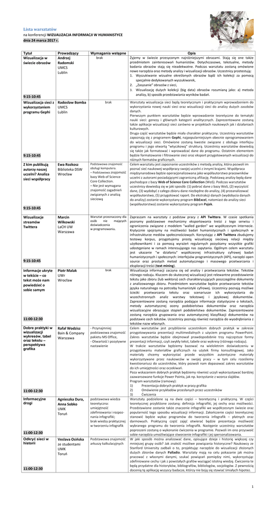 Lista warsztatów na konferencji WIZUALIZACJA INFORMACJI W HUMANISTYCE dnia 24 marca 2017 r. Tytuł Wizualizacja w świecie obrazów Prowadzący Andrzej Radomski UMCS Lublin 9:15-10:45 Wizualizacja sieci z Radosław Bomba wykorzystaniem UMCS programu Gephi Lublin Wymagania wstępne brak Opis Żyjemy w świecie przesyconym najróżniejszymi obrazami. Stają się one także przedmiotem zainteresowań humanistów. Dotychczasowe, tekstualne, metody badania obrazów stają się nieadekwatne. Podczas warsztatu zostaną omówione nowe narzędzia oraz metody analizy i wizualizacji obrazów. Uczestnicy przetestują: 1. Wyszukiwanie wizualne określonych obrazów bądź ich kolekcji za pomocą specjalnie dedykowanych wyszukiwarek, 2. „Zasysanie” obrazów z sieci, 3. Wizualizację dużych kolekcji (big data) obrazów rozumianą jako: a) metoda analizy, b) sposób przedstawiania wyników badań. brak Warsztaty wizualizacja sieci będą teoretycznym i praktycznym wprowadzeniem do wykorzystania nowej nauki sieci oraz wizualizacji sieci do analizy dużych zasobów danych. Pierwszym punktem warsztatów będzie wprowadzenie teoretyczne do tematyki nauki sieci: genezy i głównych kategorii analitycznych. Zaprezentowane zostaną także aplikacje wizualizacji sieci zarówno w projektach naukowych jak i działaniach kulturowych. Druga część warsztatów będzie miała charakter praktyczny. Uczestnicy warsztatów zapoznają się z programem Gephi, najpopularniejszym obecnie oprogramowaniem do wizualizacji sieci. Omówione zostaną kwestie związane z obsługa interfejsu programu i jego otwartą “wtyczkową” strukturą. Uczestnicy warsztatów dowiedzą się także jak formatować i wprowadzać dane do programu. Ostatnim elementem będzie formatowanie i filtrowanie sieci oraz eksport przygotowanych wizualizacji do różnych formatów graficznych. Celem warsztatu jest zapoznanie uczestników z metodą analizy, która pozwoli im poznać sieć naukowej współpracy swojej uczelni z innymi krajami. Współpraca międzynarodowa będzie operacjonalizowana jako współautorstwo pracowników uczelni z autorami posiadającymi zagraniczną afiliację. Podstawą analizy będą dane pochodzące z bazy Web of Science Core Collection (WoS). Podczas warsztatów uczestnicy dowiedzą się w jaki sposób: (1) pobrać dane z bazy WoS, (2) wyczyścić dane, (3) wydobyć z całego zbioru dane niezbędne do analizy, (4) przeanalizować współautorstwo, (5) przygotować raport. Do ekstrakcji danych (wydobycia danych do analizy) zostanie wykorzystany program BibExcel, natomiast do analizy sieci (współautorstwa) zostanie wykorzystany program Pajek. 9:15-10:45 Z kim publikują autorzy naszej uczelni? Analiza sieci współpracy Ewa Rozkosz Biblioteka DSW Wrocław Podstawowa znajomość obsługi komputera. – Podstawowa znajomość Marcin Wilkowski LaCH UW Warszawa Warsztat przeznaczony dla osób nie mających doświadczenia w programowaniu. bazy Web of Science Core Collection. – Nie jest wymagana znajomość zagadnień związanych z analizą sieciową 9:15-10:45 Wizualizacje streamów Twittera 9:15-10:45 Informacje ukryte w tekście – co tekst może nam powiedzieć o sobie samym Piotr Malak UWr Wrocław brak 11:00-12:30 Dobre praktyki w wizualizacji wykresów, tabel oraz tekstu – perspektywa grafika Rafał Wodzisz Bain & Company Warszawa - Przynajmniej podstawowa znajomość pakietu MS Office, - Otwartość i pozytywne nastawienie Agnieszka Dura, Anna Sobko UMK Toruń podstawowa wiedza teoretyczna: umiejętność zdefiniowania i rozpoznania infografiki; brak wiedzy praktycznej w tworzeniu infografik Veslava Osińska ze studentami UMK Toruń Podstawowa znajomość arkuszy kalkulacyjnych 11:00-12:30 Informacyjne drogi 11:00-12:30 Odkryć sieci w historii 11:00-12:30 Zapraszam na warsztaty z podstaw pracy z API Twittera. W czasie spotkania poznamy podstawowe mechanizmy eksportowania treści z tego serwisu i ograniczenia związane z modelem "walled garden" we współczesnym internecie. Krytycznie spojrzymy na możliwości badań humanistycznych i społecznych w infrastrukturze mediów społecznościowych. Korzystając z API Twittera zbudujemy testowy korpus, przygotujemy prostą wizualizację sieciową relacji między użytkownikami i za pomocą wyrażeń regularnych pozyskamy wszystkie grafiki udostępniane w ramach interesującego nas zapytania. Ogólnym celem warsztatu jest ukazanie "w działaniu" współczesnej infrastruktury cyfrowej badań humanistycznych i społecznych: interfejsów programistycznych (API), narzędzi open source oraz prostych metod automatycznego i masowego przetwarzania i eksploracji treści (text mining). Wizualizacja informacji zaczyna się od analizy i przetwarzania tekstów. Tekstów różnego rodzaju. Kluczem do skutecznej wizualizacji jest relewantne przedstawienie tekstu jako zbioru (lub wektora) cech charakteryzujących poszczególne dokumenty z analizowanego zbioru. Przedmiotem warsztatów będzie przetwarzanie tekstów języka naturalnego na potrzeby humanistyki cyfrowej. Uczestnicy poznają możliwe ścieżki przetwarzania tekstu oraz scenariusze ich wykorzystania do wszechstronnych analiz warstwy tekstowej i językowej dokumentów. Zaprezentowane zostaną narzędzia podające informacje statystyczne o tekstach, metody automatycznej oceny podobieństwa dokumentów oraz narzędzia wizualizacyjne obrazujące stopień podobieństwa dokumentów. Zaprezentowane zostaną narzędzia grupowania oraz automatycznej klasyfikacji dokumentów na podstawie cech tekstów. Uczestnicy poznają również narzędzia do wyodrębniania z tekstów nazw własnych. Celem warsztatów jest przybliżenie uczestnikom dobrych praktyk w zakresie przygotowywania prezentacji multimedialnych z użyciem programu PowerPoint. Zakres warsztatów będzie obejmował prawdopodobnie trzy najczęstsze formy prezentacji informacji, czyli zwykły tekst, tabele oraz wykresy (różnego rodzaju). W trakcie warsztatów będziemy baz