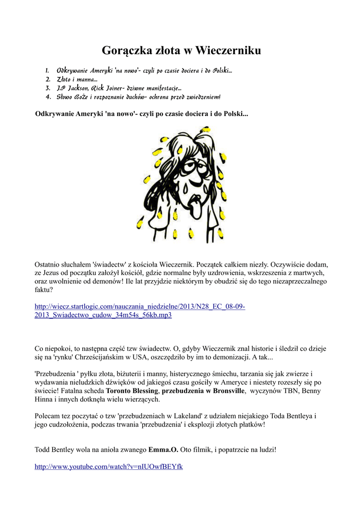 Gorączka złota w Wieczerniku 1. 2. 3. 4. Odkrywanie Ameryki 'na nowo'- czyli po czasie dociera i do Polski... Złoto i manna... J.P Jackson, Rick Joiner- dziwne manifestacje... Słowo Boże i rozpoznanie duchów- ochrona przed zwiedzeniem! Odkrywanie Ameryki 'na nowo'- czyli po czasie dociera i do Polski... Ostatnio słuchałem 'świadectw' z kościoła Wieczernik. Początek całkiem niezły. Oczywiście dodam, ze Jezus od początku założył kościół, gdzie normalne były uzdrowienia, wskrzeszenia z martwych, oraz uwolnienie od demonów! Ile lat przyjdzie niektórym by obudzić się do tego niezaprzeczalnego faktu? http://wiecz.startlogic.com/nauczania_niedzielne/2013/N28_EC_08-092013_Swiadectwo_cudow_34m54s_56kb.mp3 Co niepokoi, to następna część tzw świadectw. O, gdyby Wieczernik znal historie i śledził co dzieje się na 'rynku' Chrześcijańskim w USA, oszczędziło by im to demonizacji. A tak... 'Przebudzenia ' pyłku złota, biżuterii i manny, histerycznego śmiechu, tarzania się jak zwierze i wydawania nieludzkich dźwięków od jakiegoś czasu gościły w Ameryce i niestety rozeszły się po świecie! Fatalna scheda Toronto Blessing, przebudzenia w Bronsville, wyczynów TBN, Benny Hinna i innych dotknęła wielu wierzących. Polecam tez poczytać o tzw 'przebudzeniach w Lakeland' z udziałem niejakiego Toda Bentleya i jego cudzołożenia, podczas trwania 'przebudzenia' i eksplozji złotych płatków! Todd Bentley wola na anioła zwanego Emma.O. Oto filmik, i popatrzcie na ludzi! http://www.youtube.com/watch?v=nIUOwfBEYfk http://www.britannica.com/EBchecked/topic/185925/Emma-o Złoto i manna... Zadziwia mnie jedna rzecz. Ludzie nie maja Chrześcijaństwa typu Mark 16, jednak w poszukiwaniach z naczelna doktryna :”nie osadzaj” dają się złapać na trik diabelski. Gdzie w NT występuje manna? Czy Jezus nakazał aby spadła manna, aby uzdrowić kogokolwiek? Po pierwszeczy manna była kiedykolwiek używana do … uzdrawiania? Te odpowiedzi mogą wielu otworzyć oczy...Brak zrozumienia Słowa i mocy Ducha, prawdziwych darów, może prowadzić ludzi do szukania od … wroga. Iz 53 pisze o poniesieniu chorób na krzyż. Czas przeszły. Nie czytamy, ze jakby to nie działało, bądź wyrzucenie demonów [pytanie: czy Wieczernik wieży, ze Chrześcijanie maja demony?], to teraz Bóg da mannę z nieba, aby uleczyć. Pytanie następne: skąd wiecie jak manna wyglądała? To tak jak katolicy dają się nabrać na obrazki tzw Jezusa. Największy polew ma oczywiście diabeł z obu grup. Jezus chodził i uzdrawiał mocą Ducha i Słowem, uwolnieniem od demonów, jednak dzisiejsi 'Charyzmatycy' nie robią pierwszego a maja 'inne drogi'. To niebezpieczna pozycja. Wśród niektórych osób z Wieczernika działa coś innego niż Duch Święty. Na nagraniu, osoby chwalą się 'cudami'- złoto na rekach[czemu nie w kieszeni?], prysznic ze złota itd. Wspominana manna która...leczy. To fałszywe manifestacje. Nie,ze ktoś im zazdrości 'złota'[pewnie fałszywe] Osoba mówiąca na nagraniu zaiste 'odkrywa Amerykę'! Po pierwsze- to przyszło z odstępczych kościołów w Ameryce z dewiza: choćby diabeł, nie osadzaj. Po drugie, przez kilkaset lat Biblia mówi: demony wyganiajcie, chorych uzdrawiajcie [nie lekami ani manna] ale mocą Ducha! Gdzie ona się podziała? Dla osób chcących poznać prawdę i znających język angielski polecam posłuchać demona, który mówi ustami brata, który uczęszczał w przebudzeniach w Brownsville: http://www.blogtalkradio.com/watchmenradio/2010/12/16/battling-leviathan Z brata mówi demon, zapytany skąd się tam wziął odpowiada: Brooownsville...fałszywy ogień! Możesz się śmiać, ale to nie jest zabawnie aby iść na 'przebudzenie' i zamiast znaleźć Jezusa, dostać demona …. Służba uwolnienia i walki duchowej obnaża te warownie. A ponieważ 95% kościołów Zielonoświątkowych i Charyzmatycznych nie robią tego, diabeł tylko korzysta... Osoba mówiąca na kazaniu wspomina Randy Clarka. J.P Jackson, Rick Joiner i inni oraz fałszywe i dziwne manifestacje... Rick Joiner, dla wielu wzór współczesnego proroka, pragnął pomoc Todowi Bentleyowi, gdy ten miał igraszki podczas jego 'przebudzeń' z pewna blondyna...Bentley miał żonę i dzieci, jednak Joiner pobłogosławił jego blondynkę i dziś, Bentley porzucił 'stara' a ma nowa. Takie rady, świadczą o Wizjonerze, ze to fałszywy doradca i nie prorok Jezusa. Joiner musiał wyznawać te same doktryny co Wieczernik! A mianowicie- Duch działa za każdym razem inaczej! Jezus mówił o małżeństwie na cale życie bądź życie samym, a tu Joiner błogosławi jawnego cudzołożnika. Czy niektórzy w Kościele Zielonoświątkowym i u Charyzmatyków tez 'tak są prowadzeni'? Wbrew Biblii? Oto boża zona i dzieci, których Bentley wykopał...1 Shonna Bentley podczas 'przebudzenia' :[a mąż dokazywał z blondyna za parawanem!] http://www.youtube.com/watch?v=YXgriYwJAxY Ludzie gromią go z tłumu: http://www.youtube.com/watch?v=y_tRwgItUFo 1 http://picklinginhispresence.files.wordpress.com/2008/08/todd-and-shonnah-bentley1.jpg Demoniczne manifestacje: http://www.youtube.com/watch?v=CpbUtdLunRc Nowa 'zona' Bentleya i jej trzesawka oraz 'objawienia': http://www.youtube.com/watch?v=XjMYqDHbYtg Rick Joiner i jego Morning Star Ministry to fałsz.! J.P Jackson napisał jakiś czas temu „Niepotrzebne ofiary wojny” tym samym odsuwając wielu Zielonoświątkowców i Charyzmatyków od prawdziwej walki duchowej ze zwierzchnościami i uwolnienia od demonów! Ci 'prorocy ' i 'znawcy' nie reprezentują Jezusa ani Jego Słowa. Ich 'owoce' to wprowadzanie strachu odnośnie Mk 16, szerzenie niemoralności i bycie 'ponad Biblia'! Precz z nimi z Chrześcijaństwa! Niektóre cytaty zaczerpnięte ze 'świadectw' z Wieczernika: „Spojrzałam na rękę a ona była w zlocie” „Pyl złota...na talerzyku” „Goście ze STANOW na wiatrołapie...Mamy złoto, mannę. Ktokolwiek ja włożył do ust 