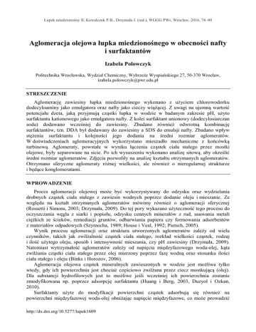 Łupek miedzionośny II, Kowalczuk P.B., Drzymała J. (red.), WGGG PWr, Wrocław, 2016, 74‒80 Aglomeracja olejowa łupka miedzionośnego w obecności nafty i surfaktantów Izabela Polowczyk Politechnika Wrocławska, Wydział Chemiczny, Wybrzeże Wyspiańskiego 27, 50-370 Wrocław, [email protected] STRESZCZENIE Aglomerację zawiesiny łupka miedzionośnego wykonano z użyciem chlorowodorku dodecyloaminy jako emulgatora oraz nafty jako cieczy wiążącej. Z uwagi na ujemną wartość potencjału dzeta, jaką przyjmują cząstki łupka w wodzie w badanym zakresie pH, użyto surfaktantu kationowego jako emulgatora nafty. Z kolei surfaktant anionowy (dodecylosiarczan sodu) dodawano wcześniej do zawiesiny. Zbadano również odwrotną kombinację surfaktantów, tzn. DDA był dodawany do zawiesiny a SDS do emulsji nafty. Zbadano wpływ stężenia surfaktantu i kolejności jego dodania na średni rozmiar aglomeratów. W doświadczeniach aglomeracyjnych wykorzystano mieszadło mechaniczne z końcówką turbinową. Aglomeraty, powstałe w wyniku łączenia cząstek ciała stałego przez mostki olejowe, były separowane na sicie. Po ich wysuszeniu wykonano analizę sitową, aby określić średni rozmiar aglomeratów. Zdjęcia pozwoliły na analizę kształtu otrzymanych aglomeratów. Otrzymano sferyczne aglomeraty różnej wielkości, ale również o nieregularnej strukturze i będące konglomeratami. WPROWADZENIE Proces aglomeracji olejowej może być wykorzystywany do odzysku oraz wydzielania drobnych cząstek ciała stałego z zawiesin wodnych poprzez dodanie oleju i mieszanie. Ze względu na kształt otrzymanych aglomeratów mówimy również o aglomeracji sferycznej (Rossetti i Simons, 2003; Drzymała, 2009). Do tej pory wykazano użyteczność tego procesu do oczyszczania węgla z siarki i popiołu, odzysku cennych minerałów z rud, usuwania metali ciężkich ze ścieków, remediacji gruntów, odbarwiania papieru czy formowania adsorbentów z materiałów odpadowych (Szymocha, 1989; House i Veal, 1992; Pietsch, 2005). Wynik procesu aglomeracji oraz struktura utworzonych aglomeratów zależy od wielu czynników, takich jak zwilżalność cząstek ciała stałego, rozkład wielkości cząstek, rodzaj i ilość użytego oleju, sposób i intensywność mieszania, czy pH zawiesiny (Drzymała, 2009). Natomiast wytrzymałość aglomeratów zależy od napięcia międzyfazowego woda-olej, kąta zwilżania cząstki ciała stałego przez olej mierzony poprzez fazę wodną oraz stosunku ilości ciała stałego i oleju (Binks i Horozov, 2006). Aglomeracja olejowa cząstek mineralnych zawieszonych w wodzie jest możliwa tylko wtedy, gdy ich powierzchnia jest chociaż częściowo zwilżana przez ciecz mostkującą (olej). Dla substancji hydrofilowych jest to możliwe jeśli wcześniej ich powierzchnia zostanie zmodyfikowana np. poprzez adsorpcję surfaktantu (Huang i Berg, 2003, Duzyol i Ozkan, 2010). Surfaktanty użyte do modyfikacji powierzchni cząstek adsorbują się również na powierzchni międzyfazowej woda-olej obniżając napięcie międzyfazowe, co może prowadzić http://dx.doi.org/10.5277/lupek1609 Aglomeracja olejowa łupka miedzionośnego w obecności nafty i surfaktantów 75 do osłabienia mostków cieczy wiążącej i rozbicia aglomeratów w trakcie mieszania lub wręcz uniemożliwić zajście procesu aglomeracji (Laskowski, 1992; Cebeci i Sönmez, 2004). W niektórych aplikacjach stosuje się mieszaniny surfaktantów, jak np. we flotacji (Hosseini i Forssberg, 2007) czy aglomeracji (Bastrzyk i in., 2011). Mieszanina surfaktantów może nie tylko tworzyć mieszane filmy na granicach faz, jest również możliwe, że powstają nierozpuszczalne kompleksy (Helbig i in., 1998). MATERIAŁY I METODYKA BADAŃ W badaniach użyto przesianej na mokro a następnie wysuszonej frakcji -40 µm łupka miedzionośnego z rejonu LGOM. Wyznaczona metodą dyfrakcji laserowej mediana średnicy cząstek (d50) wynosiła 16,5 µm a pierwszy (d10) i dziewiąty decyl (d90), odpowiednio 3,2 i 45,5µm (Polowczyk, 2016b). Użyto surfaktantu kationowego (chlorowodorek dodecyloaminy, DDA, Alfa Aesar) oraz anionowego (dodecylosiarczan sodu, SDS, Alfa Aesar), charakteryzujących się taką samą długością łańcucha węglowodorowego (C12). Jako cieczy wiążącej użyto nafty oświetleniowej (Synpeco). Proces aglomeracji prowadzono z użyciem mieszadła mechanicznego IKA Yellow line OST basic (IKA) z końcówką 3-łopatkową turbinową o średnicy 50 mm, generującą przepływ osiowy (rys. 1). Rysunek 1. Zdjęcie końcówki mieszającej wykorzystanej w badaniach Zawiesiny łupka do aglomeracji przygotowywano w następujący sposób: odważano do szklanego pojemnika 2 g łupka i zalewano go 100 cm3 wody dejonizowanej lub roztworu surfaktantu anionowego bądź kationowego (w zakresie stężeń surfaktantu 5-500 ppm). Mieszano przez chwilę a następnie odstawiano do następnego dnia, w celu zaadsorbowania surfaktantu. Emulsję nafty w wodzie dejonizowanej lub roztworze surfaktantu (25 cm3) przygotowywano na homogenizatorze ultradźwiękowym Sonopuls HD 2070 (Bandelin) z mikrokońcówką MS73 na 60% mocy przez 1 minutę. Do mieszającej się zawiesiny wlewano wcześniej przygotowywaną emulsję nafty z surfaktantem i kontynuowano proces mieszania. Otrzymane aglomeraty odsączano na sicie, suszono w temp. 40% a następnie przez 48 h trzymano w eksykatorze w oparach nafty, aby zapobiec rozpadowi aglomeratów podczas analizy sitowej. Na podstawie wyników analizy sitowej wyznaczono następnie średni rozmiar aglomeratów. Wstępne badania aglomeracyjne pozwoliły na określenie czasu (10 minut), intensywności mieszania (1000 rpm) oraz optymalnej ilości nafty (0,8 cm3). Również ilość 1000 ppm roztworu DDA/SDS została ustalona na 25 cm3. Potencjał dzeta kropel nafty w roztworze surfaktantu kationowego lub anionowego zmierzono z użyciem aparatu Zetasizer 2000 (Malvern). Niewielką ilość nafty dodawano do 10 ml r