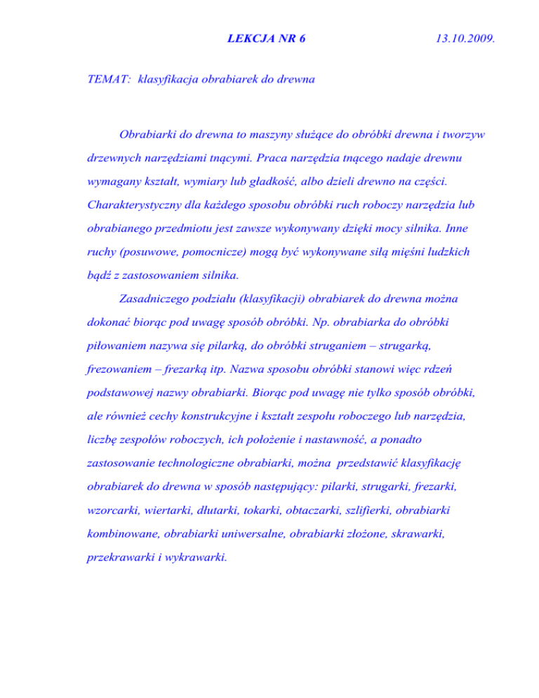 LEKCJA NR 6 13.10.2009. TEMAT: klasyfikacja obrabiarek do drewna Obrabiarki do drewna to maszyny służące do obróbki drewna i tworzyw drzewnych narzędziami tnącymi. Praca narzędzia tnącego nadaje drewnu wymagany kształt, wymiary lub gładkość, albo dzieli drewno na części. Charakterystyczny dla każdego sposobu obróbki ruch roboczy narzędzia lub obrabianego przedmiotu jest zawsze wykonywany dzięki mocy silnika. Inne ruchy (posuwowe, pomocnicze) mogą być wykonywane siłą mięśni ludzkich bądź z zastosowaniem silnika. Zasadniczego podziału (klasyfikacji) obrabiarek do drewna można dokonać biorąc pod uwagę sposób obróbki. Np. obrabiarka do obróbki piłowaniem nazywa się pilarką, do obróbki struganiem – strugarką, frezowaniem – frezarką itp. Nazwa sposobu obróbki stanowi więc rdzeń podstawowej nazwy obrabiarki. Biorąc pod uwagę nie tylko sposób obróbki, ale również cechy konstrukcyjne i kształt zespołu roboczego lub narzędzia, liczbę zespołów roboczych, ich położenie i nastawność, a ponadto zastosowanie technologiczne obrabiarki, można przedstawić klasyfikację obrabiarek do drewna w sposób następujący: pilarki, strugarki, frezarki, wzorcarki, wiertarki, dłutarki, tokarki, obtaczarki, szlifierki, obrabiarki kombinowane, obrabiarki uniwersalne, obrabiarki złożone, skrawarki, przekrawarki i wykrawarki. LEKCJA NR 7 20.10.2009. TEMAT: Zespoły i główne części obrabiarek Każda obrabiarka składa się z wielu części. Części te – ze względu na ich przeznaczenie, działanie i wzajemne powiązanie – można grupować w zespoły. Najczęściej występującymi częściami i zespołami są: kadłub, zespół roboczy, narzędzie tnące, zespół napędowy, zespół posuwowy, zespół podpierającoprowadzący, zespół dociskowy, zespół zaciskowy, zespół podający i odbierający. KADŁUB (korpus) stanowi szkielet, podstawę obrabiarki. Na kadłubie rozmieszczone są pozostałe zespoły i części. Ze względu na ogólny kształt cały korpus lub jego części mogą mieć postać skrzynki, stojaka, kolumny, płyty lub łoża. Kadłuby są odlewane z żeliwa i staliwa lub spawane albo skręcane śrubami z oddzielnych blach i profilów stalowych. ZESPÓŁ ROBOCZY służy do zamocowania narzędzia (rzadziej – przedmiotu) i do nadania mu ruchu roboczego. Zasadnicza część zespołu roboczego może mieć kształt wału, wrzeciona, tarczy, walca, bębna, ramy. Stosownie do sposobu obróbki części te wykonują ruchy (obrotowy, prostoliniowy lub inny) i w związku z tym są ułożyskowane w łożyskach lub prowadzone w prowadnicach. Zespół roboczy może być mocowany bezpośrednio na kadłubie lub na częściach pośrednich (sanie, wychylne ramię), umożliwiających przesuwanie, obracanie i nastawianie zespołu roboczego.