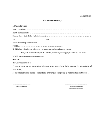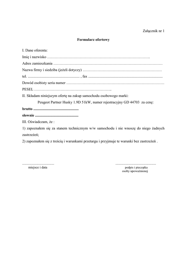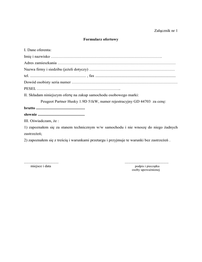 Załącznik nr 1 Formularz ofertowy I. Dane oferenta: Imię i nazwisko ………………………………………………………………………. Adres zamieszkania …………………………………………………………………………… Nazwa firmy i siedziba (jeżeli dotyczy) ……………………………………………………… tel. ....................................................... , fax ............................................................................... Dowód osobisty seria numer …………………………………………………………………… PESEL …………………………………………………….. II. Składam niniejszym ofertę na zakup samochodu osobowego marki: Peugeot Partner Husky 1.9D 51kW, numer rejestracyjny GD 44703 za cenę: brutto ................................................ słownie .............................................. III. Oświadczam, że : 1) zapoznałem się za stanem technicznym w/w samochodu i nie wnoszę do niego żadnych zastrzeżeń; 2) zapoznałem się z treścią i warunkami przetargu i przyjmuje te warunki bez zastrzeżeń . ..................................... miejsce i data ............................................... podpis i pieczątka osoby upoważnionej
