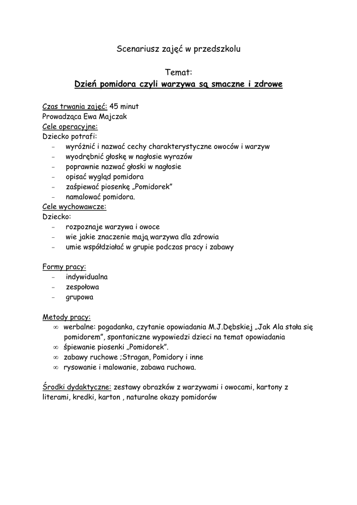 Scenariusz zajęć w przedszkolu Temat: Dzień pomidora czyli warzywa są smaczne i zdrowe Czas trwania zajęć: 45 minut Prowadząca Ewa Majczak Cele operacyjne: Dziecko potrafi: ̶ wyróżnić i nazwać cechy charakterystyczne owoców i warzyw ̶ wyodrębnić głoskę w nagłosie wyrazów ̶ poprawnie nazwać głoski w nagłosie ̶ opisać wygląd pomidora ̶ zaśpiewać piosenkę „Pomidorek” ̶ namalować pomidora. Cele wychowawcze: Dziecko: ̶ rozpoznaje warzywa i owoce ̶ wie jakie znaczenie mają warzywa dla zdrowia ̶ umie współdziałać w grupie podczas pracy i zabawy Formy pracy: ̶ indywidualna ̶ zespołowa ̶ grupowa Metody pracy: • werbalne: pogadanka, czytanie opowiadania M.J.Dębskiej „Jak Ala stała się pomidorem”, spontaniczne wypowiedzi dzieci na temat opowiadania • śpiewanie piosenki „Pomidorek”. • zabawy ruchowe ;Stragan, Pomidory i inne • rysowanie i malowanie, zabawa ruchowa. Środki dydaktyczne: zestawy obrazków z warzywami i owocami, kartony z literami, kredki, karton , naturalne okazy pomidorów PRZEBIEG ZAJĘĆ Zajęcia wprowadzające 1. 2. Powitanie dzieci. Dzieci razem z prowadzącym siadają w kole. Prowadzący dyskretnie przekazuje dziecku siedzącemu z prawej strony następującą informację: Warzywa i owoce są bardzo smaczne i zdrowe. Następnie dzieci kolejno podają sobie tę informację, a ostatnie wstaje i wypowiada zdanie jakie on usłyszał. Należy zaznaczyć, aby dzieci wyraźnie przekazywały dane zdanie. 3. Wspólne śpiewanie piosenki : Pomidorek Wyrósł pomidorek, mały i zielony Pięknie się rozejrzał na obie strony, Tam czerwony goździk, tutaj różę widzi, Więc się zieloności swojej zawstydził. Pomi, pomi, pomidorek Krasnym okrył się kolorem Płaszczyk włożył gładki, nowy Pomi, pomi, pomidorowy. Zajęcia właściwe 1. Pogadanka z dziećmi na temat warzyw i owoców. 2. Zabawa logopedyczna: PAN WARZYWO. Prowadzący opowiada dzieciom historyjkę: Był sobie kiedyś Pan Warzywko, który przyjaźnił się z 7 głoskami: Z, W, K, A, O R, F. Pewnego razu spotkał głoskę Z, która zaprosiła go na niedzielę na herbatę. Pan Warzywko bardzo się ucieszył i obiecał przyjść. Ale kiedy przyszła niedziela Pan Warzywko zapomniał, która głoska zaprosiła go do siebie. Wymieniał wszystkie imiona, ale nie mógł sobie przypomnieć. Przyszedł do dzieci i poprosił, aby mu pomogły. Pan Warzywko wymieniał ich imiona, a dzieci klaskały, gdy wymówił imię głoski, do której miał się udać z wizytą. Po opowiedzeniu tej historyjki prowadzący proponuje dzieciom, by pomogły Panu Warzywko i wówczas dzieci klaszczą, gdy usłyszą głoskę Z. Później prowadzący opowiada dzieciom, że Pan Warzywko został zaproszony przez głoskę W do kina,(tupią) głoskę K do wesołego miasteczka,(cmokają) głoskę A do cyrku,(mlaskają) głoskę O na basen,(rybka) głoskę R w kosmos(parskają) itd. 3. Zabawa ruchowa : Warzywka” 4. „Zgaduj zgadula” Prowadzący dzieli grupę na dwa zespoły. Trzymając karteczki z rysunkami warzyw i owoców (tak, aby nie widziały ich dzieci) opowiada o nich dzieciom. Robi to jednak w taki sposób by nie wymówić nazwy warzywa lub owocu. Na przykład o marchewce mówi tak: jest to warzywo, ma kolor czerwono-pomarańczowy, mama dodaje ją do surówki czy zupy, jest chrupiąca, lubią ją króliki itp. Zadanie zespołów polega na jak najszybszym odgadnięciu o jakie warzywo lub owoc chodzi. Wygrywa ten zespół, który poprawnie odgadnie więcej warzyw i owoców. 5. Zagadki. Prowadzący czyta zagadki, a dzieci podają prawidłowe odpowiedzi. Czerwone na krzaku, latem dojrzewają. Chętnie na kanapkach ludzi je zjadają. (Pomidory) Na ogonie złota głowa. Smaczne pestki w sobie chowa. (dynia) Różowo zakwitło wiosną, Przez lato pięknie urosło. Jesienią w zadzie dojrzało. Rumiane, okrągłe, zapachniało. (jabłko) Każdy z was odgadnie łatwo tę zagadkę, Ma bielutki korzeń i zieloną natkę. (pietruszka) Rośnie w polu, ma żółte kolby. (kukurydza) Najpierw są zielone, granatowe w końcu. Zerwiesz je dopiero, gdy dojrzeją w słońcu. (jagody) Latem w ogrodzie wyrósł zielony, A zimą w beczce leży kiszony. (ogórek) Jaka to głowa duża, czy mała, Z zielonych liści składa się cała. (kapusta, sałata) Skórka fioletowa, miąższ pod nią złoty. Smakuje wybornie, wszyscy wiemy o tym. (śliwka) Latem wysoko do słonka się wznosi i złotem mieni. Jesienią, pełen czarnych ziarenek, chyli głowę do ziemi. (słonecznik) Czerwieni się ze wstydu. Dojrzewa na słonku. Wśród zielonych liści wisi na ogonku. (wiśnia) Z wierzchu czerwona, a w środku biała. Kiedyś ją jadłeś w język cię szczypała. (rzodkiewka) 6. Prowadzący rozkłada na podłodze kartony z literami. Dzieci poruszają się po sali w różny sposób np. jak motylki w podskokach i na palcach. Podczas zabawy prowadzący podaje głośno wyraz. Zadaniem dzieci jest z wyrazu wyodrębnić pierwszą głoskę i stanąć przy kartonie z odpowiednią literą. 7. Zapoznanie dzieci z opowiadaniem M.J.Dębskiej „Jak Ala stała się pomidorem”, (przewodnik str:___ ) Rozmowa z dziećmi na temat przygody Ali. Spontaniczne wypowiedzi dzieci.Prezentacja okazów pomidorów, przeliczanie określanie wielkości, kolru, faktury warzywa. Smakowanie warzywa i soku pomidorowego. Wartości odżywcze... 8. Zabawa ruchowa: Toczenie pomidorów. 9. Malowanie przez dzieci pomidora. Podsumowanie zajęć Wspólne podsumowanie zajęć – dyskusja na temat: Ø Dlaczego należy jeść dużo owoców i warzyw, co zawierają? Wniosek – Warzywa i owoce zawierają witaminy i sole mineralne, które są niezbędne dla zdrowia człowieka. Pożegnanie z dziećmi. Zaśpiewanie jeszcze raz piosenki „Pomidorek”. Opracowała: Ewa Majczak