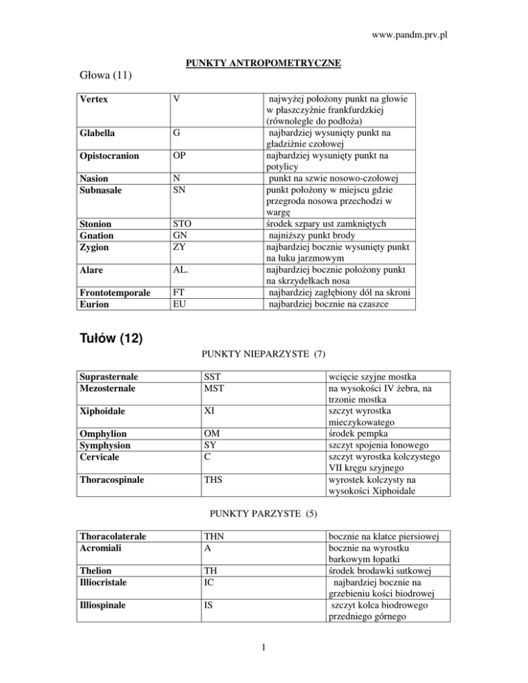 www.pandm.prv.pl PUNKTY ANTROPOMETRYCZNE Głowa (11) Vertex V Glabella G Opistocranion OP Nasion Subnasale N SN Stonion Gnation Zygion STO GN ZY Alare AL. Frontotemporale Eurion FT EU najwyżej położony punkt na głowie w płaszczyźnie frankfurdzkiej (równolegle do podłoża) najbardziej wysunięty punkt na gładziźnie czołowej najbardziej wysunięty punkt na potylicy punkt na szwie nosowo-czołowej punkt położony w miejscu gdzie przegroda nosowa przechodzi w wargę środek szpary ust zamkniętych najniższy punkt brody najbardziej bocznie wysunięty punkt na łuku jarzmowym najbardziej bocznie położony punkt na skrzydełkach nosa najbardziej zagłębiony dól na skroni najbardziej bocznie na czaszce Tułów (12) PUNKTY NIEPARZYSTE (7) Suprasternale Mezosternale SST MST Xiphoidale XI Omphylion Symphysion Cervicale OM SY C Thoracospinale THS wcięcie szyjne mostka na wysokości IV żebra, na trzonie mostka szczyt wyrostka mieczykowatego środek pempka szczyt spojenia łonowego szczyt wyrostka kolczystego VII kręgu szyjnego wyrostek kolczysty na wysokości Xiphoidale PUNKTY PARZYSTE (5) Thoracolaterale Acromiali THN A Thelion Illiocristale TH IC Illiospinale IS bocznie na klatce piersiowej bocznie na wyrostku barkowym łopatki środek brodawki sutkowej najbardziej bocznie na grzebieniu kości biodrowej szczyt kolca biodrowego przedniego górnego 1 www.pandm.prv.pl Kończyna górna (5) Radiale Stylion R STY Dactylion Metacalpare ulnare DA (III) MU Metacalpare radiale MR głowa kości promieniowej szczyt wyrostka rylcowatego kości promieniowej koniec opuszka III palca ręki szerokość ręki ( głowa II kości śródręcza ) szerokość ręki ( głowa V kości śródręcza ) Kończyna dolna (8) Trohanterior TRO Tibiale TI Sphyrion Acropodion Pterion SPH AP PTE Mezotarsale tibiale Mezotarsale fibulare Basis MTT MTF B szczyt krętarza większego kości udowej koniec bliższy kości piszczelowej, przyśrodkowo w stawie kolanowym szczyt kostki przyśrodkowej koniec najdłuższego palca punkt najbardziej wysunięty ju tyłowi kości piętowej głowa I kości śródstopia głowa V kości śródstopia punkt styku stopy z podłożem ANTROPOLOGIA Antropologia – jest to nauka zajmująca się badaniem pochodzenia człowika oraz jego rozwojem. Opisuje różnice międzygatunkowe. Wdł.książki Malinowskiego – J.Czekańskiego „Antropologia jest nauką zajmującą się badaniem człowieka jako biologiczne podłoże zjawisk społecznych oraz badaniem biologicznych skutków tych zjawisk.” Nazwa antropologia pochodzi z języka greckiego i oznacza -„anthropo” = człowiek -„logos” = nauka Arystoteles uważał ze antropologia jest nauką badającą właściwości psychiczne człowieka. Natomiast I.Kant szukał w antropologi rozwiązania na filozoficzne problemy człowieka. Dopiero w XIX wieku uznano że antropologia zajmuje się historią naturalną człowieka. Antropologia polska stosuje termin „antropologia” do biologicznych i fizycznych sfer istoty człowieka. Antropologia dzieli się na 3 działy : 1. Antropologia populacyjna – zajmuje się badaniem różnic międzygatunkami 2. Antropologia ontogenetyczna – zajmuje się rozwojem człowieka 3. Antropologia filogenetyczna – zajmuje się rozwojem rodowym człowieka Antropometria – jest to dziedzina pomiarowa , na bazie której badać można różnice między populacjami. Jest to metoda badawcza używana w antropologi. Zajmuje się gromadzeniem 2 www.pandm.prv.pl informacji które będą wykorzystane w rozwiązywaniu różnych problemów w licznych dziedzinach naukowych. Antropometria dzieli się na działy : 1. Kraniometrię – pomiar czaszki 2. Osteometria – pomiar szkieletu 3. Cefalometria – pomiar główy i tkanek miękkich 4. Somatometria – pomiar całego ciała Antroposkopia – jest to badanie wzrokowe pewnych cech jakościowych. Tymi cechami mogą być : - ocena koloru skóry - ocena koloru oczu – za pomocą skali Schulza - ocena koloru włosów – za pomocą skali Fischera Podczas badania używa się różnych wyznaczników – skal z którymi można porównać cechy z cechami jakościowymi. Antroposkopia dzieli się na działy : 1. Kranioskopia – pomiar cech jakościowych czaszki 2. Osteoskopia - pomiar cech jakościowych szkieletu 3. Cefaloskopia - pomiar cech jakościowych głowy i tkanek miękkich 4. Somatoskopia - pomiar cech jakościowych ciała METODY POMIARÓW -antropometryczne -antroposkopijne Przykłady przyżądów używanych w pomiarach 1. antropometr – służy do mierzenia odległości między punktami antropometrycznymi, głównie używany do pomiarów wysokościowych. 2. cyrkiel liniowy – służy do mierzenia odległości między dwoma punktami 3. cyrkiel kadłubkowy duży – służy do mierzenia odległości między punktami sferycznymi głównie na tułowiu 4. cyrkiel kadłubkowy mały – służy do mierzenia odległości między punktami sferycznymi głównie na twarzy 5. taśma antropometryczna – służy do pomiarów linijnych ; głównie obwodów 6. goniometr – służy do mierzenia zakresu ruchów w stawach 7. fałdomierz – służy do oceny grubości tk.tłuszczowej 8. spirometr – służy do badania pojemności życiowej płuc 9. siłomierz – służy do badania siły mięśnia Proporcje ciała: Kobiety: - Dłonie i stopy węższe niż mężczyźni - krótsze kd i kg - dłuższe palce w rękach - najdłuższy jest palec środkowy zaś palec wskazujący jest nieznacznie dłuższy niż palec serdeczny co pomaga w precyzyjnych czynnościach (kobiety z mocniej zaznaczonym, dłuższym palcem wskazującym często są to kobiety po mastektomii) - wąskie barki z bardziej wygiętym obojczykiem obojczykiem kształcie litery S - szeroka miednica Mężczyźni: - Szersze dłonie i stopy, stopy dłuższe - długie kd i kg - palce w rękach są krótsze i grubsze - najdłuższym palcem jest środkowy następnie serdeczny a potem wskazujący 3 www.pandm.prv.pl - szerokie barki, wyd