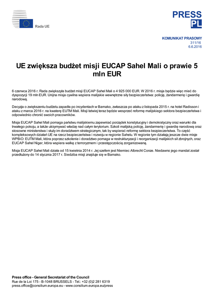 Rada UE PRESS PL KOMUNIKAT PRASOWY 311/16 6.6.2016 UE zwiększa budżet misji EUCAP Sahel Mali o prawie 5 mln EUR 6 czerwca 2016 r. Rada zwiększyła budżet misji EUCAP Sahel Mali o 4 925 000 EUR. W 2016 r. misja będzie więc mieć do dyspozycji 19 mln EUR. Unijna misja cywilna wspiera malijskie wewnętrzne siły bezpieczeństwa: policję, żandarmerię i gwardię narodową. Decyzja o zwiększeniu budżetu zapadła po incydentach w Bamako, zwłaszcza po ataku z listopada 2015 r. na hotel Radisson i ataku z marca 2016 r. na kwaterę EUTM Mali. Misji łatwiej teraz będzie wesprzeć reformę malijskiego sektora bezpieczeństwa i odpowiednio chronić swoich pracowników. Misja EUCAP Sahel Mali pomaga państwu malijskiemu zapewniać porządek konstytucyjny i demokratyczny oraz warunki dla trwałego pokoju, a także utrzymywać władzę nad całym terytorium. Szkoli malijską policję, żandarmerię i gwardię narodową oraz stosowne ministerstwa i służy im doradztwem strategicznym, tak by wspierać reformę sektora bezpieczeństwa. To część kompleksowych działań UE na rzecz bezpieczeństwa i rozwoju w regionie Sahelu. W regionie tym działają jeszcze dwie misje WPBiO: EUTM Mali, która poprzez szkolenie i doradztwo pomaga w restrukturyzacji i reorganizacji malijskich sił zbrojnych, oraz EUCAP Sahel Niger, która wspiera walkę z terroryzmem i przestępczością zorganizowaną. Misja EUCAP Sahel Mali działa od 15 kwietnia 2014 r. Jej szefem jest Niemiec Albrecht Conze. Niedawno jego mandat został przedłużony do 14 stycznia 2017 r. Siedziba misji znajduje się w Bamako. Press office - General Secretariat of the Council Rue de la Loi 175 - B-1048 BRUSSELS - Tel.: +32 (0)2 281 6319 [email protected] - www.consilium.europa.eu/press
