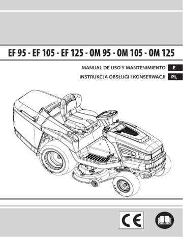 EF 95 - EF 105 - EF 125 - OM 95 - OM 105 - OM 125 MANUAL DE USO Y MANTENIMIENTO E INSTRUKCJA OBSŁUGI I KONSERWACJI PL 햲 1 햳 햴 햶 햷 max 10° (17%) 햵 햽 햿 2014 햺 햸 햹 Via E. Fermi, - 42011 Bagnolo in Piano (RE) Italy 27 OM 125/23 H 68079020 GARDEN TRACTOR 13,5 kW - 275 kg 707 XXX 0001 105 햾 햻 2 16 14 10 1A 1 3 2 8 11 4 9 15 13 5 6 12 2 7 17 3 b d 4 e a a b c d f 1 0 n 5 m l k j i h g f e 6 a b a b 7 8 a a b c 9 10 1 0 3 11 12 a c „Click“ a 13 14 a b „Click“ 15 16 2 1 17 2 18 1 2 1 4 a b 19 20 a a 21 22 c b a 23 24 25 26 5 E TRADUCCIÓN DE LAS INSTRUCCIONES ÍNDICE ORIGINALES 1. N O R M A S D E S E G U R I D A D (indicaciones para utilizar la máquina de modo seguro) INTRODUCCIÓN 2. EXPLICACIÓN DE LOS SÍMBOLOS Para utilizar correctamente la máquina y Y ADVERTENCIAS DE SEGURIDAD (identificación de la máquina y evitar accidentes, lea con atención este significado de los símbolos) manual antes de comenzar el trabajo. El 3. COMPONENTES PRINCIPALES manual contiene explicaciones sobre el (ubicación de los elementos funcionamiento de los distintos principales de la máquina) 4. ENSAMBLAJE (instrucciones para componentes, además de instrucciones para quitar el embalaje y montar las realizar los controles y el mantenimiento piezas sueltas) necesarios. 5. MANDOS E INSTRUMENTOS DE Nota. Las descripciones e ilustraciones CONTROL (ubicación y función de todos los mandos) contenidas en el presente manual no son 6. NORMAS DE USO (indicaciones vinculantes. El fabricante se reserva el para trabajar de modo correcto y derecho a modificar los productos sin seguro) hacer los cambios correspondientes en el - 6.1 Operaciones preliminares material impreso. - 6.2 Uso de la máquina Además de las instrucciones de uso y - 6.3 Corte del césped mantenimiento, este manual contiene otras - 6.4 Transporte informaciones que requieren una especial 7. MANTENIMIENTO (instrucciones para mantener la máquina en buen atención. Dichas informaciones están estado de funcionamiento) señaladas con los siguientes símbolos: 7.1 Recomendaciones de seguridad ATENCIÓN: indica riesgo de accidentes, 7.2 Acceso a los órganos mecánicos lesiones personales –incluso mortales– o - 7.3 Mantenimiento ordinario daños materiales importantes. PRECAUCIÓN: indica riesgo de que se - 7.4 Operaciones en la máquina 8. PROTECCIÓN DEL AMBIENTE dañen la máquina o sus componentes. (consejos para utilizar la máquina en Los tractores con descarga posterior se armonía con la naturaleza) fabrican en distintas versiones. Asegúrese de 9. ACCESORIOS (para ampliar el que estas instrucciones correspondan campo de aplicación de la máquina) específicamente a su modelo de tractor. - 9.1 Accesorios opcionales 10. DATOS TÉCNICOS (características principales de la máquina) ATENCIÓN 11. DECLARACIÓN DE CONFORMIDAD RIESGO DE DAÑO AUDITIVO 12. CERTIFICADO DE GARANTÍA (detalle EN CONDICIONES NORMALES, EL USO DE de las condiciones de garantía) ESTA MÁQUINA PUEDE EXPONER AL CONDUCTOR A UN NIVEL DIARIO DE 13. SOLUCIÓN DE PROBLEMAS (guía para resolver posibles RUIDO IGUAL O SUPERIOR A inconvenientes) 85 dB (A). 6 7 8 9 9 9 12 15 18 20 23 24 24 24 25 28 29 29 29 32 33 34 35 1. NORMAS DE SEGURIDAD ATENCIÓN - La máquina, si se la utiliza correctamente, es un instrumento de trabajo rápido, cómodo y eficaz; pero si se la emplea de modo inapropiado o sin las debidas precauciones puede resultar peligrosa. Para que su trabajo sea siempre agradable y seguro, respete estrictamente las normas de seguridad que se indican a continuación y en el resto del manual. - Las máquinas accionadas por motores de combustión interna transmiten vibraciones. En caso de exposición prolongada a dichas vibraciones, las personas afectadas de problemas circulatorios o edemas anómalos pueden sufrir lesiones en los vasos sanguíneos o en los nervios de los dedos, manos y muñecas. El uso prolongado en climas fríos se ha asociado a lesiones en los vasos sanguíneos de personas sanas. Si aparecen síntomas tales como pérdida de sensibilidad, dolor, pérdida de fuerza, cambio en la textura o el color de la piel, o pérdida de sensibilidad en dedos, manos o muñecas, interrumpa el uso de la máquina y acuda a un médico. - El sistema de encendido de la máquina genera un campo electromagnético de muy baja intensidad. Este campo puede inter ferir con algunos marcapasos. Para disminuir el riesgo de indisposiciones graves e incluso mortales, los portadores de marcapasos deben consultar a su médico y al fabricante del marcapasos antes de utilizar esta máquina. ATENCIÓN: La legislación de algunos países puede limitar el uso de la máquina. 1) Antes de utilizar la máquina, lea este manual con atención hasta que comprenda y sepa poner en práctica todas las reglas de seguridad, precauciones e instrucciones de manejo. 2) Tenga siempre el manual al alcance de la mano. Si este se extravía, pida otro ejemplar. 3) L a m á q u i n a d e b e s e r u t i l i z a d a exclusivamente por personas adultas que puedan comprender y respetar las normas de seguridad, precauciones e instrucciones contenidas en este manual. No permita que los menores utilicen la máquina. 4) No manipule ni utilice la máquina si está cansado, enfermo o inquieto, y tampoco si ha tomado alcohol, drogas o medicamentos. El conductor debe encontrarse en buen estado físico y con la mente alerta. El uso de esta máquina es fatigoso: si tiene algún problema que se pueda agravar a causa de este tipo de trabajo, consulte a su médico antes de utilizar la máquina. Preste mayor atención antes de las pausas de descanso y hacia el final del turno de trabajo. 5) Evite la presencia de personas y animales en un radio de 15 m como mínimo alrededor del lugar de trabajo. No permita que se acerquen personas o animales a la máquina durante el arranque y el uso. 6) Para trabajar con la máquina, póngase siempre ropa de seguridad homologada. No utilice prendas, bufandas, corbata