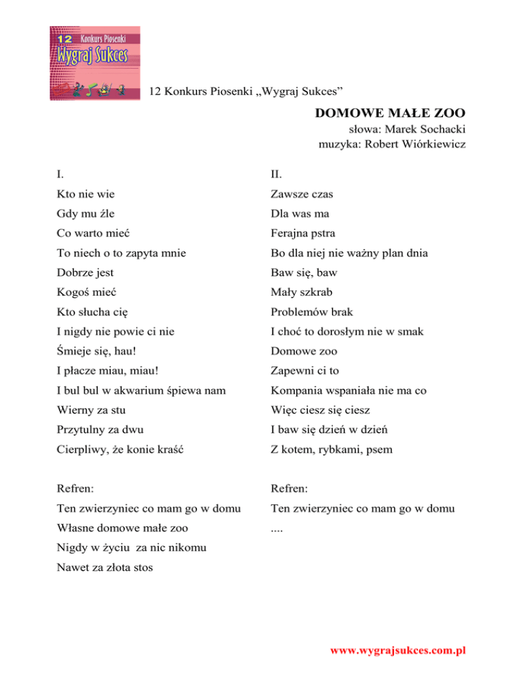 12 Konkurs Piosenki „Wygraj Sukces” DOMOWE MAŁE ZOO słowa: Marek Sochacki muzyka: Robert Wiórkiewicz I. II. Kto nie wie Zawsze czas Gdy mu źle Dla was ma Co warto mieć Ferajna pstra To niech o to zapyta mnie Bo dla niej nie ważny plan dnia Dobrze jest Baw się, baw Kogoś mieć Mały szkrab Kto słucha cię Problemów brak I nigdy nie powie ci nie I choć to dorosłym nie w smak Śmieje się, hau! Domowe zoo I płacze miau, miau! Zapewni ci to I bul bul w akwarium śpiewa nam Kompania wspaniała nie ma co Wierny za stu Więc ciesz się ciesz Przytulny za dwu I baw się dzień w dzień Cierpliwy, że konie kraść Z kotem, rybkami, psem Refren: Refren: Ten zwierzyniec co mam go w domu Ten zwierzyniec co mam go w domu Własne domowe małe zoo .... Nigdy w życiu za nic nikomu Nawet za złota stos www.wygrajsukces.com.pl