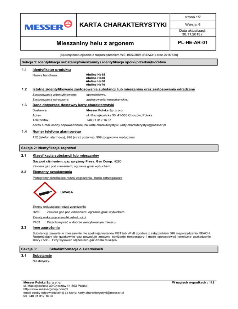 strona 1/7 KARTA CHARAKTERYSTYKI Wersja: 6 Data aktualizacji: 30.11.2015 r. PL-HE-AR-01 Mieszaniny helu z argonem [Sporządzona zgodnie z rozporządzeniem WE 1907/2006 (REACH) oraz 2015/830] Sekcja 1: Identyfikacja substancji/mieszaniny i identyfikacja spółki/przedsiębiorstwa 1.1 Identyfikator produktu Aluline He15 Aluline He30 Aluline He50 Aluline He70 Nazwa handlowa: 1.2 1.3 Istotne zidentyfikowane zastosowania substancji lub mieszaniny oraz zastosowania odradzane Zastosowania zidentyfikowane: spawalnictwo. Zastosowania odradzane: zastosowania konsumenckie. Dane dotyczące dostawcy karty charakterystyki Dostawca: Messer Polska Sp. z o.o. Adres: ul. Maciejkowicka 30, 41-503 Chorzów, Polska Telefon/fax: +48 91 312 16 37 Adres e-mail osoby odpowiedzialnej za kartę charakterystyki: [email protected] 1.4 Numer telefonu alarmowego 112 (telefon alarmowy), 998 (straż pożarna), 999 (pogotowie medyczne) Sekcja 2: Identyfikacja zagrożeń 2.1 Klasyfikacja substancji lub mieszaniny Gaz pod ciśnieniem, gaz sprężony Press. Gas Comp. H280 Zawiera gaz pod ciśnieniem; ogrzanie grozi wybuchem. 2.2 Elementy oznakowania Piktogramy określające rodzaj zagrożenia i hasło ostrzegawcze UWAGA Zwroty wskazujące rodzaj zagrożenia H280 Zawiera gaz pod ciśnieniem; ogrzanie grozi wybuchem. Zwroty wskazujące środki ostrożności P403 2.3 Przechowywać w dobrze wentylowanym miejscu. Inne zagrożenia Substancje zawarte w mieszaninie nie spełniają kryteriów PBT lub vPvB zgodnie z załącznikiem XIII rozporządzenia REACH. Rozprężający się gwałtownie gaz powoduje znaczne obniżenie temperatury i może spowodować termiczne uszkodzenie skóry i oczu. Przy wysokich stężeniach gaz działa dusząco. Sekcja 3: 3.1 Skład/informacja o składnikach Substancje Nie dotyczy. Messer Polska Sp. z o. o. ul. Maciejkowicka 30 Chorzów 41-503 Polska http://www.messergroup.com/pl email osoby odpowiedzialnej za karty: [email protected] tel. +48 91 312 16 37 W nagłych wypadkach : 112 strona 2/7 KARTA CHARAKTERYSTYKI Wersja: 6 Data aktualizacji: 30.11.2015 r. PL-HE-AR-01 Mieszaniny helu z argonem 3.2 Mieszaniny CAS: 7440-37-1 EINECS: 231-147-0 Numer indeksowy: Numer rejestracji właściwej: substancja zwolniona z obowiązku rejestracji CAS: 7440-59-7 EINECS: 231-168-5 Numer indeksowy: Numer rejestracji właściwej: substancja zwolniona z obowiązku rejestracji argon Press. Gas H280 30-85% hel Press. Gas H280 15-70% Pełna treść zwrotów H w sekcji 16 karty Sekcja 4: 4.1 Środki pierwszej pomocy Opis środków pierwszej pomocy W kontakcie ze skórą: w przypadku uszkodzenia skóry przez rozprężający się gwałtownie gaz nałożyć jałowy opatrunek i skontaktować się z lekarzem. W kontakcie z oczami: w przypadku uszkodzenia oczu przez rozprężający się gwałtownie gaz nałożyć jałowy opatrunek i natychmiast skonsultować się z okulistą - zapewnić poszkodowanemu specjalistyczną pomoc lekarską. W przypadku spożycia: narażenie tą drogą zazwyczaj nie występuje. Po narażeniu drogą oddechową: zadbać o zabezpieczenie personelu udzielającego pierwszej pomocy przed działaniem gazu. Wyprowadzić poszkodowanego na świeże powietrze, zapewnić ciepło i spokój. Jeśli u poszkodowanego obserwuje się trudności w oddychaniu lub doszło do zatrzymania akcji oddechowej przeszkolony personel powinien podawać mu tlen lub przeprowadzić resuscytację krążeniowo-oddechową. W razie wystąpienia niepokojących objawów skonsultować się z lekarzem. 4.2 Najważniejsze ostre i opóźnione objawy oraz skutki narażenia Po inhalacji: przy wysokich stężeniach gaz wypiera tlen z powietrza i może działać dusząco, może dojść do utraty zdolności ruchowych i przytomności. W kontakcie ze skórą: rozprężający się gwałtownie gaz powoduje znaczne obniżenie temperatury i może spowodować termiczne uszkodzenie skóry. W kontakcie z oczami: rozprężający się gwałtownie gaz powoduje znaczne obniżenie temperatury i może spowodować termiczne uszkodzenie oczu. 4.3 Wskazania dotyczące wszelkiej natychmiastowej pomocy lekarskiej i szczególnego postępowania z poszkodowanym Decyzję o sposobie postępowania ratunkowego podejmuje lekarz po dokładnej ocenie stanu poszkodowanego. Leczyć objawowo. Sekcja 5: 5.1 Postępowanie w przypadku pożaru Środki gaśnicze Odpowiednie środki gaśnicze: mgła wodna , rozpylony strumień wody. Niewłaściwe środki gaśnicze: zwarty strumień wody – niebezpieczeństwo rozprzestrzenienia pożaru. 5.2 Szczególne zagrożenia związane z substancją lub mieszaniną Butle zawierające sprężony gaz narażone na działanie ognia lub wysokiej temperatury mogą eksplodować. 5.3 Informacje dla straży pożarnej Środki ochrony ogólnej typowe w przypadku pożaru. Nie należy przebywać w zagrożonej ogniem strefie bez odpowiedniego ubrania odpornego na chemikalia i aparatu do oddychania z niezależnym obiegiem powietrza. Produkt nie jest palny, jednak pod wpływem wysokiej temperatury w zbiornikach, w których jest magazynowany dochodzi do wzrostu ciśnienia i może dojść do wybuchu. Zagrożone ogniem zbiorniki chłodzić rozpylonym strumieniem wody z bezpiecznej odległości. Uwolniony gaz może wypierać tlen z powietrza, działając dusząco. Messer Polska Sp. z o. o. ul. Maciejkowicka 30 Chorzów 41-503 Polska http://www.messergroup.com/pl email osoby odpowiedzialnej za karty: [email protected] tel. +48 91 312 16 37 W nagłych wypadkach : 112 strona 3/7 KARTA CHARAKTERYSTYKI Wersja: 6 Data aktualizacji: 30.11.2015 r. Mieszaniny helu z argonem PL-HE-AR-01 Sekcja 6: Postępowanie w przypadku niezamierzonego uwolnienia do środowiska 6.1 Indywidualne środki ostrożności, sprzęt ochronny i procedury w sytuacjach awaryjnych Ograniczyć dostęp osób postronnych do obszaru awarii do czasu zakończenia odpowiednich operacji oczyszczania. Kontrolować zawartość tlenu w powietrzu na terenie lub w pomieszczeniu, gdzie nastąpił wyciek. Jeżeli zawartość tl