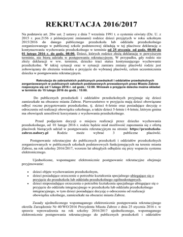 REKRUTACJA 2016/2017 Na podstawie art. 20w ust. 2 ustawy z dnia 7 września 1991 t. o systemie oświaty (Dz. U. z 2015 r. poz.2156 z późniejszymi zmianami) rodzice dzieci przyjętych w roku szkolnym 2015/2016 do danego publicznego przedszkola lub oddziału przedszkolnego zorganizowanego w publicznej szkole podstawowej składają w tej placówce deklarację o kontynuowaniu wychowania przedszkolnego w terminie od 25 stycznia od godz. 08:00 do 01 lutego 2016 r. do godz. 08:00. Dzieci, których rodzice złożą deklarację w powyższym terminie, nie biorą udziału w postępowaniu rekrutacyjnym. W przypadku, gdy rodzic nie złoży deklaracji w ww. terminie, dziecko traci status kontynuującego wychowanie przedszkolne. W takiej sytuacji oraz w sytuacji zamiaru zmiany placówki rodzic jest zobowiązany do złożenia wniosku o przyjęcie do wybranej placówki, celem uczestniczenia dziecka w postępowaniu rekrutacyjnym. Rekrutacja do zabrzańskich publicznych przedszkoli i oddziałów przedszkolnych zorganizowanych w publicznych szkołach podstawowych prowadzonych przez Miasto Zabrze rozpoczyna się od 1 lutego 2016 r. od godz.: 12:00. Wniosek o przyjęcie dziecka można składać w terminie do 15 lutego 2016 do godz.: 15:00. Do publicznych przedszkoli i oddziałów przedszkolnych przyjmuje się dzieci zamieszkałe na obszarze miasta Zabrze. Pierwszeństwo w przyjęciu mają dzieci obowiązane odbyć roczne przygotowanie przedszkolne, tj. dzieci 6-letnie oraz posiadające decyzję o odroczeniu od realizacji obowiązku szkolnego, a także dzieci 5-letnie i 4-letnie, którym gmina ma obowiązek umożliwić korzystanie z wychowania przedszkolnego. Przed podjęciem decyzji o miejscu realizacji przez dziecko wychowania przedszkolnego, od 01 lutego 2016 r. rodzic będzie miał możliwość zapoznania się z ofertą placówek biorących udział w postępowaniu rekrutacyjnym na stronie: https://przedszkolazabrze.nabory.pl Rodzic może wybrać 3 publiczne placówki. Postępowanie rekrutacyjne do publicznych przedszkoli i oddziałów przedszkolnych zorganizowanych w publicznych szkołach podstawowych funkcjonujących na terenie miasta Zabrze, na rok szkolny 2016/2017, wzorem lat ubiegłych odbędzie się przy wsparciu systemu elektronicznego. Ujednolicone, wspomagane elektronicznie postępowanie rekrutacyjne obejmuje przyjmowanie: dzieci objęte wychowaniem przedszkolnym, dzieci posiadające orzeczenie o potrzebie kształcenia specjalnego ubiegające się o przyjęcie do przedszkola lub oddziału przedszkolnego ogólnodostępnych, dzieci nieposiadające orzeczenia o potrzebie kształcenia specjalnego ubiegające się o przyjęcie do oddziału integracyjnego w przedszkolu lub oddziału przedszkolnego integracyjnego, w tym dzieci posiadające decyzję o odroczeniu od realizacji obowiązku szkolnego, zamieszkałe na obszarze miasta Zabrze. Zasady ujednoliconego wspomaganego elektronicznie postępowania rekrutacyjnego określa Zarządzenie Nr 40/WO/2016 Prezydenta Miasta Zabrze z dnia 25 stycznia 2016 r. w sprawie wprowadzenia na rok szkolny 2016/2017 ujednoliconego, wspomaganego elektronicznie postępowania rekrutacyjnego do publicznych przedszkoli i oddziałów przedszkolnych zorganizowanych w publicznych szkołach podstawowych, prowadzonych przez Miasto Zabrze (zakładka "Prawo") Terminy przeprowadzania postępowania rekrutacyjnego oraz postępowania uzupełniającego przyjmowania dzieci do publicznych przedszkoli i oddziałów przedszkolnych zorganizowanych w publicznych szkołach podstawowych na rok szkolny 2016/2017 zostały określone w Zarządzeniu Nr 39/WO/2016 Prezydenta Miasta Zabrze z dnia 25 stycznia 2016 r. w sprawie ustalenia harmonogramu czynności w postępowaniu rekrutacyjnym oraz postępowaniu uzupełniającym do publicznych przedszkoli i oddziałów przedszkolnych zorganizowanych w publicznych szkołach podstawowych, prowadzonych przez Miasto Zabrze, na rok szkolny 2016/2017 (zakładka "Prawo") Etapy ujednoliconego wspomaganego elektronicznie postępowania rekrutacyjnego dzieci do publicznych przedszkoli i oddziałów przedszkolnych zorganizowanych w publicznych szkołach podstawowych prowadzonych przez Miasto Zabrze na rok szkolny 2016/2017: 1. postępowanie rekrutacyjne na wolne miejsca. 2. pierwszy etap postępowania rekrutacyjnego, w przypadku gdy liczba kandydatów jest większa od liczby miejsc w danym przedszkolu lub oddziale przedszkolnym. Na tym etapie brane są pod uwagę łącznie ustawowe kryteria, mające jednakową wartość. 3. drugi etap postępowania rekrutacyjnego, prowadzony w przypadku równorzędnych wyników uzyskanych po pierwszym etapie postępowania rekrutacyjnego lub gdy dana placówka dysponuje nadal wolnymi miejscami. Na tym etapie brane są pod uwagę kryteria i liczba punktów za dane kryterium, określone w Uchwale Nr VII/59/15 Rady Miasta Zabrze z dnia 23 lutego 2015 r. w sprawie określenia na drugim etapie postępowania rekrutacyjnego do publicznych przedszkoli i oddziałów przedszkolnych zorganizowanych w publicznych szkołach podstawowych, prowadzonych przez Miasto Zabrze kryteriów i przyznawania każdemu kryterium liczby punktów oraz określenia dokumentów niezbędnych do potwierdzania tych kryteriów (zakładka "Prawo") Po zakończeniu ujednoliconego wspomaganego elektronicznie postępowania rekrutacyjnego w przypadku gdy przedszkole lub oddział przedszkolny będzie nadal dysponował wolnymi miejscami dyrektor placówki prowadzi postępowanie uzupełniające. Zasady ogólne postępowania rekrutacyjnego do przedszkoli i oddziałów przedszkolnych na rok szkolny 2016/2017 1. Do publicznego przedszkola lub oddziału przedszkolnego zorganizowanego w publicznej szkole podstawowej przyjmuje się dzieci, na wniosek rodzica, po przeprowadzeniu postępowania rekrutacyjnego. 2. Niezłożenie w wyznaczonym terminie w wybranej placówce wniosku o przyjęcie dziecka, wyklucza udział dziecka w postępowaniu rekrutacyjnym. 3. O przyjęcie do publicznego przed