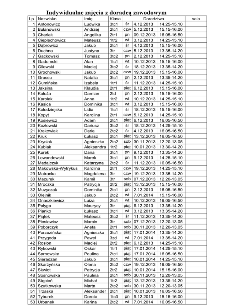 Indywidualne zajęcia z doradcą zawodowym Lp. 1 2 3 4 5 6 7 8 9 10 11 12 13 14 15 16 17 18 19 20 21 22 23 24 25 26 27 28 29 30 31 32 33 34 35 36 37 38 39 40 41 42 43 44 45 46 47 48 49 50 51 52 53 Nazwisko Antonowicz Bułanowski Charlak Cieplechowicz Dąbrowicz Duchna Gackowski Gadomski Gilewski Grochowski Grossu Gumińska Jaksina Kałuża Karolak Kasica Kołodziejska Kopyt Kosiewicz Kozłowski Krakowiak Kruk Krysiak Kubiak Kurek Lewandowski Madajczyk Makowska-Wytrykus Matracka Mazurek Mroczka Muzyczak Olejnik Onaszkiewicz Pałyga Pianko Piątek Piesiewicz Poborczyk Porzezińska Przygoda Rosłon Rykowski Sarnowska Sieradzan Skarżyńska Skwiot Sosnowska Stępień Szutkowska Trzaska Tyburek Urbanek Imię Ludwika Andrzej Angelika Mateusz Jakub Justyna Tomasz Alan Maciej Jakub Natalia Izabela Klaudia Damian Anna Dominika Lidia Karolina Adam Dariusz Daria Łukasz Agnieszka Aleksandra Daria Marek Katarzyna Karolina Magdalena Kamil Patrycja Dominika Jakub Luiza Maurycy Łukasz Mateusz Marcin Aneta Agnieszka Paweł Maciej Oskar Paulina Jakub Olena Patrycja Paulina Michał Marta Aleksander Dorota Karina Klasa 3tc1 2tc1 2tr1 1tr2 2tc1 3tr 3tc2 1tc1 3tc2 2tc2 3tc1 1tr1 2tr1 2td 1tr2 3tc1 1tc1 2tr1 2tc1 3tc2 2tc2 2tc1 2tc2 1tr2 3tc1 3tc1 2tc2 2tr1 3tr 3tr 2tr2 2tc1 2tc2 2tc1 3tr 3tc1 3tc2 3tr 2tr1 3tc1 3zd 2tr2 1tr1 2tc1 3tc1 2tc2 2tr2 2tc1 1tr2 2tc2 2tc1 1tc3 2tc2 śr czw pn wt śr czw pn wt śr czw pn śr piąt pn wt wt śr czw piąt śr śr piąt sob piąt pn pn śr czw czw sob piąt pn wt wt piąt wt śr sob sob piąt wt piąt piąt piąt piąt czw piąt sob piąt sob piąt pn wt Doradztwo 4.12.2013 14.25-15.10 5.12.2013 15.15-16.00 09.12.2013 16.05-16.50 3.12.2013 14.25-15.10 4.12.2013 15.15-16.00 5.12.2013 13.35-14.20 2.12.2013 14.25-15.10 10.12.2013 15.15-16.00 18.12.2013 13.35-14.20 19.12.2013 15.15-16.00 2.12.2013 13.35-14.20 11.12.2013 14.25-15.10 6.12.2013 15.15-16.00 2.12.2013 15.15-16.00 10.12.2013 14.25-15.10 3.12.2013 15.15-16.00 18.12.2013 15.15-16.00 5.12.2013 14.25-15.10 6.12.2013 16.05-16.50 18.12.2013 14.25-15.10 4.12.2013 16.05-16.50 13.12.2013 16.05-16.50 30.11.2013 12.20-13.05 10.01.2013 13.30-14.20 9.12.2013 13.35-14.20 9.12.2013 14.25-15.10 11.12.2013 16.05-16.50 19.12.2013 14.25-15.10 19.12.2013 13.35-14.20 07.12.2013 12.20-13.05 13.12.2013 15.15-16.00 2.12.2013 16.05-16.50 7.01.2014 15.15-16.00 10.12.2013 16.05-16.50 6.12.2013 13.35-14.20 3.12.2013 13.35-14.20 11.12.2013 13.35-14.20 07.12.2013 12.20-13.05 30.11.2013 12.20-13.05 17.01.2014 13.35-14.20 7.01.2014 13.35-14.20 6.12.2013 14.25-15.10 17.01.2014 14.25-15.10 17.01.2014 16.05-16.50 10.01.2014 14.25-15.10 19.12.2013 16.05-16.50 10.01.2014 15.15-16.00 30.11.2013 12.20-13.05 13.12.2013 13.35-14.20 30.11.2013 12.20-13.05 10.01.2013 16.05-16.50 9.12.2013 15.15-16.00 7.01.2014 16.05-16.50 sala 54 55 56 57 58 59 60 Wasążnik Wierzbicki Wojciechowski Wojnicka Wołoszyn Zadrożyńska Zaraś Karolina Krzysztof Krzysztof Karolina Zofia Patrycja Bartłomiej 2tr2 2tr2 3tp 2tc1 1tc1 1tr2 3tc1 pn wt śr śr piąt wt piąt 02.12.2013 3.12.2013 4.12.2013 11.12.2013 17.01.2014 7.01.2014 13.12.2013 16.55-17.40 16.05-16.50 13.35-14.20 15.15-16.00 15.15-16.00 14.25-15.10 14.25-15.10