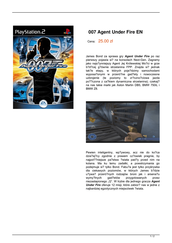 007 Agent Under Fire EN Cena: 25.00 zł James Bond za sprawa gry Agent Under Fire po raz pierwszy pojawia si? na konsolach Next-Gen. Zagramy jako najs?ynniejszy Agent Jej Królewskiej Mo?ci w grze b?d?cej g?ównie strzelanina FPP. Znajda si? jednak tak?e etapy, w których poje?dzimy samochodami wyposa?onymi w przeró?ne gad?ety i nowoczesne uzbrojenie (te poziomy to zr?czno?ciowa jazda po??czona z ca?kiem dynamiczna strzelanina); czekaj? na nas takie marki jak Aston Martin DB5, BMW 750iL i BMW Z8. Pewien inteligentny, wp?ywowy, acz nie do ko?ca dzia?aj?cy zgodnie z prawem cz?owiek pragnie, by najpot??niejsze pa?stwa ?wiata pad?y przed nim na kolana. Ma ku temu zadatki, a powstrzymania go podejmuje si? tylko Bond. Fabu?a jest tylko przykrywka dla ciekawych poziomów, w których James b?dzie u?ywa? przeró?nych rodzajów broni jak i arsena?u wymy?lnych gad?etów przygotowanych przez niezastapionego „Q”. W trybie dla jednego gracza Agent Under Fire oferuje 12 misji, które zabior? nas w jedne z najbardziej egzotycznych miejscówek ?wiata. 1/2 Od dwóch do czterech graczy mo?e jednocze?nie zmierzy? si? miedzy sob? na podzielonym ekranie w trybie multiplayer. 007 nie by?by sob? gdyby nie swoisty magnes, którym przyci?ga pi?kne damy – tak?e w tej grze wideo ich nie zabraknie. Sukcesem do zaliczania tych bardziej rozbudowanych etapów (a s? nimi te z „widokiem z oczu”) droga do sukcesu jest odpowiednie operowanie si?? ognia oraz u?ywanie „bondowskich” gad?etów. Trzeba wiec niektóre dzia?ania trzeba planowa? podczas akcji i nieco kombinowa?. Odpr??enie natomiast przychodzi wraz z misjami, podczas których zasiadamy za kierownica samochodów, cho? i w?ród nich znajdziecie takie, które wymusza na Was pe?na koncentracje. Nikt nie mówi? przecie?, ze najlepszy agent ?wiata b?dzie mia? ?atwo. Zobacz wideo: Szczegóły wersja językowa POLSKA 2/2 Powered by TCPDF (www.tcpdf.org)