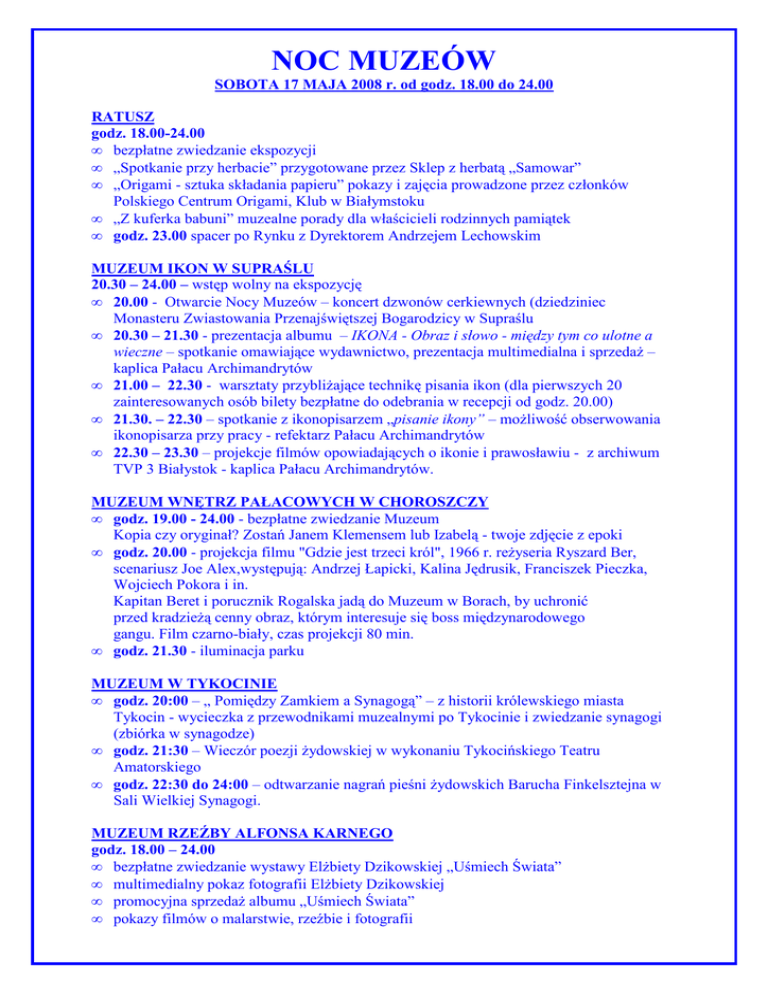 NOC MUZEÓW SOBOTA 17 MAJA 2008 r. od godz. 18.00 do 24.00 RATUSZ godz. 18.00-24.00 • bezpłatne zwiedzanie ekspozycji • „Spotkanie przy herbacie” przygotowane przez Sklep z herbatą „Samowar” • „Origami - sztuka składania papieru” pokazy i zajęcia prowadzone przez członków Polskiego Centrum Origami, Klub w Białymstoku • „Z kuferka babuni” muzealne porady dla właścicieli rodzinnych pamiątek • godz. 23.00 spacer po Rynku z Dyrektorem Andrzejem Lechowskim MUZEUM IKON W SUPRAŚLU 20.30 – 24.00 – wstęp wolny na ekspozycję • 20.00 - Otwarcie Nocy Muzeów – koncert dzwonów cerkiewnych (dziedziniec Monasteru Zwiastowania Przenajświętszej Bogarodzicy w Supraślu • 20.30 – 21.30 - prezentacja albumu – IKONA - Obraz i słowo - między tym co ulotne a wieczne – spotkanie omawiające wydawnictwo, prezentacja multimedialna i sprzedaŜ – kaplica Pałacu Archimandrytów • 21.00 – 22.30 - warsztaty przybliŜające technikę pisania ikon (dla pierwszych 20 zainteresowanych osób bilety bezpłatne do odebrania w recepcji od godz. 20.00) • 21.30. – 22.30 – spotkanie z ikonopisarzem „pisanie ikony” – moŜliwość obserwowania ikonopisarza przy pracy - refektarz Pałacu Archimandrytów • 22.30 – 23.30 – projekcje filmów opowiadających o ikonie i prawosławiu - z archiwum TVP 3 Białystok - kaplica Pałacu Archimandrytów. MUZEUM WNĘTRZ PAŁACOWYCH W CHOROSZCZY • godz. 19.00 - 24.00 - bezpłatne zwiedzanie Muzeum Kopia czy oryginał? Zostań Janem Klemensem lub Izabelą - twoje zdjęcie z epoki • godz. 20.00 - projekcja filmu "Gdzie jest trzeci król", 1966 r. reŜyseria Ryszard Ber, scenariusz Joe Alex,występują: Andrzej Łapicki, Kalina Jędrusik, Franciszek Pieczka, Wojciech Pokora i in. Kapitan Beret i porucznik Rogalska jadą do Muzeum w Borach, by uchronić przed kradzieŜą cenny obraz, którym interesuje się boss międzynarodowego gangu. Film czarno-biały, czas projekcji 80 min. • godz. 21.30 - iluminacja parku MUZEUM W TYKOCINIE • godz. 20:00 – „ Pomiędzy Zamkiem a Synagogą” – z historii królewskiego miasta Tykocin - wycieczka z przewodnikami muzealnymi po Tykocinie i zwiedzanie synagogi (zbiórka w synagodze) • godz. 21:30 – Wieczór poezji Ŝydowskiej w wykonaniu Tykocińskiego Teatru Amatorskiego • godz. 22:30 do 24:00 – odtwarzanie nagrań pieśni Ŝydowskich Barucha Finkelsztejna w Sali Wielkiej Synagogi. MUZEUM RZEŹBY ALFONSA KARNEGO godz. 18.00 – 24.00 • bezpłatne zwiedzanie wystawy ElŜbiety Dzikowskiej „Uśmiech Świata” • multimedialny pokaz fotografii ElŜbiety Dzikowskiej • promocyjna sprzedaŜ albumu „Uśmiech Świata” • pokazy filmów o malarstwie, rzeźbie i fotografii