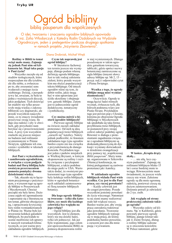 Tr y by U R Ogród biblijny biblią pauperum dla współczesnych O idei, tworzeniu i znaczeniu ogrodów biblijnych opowiada dr inż. Zofia Włodarczyk z Katedry Roślin Ozdobnych na Wydziale Ogrodniczym, jeden z prelegentów podczas drugiego spotkania w ramach projektu „Inżynieria Zbawienia”. Diana Drobniak, Michał Wnęk Rośliny w Biblii to temat wciąż mało znany. Zajmuje się jednak Pani nim od kilkunastu lat. Skąd taka pasja w Pani życiu? – Wszystko zaczęło się od studiów teologicznych, które rozpoczęłam nie dla tytułów, ale dla siebie, a zwłaszcza po to, aby zrozumieć sens wydarzeń z mojego życia osobistego. Dzisiaj, z perspektywy lat, uważam, że była to jedna z ważniejszych decyzji, jakie podjęłam. Tych dziewięć lat studiów nie tylko poszerzyło moją wiedzę z zakresu biblistyki czy dogmatyki, ale przede wszystkim nauczyło mnie, co to znaczy świadomie przeżywać swoją wiarę. Ile daje ona radości i siły w chwilach, gdy przychodzi nam borykać się z przeciwnościami losu. A przy tym wszystkim znalazło się jeszcze miejsce na badania nad roślinami wymienionymi w Piśmie Świętym, zgłębianie ich znaczenia i symboliki w tekstach biblijnych. Jest Pani z wykształcenia i zamiłowania ogrodnikiem, w związku z czym podjęcie badań nad florą biblijną było swoistym przerzuceniem pomostu pomiędzy dwoma dziedzinami wiedzy. – Tak, okazało się to łączeniem przyjemnego z pożytecznym, a wyrazem tego są ogrody biblijne w Proszowicach i Myczkowcach. Chociaż początki nie były łatwe. Dużo czasu zajęło mi zgromadzenie i zapoznanie się z literaturą na ten temat, głównie obcojęzyczną, i opracowanie krytycznej listy roślin wzmiankowanych w Piśmie św. Ważne było też stworzenie kolekcji gatunków biblijnych, bo pozwalało to ocenić możliwości ich uprawy w naszych warunkach klimatycznych, co jest ważne przy zakładaniu ogrodów biblijnych. II Czym tak naprawdę jest ogród biblijny? – W literaturze fachowej ten termin jeszcze nie występuje, dlatego podam własną definicję ogrodu biblijnego. Jest to taki rodzaj założenia zieleni, który przede wszystkim ma służyć popularyzacji tekstu biblijnego. Od innych ogrodów różni się tym, że dobór roślin, jakie mogą być w nim uprawiane jest ściśle określony i obejmuje tzw. gatunki biblijne. Zatem jest to jednocześnie ogród dydaktyczny, tematyczny i symboliczny. Czy można mówić o historii ogrodów biblijnych? – Pierwsze ogrody biblijne na świecie zaczęli zakładać protestanci. Od nich tą ideą popularyzacji treści biblijnych „zarazili się” katolicy. Należy jednak podkreślić, że fenomen zakładania tego typu ogrodów bardzo często nie ma związku z przynależnością do danego Kościoła. Przykładem tego jest jeden z parków miejskich w Wielkiej Brytanii, w którym eksponowane są rośliny i rzeźby związane z perykopami biblijnymi, a także podobne do niego parki w USA. Warto także dodać, że swoistymi prekursorami tego typu ogrodów były kolekcje roślin biblijnych, które w ogrodach botanicznych zakładali zainteresowani florą terenów biblijnych botanicy. Dla kogo ogrody biblijne są tworzone – tylko dla katolików, czy może dla każdego człowieka bez względu na jego religię? – Ogród biblijny jest dla wszystkich. Jest to element, który nie ma dzielić ludzi, tylko ich jednoczyć. Jak już było wspomniane, jego celem jest upowszechnianie Biblii za pomocą eksponowania roślin TRYBY nr 8/2011 Dodatek Uniwersytetu Rolniczego w Krakowie w niej wymienionych. Dlatego posadzonym w takim ogrodzie gatunkom towarzyszą tabliczki, gdzie oprócz nazwy botanicznej zamieszczone są sigla biblijne (innymi słowy adresy biblijne np. Mt 2, 13 – przyp. red.) i odpowiedni cytat z Pisma Świętego. Wynika z tego, że ogrody biblijne mogą mieć wymiar ekumeniczny? – Oczywiście. Ogrody te mogą łączyć ludzi różnych wyznań, zwłaszcza tych, dla których podstawą wiary jest Pismo Święte. Przykładem tego jest pewien pop z Ukrainy, któremu po obejrzeniu Ogrodu biblijnego w Myczkowcach tak spodobała się taka forma przybliżania treści biblijnych, że postanowił przy swojej cerkwi założyć podobny ogród. Również w dialogu z protestantami zagadnienia związane z ogrodami biblijnymi są doskonałą płaszczyzną do dyskusji i wymiany doświadczeń w dziedzinie ewangelizacji przy pomocy tej „współczesnej Biblii pauperum”. Służy temu np. organizowana w Szlezwiku (Niemcy) konferencja, na której prelegentami są zarówno protestanci jak i katolicy. W zakładanie ogrodów biblijnych wkłada Pani wiele wysiłku. Czy jest to dla Pani praca, czy raczej powołanie? – Każdy człowiek jest do czegoś powołany. Przede wszystkim jesteśmy powołani do życia wiecznego. Natomiast tu na ziemi mamy realizować małe lub większe rzeczy. Bardzo ważne jest, aby swoją pracę zawodową traktować jako powołanie. Tworzenie ogrodów biblijnych wpisuje się w moją pracę, do której podchodzę bardzo poważnie, a zarazem jest ona dla mnie pasją i wyzwaniem. W końcu „Kropla drąży skałę... – … nie siłą, lecz częstym padaniem”. Zajmuję się roślinami biblijnym blisko 15 lat i coraz bardziej mnie to wciąga. Równocześnie mam świadomość, że jeszcze wielu rzeczy nie wiem. Założone ogrody są dla mnie ogromną radością, ponieważ cieszą się dużym zainteresowaniem. Dziennie potrafi je odwiedzić do 2 tys. osób. Jak wygląda od strony praktycznej założenie takiego ogrodu? – Wszystko zależy od klimatu. Np. w Kalifornii, gdzie powstały pierwsze ogrody biblijne, panuje klimat taki jak w Ziemi Świętej, dlateg o rośliny biblijne sadzone są w otoczeniu kościołów. W Polsce natomiast, gdzie fot.: Diana Drobniak Tr y by U R klimat jest zupełnie inny, rośliny, które wymagają wyższych temperatur, na okres zimy muszą być wstawiane do szklarni. W Biblii wymienionych jest około 200 roślin, ale siedem z n