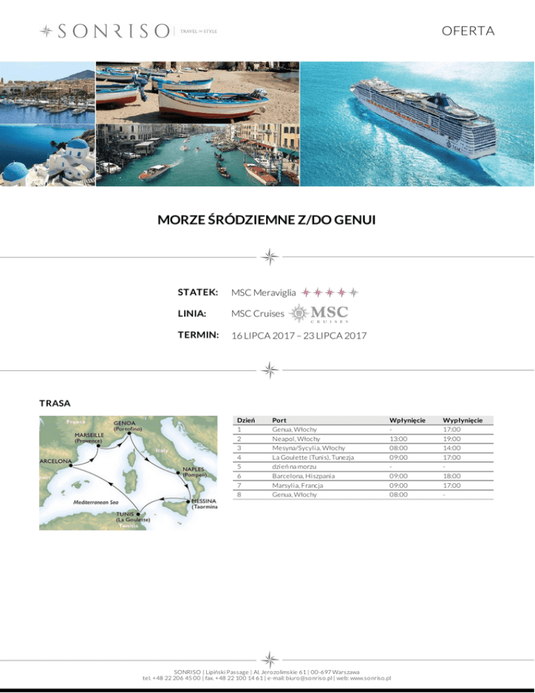 OFERTA MORZE ŚRÓDZIEMNE Z/DO GENUI STATEK: MSC Meraviglia LINIA: MSC Cruises TERMIN: 16 LIPCA 2017 – 23 LIPCA 2017 TRASA Dzień 1 2 3 4 5 6 7 8 Port Genua, Włochy Neapol, Włochy Mesyna/Sycylia, Włochy La Goulette (Tunis), Tunezja dzień na morzu Barcelona, Hiszpania Marsylia, Francja Genua, Włochy Wpłynięcie 13:00 08:00 09:00 09:00 09:00 08:00 SONRISO | Lipiński Passage | Al. Jero zo limskie 61 | 00-697 Warszawa tel. +48 22 206 45 00 | fax. +48 22 100 14 61 | e-mail: biuro @so nriso .pl | web: www.so nriso .pl Wypłynięcie 17:00 19:00 14:00 17:00 18:00 17:00 - OFERTA CENA Typ kabiny KABINA WEWNĘTRZNA KABINA Z OKNEM Cena z osobę od 729 EUR od 899 EUR KABINA Z BALKONEM od 1 079 EUR SUITE od 1 869 EUR CENA ZAWIERA DOTATKOWE OPŁATY zakwaterowanie w 2 - os. kabinie wybranej kategorii pełne wyżywienie: 3 posiłki, przekąski między posiłakmi, bufet o północy napoje: woda stołowa, kawa, herbata oraz sok do śniadania dostępne 24 h w restauracji bufetowej oraz w restauracji głównej wyłącznie podczas śniadań serwis bagażowy podczas wejścia i zejścia ze statku 24 godzinny serwis kabinowy korzystanie z urządzeń sportowo - rekreacyjnych dostępnych na pokładzie (baseny, jacuzzi, boiska sportowe, kluby dla dzieci i młodzieży itp.) udział we wszystkich imprezach organizowanych na pokładzie (przedstawienia, pokazy, aukcje, animacje i inne) dojazd/przelot do portu rozpoczęcia i zakończenia rejsu transfery (lotnisko - port - lotnisko) ewentualne noclegi przed lub po rejsie wycieczki fakultatywne napoje: bezalkoholowe, alkoholowe, woda mineralna dostępne w restauracjach i barach (istnieje możliwość wykupienia pakietów napojów, o szczegóły zapytaj w biurze) korzystanie z mini baru w kabinie korzystanie z usług typu: SPA, salon piękności, pralnia itp. wydatki osobiste tj. zakupy w butikach, internet, kasyno itp. obowiązkowe opłaty portowe obowiązkowa opłata serwisowa (napiwki dla obsługi statku ok.8,5 EUR/os. dorosła/dzień, dzieci poniżej 3 lat nie płacą) obowiązkowe ubezpieczenie turystyczne koszt wymaganych wiz ewentualna opłata paliwowa (linia w momencie wzrotu cen ropy zastrzega sobie prawo do dodania oplaty paliwowej do każdej rezerwacji) Na życzenie świadczymy dodatkowo usługi: rezerwacje hotelowe na całym świecie rezerwacje biletów lotniczych, trasferów oraz parkingu w porcie rezerwacje wycieczek fakultatywnych i innych atrakcji SONRISO | Lipiński Passage | Al. Jero zo limskie 61 | 00-697 Warszawa tel. +48 22 206 45 00 | fax. +48 22 100 14 61 | e-mail: biuro @so nriso .pl | web: www.so nriso .pl