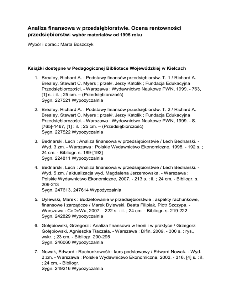 Analiza finansowa w przedsiębiorstwie. Ocena rentowności przedsiębiorstw: wybór materiałów od 1995 roku Wybór i oprac.: Marta Boszczyk Książki dostępne w Pedagogicznej Bibliotece Wojewódzkiej w Kielcach 1. Brealey, Richard A. : Podstawy finansów przedsiębiorstw. T. 1 / Richard A. Brealey, Stewart C. Myers ; przekł. Jerzy Katolik ; Fundacja Edukacyjna Przedsiębiorczości. - Warszawa : Wydawnictwo Naukowe PWN, 1999. - 763, [1] s. : il. ; 25 cm. – (Przedsiębiorczość) Sygn. 227521 Wypożyczalnia 2. Brealey, Richard A. : Podstawy finansów przedsiębiorstw. T. 2 / Richard A. Brealey, Stewart C. Myers ; przekł. Jerzy Katolik ; Fundacja Edukacyjna Przedsiębiorczości. - Warszawa : Wydawnictwo Naukowe PWN, 1999. - S. [765]-1467, [1] : il. ; 25 cm. – (Przedsiębiorczość) Sygn. 227522 Wypożyczalnia 3. Bednarski, Lech : Analiza finansowa w przedsiębiorstwie / Lech Bednarski. Wyd. 3 zm. - Warszawa : Polskie Wydawnictwo Ekonomiczne, 1998. - 192 s. ; 24 cm. - Bibliogr. s. 189-[192] Sygn. 224811 Wypożyczalnia 4. Bednarski, Lech : Analiza finansowa w przedsiębiorstwie / Lech Bednarski. Wyd. 5 zm. / aktualizacja wyd. Magdalena Jerzemowska. - Warszawa : Polskie Wydawnictwo Ekonomiczne, 2007. - 213 s. : il. ; 24 cm. - Bibliogr. s. 209-213 Sygn. 247613, 247614 Wypożyczalnia 5. Dylewski, Marek : Budżetowanie w przedsiębiorstwie : aspekty rachunkowe, finansowe i zarządcze / Marek Dylewski, Beata Filipiak, Piotr Szczypa. Warszawa : CeDeWu, 2007. - 222 s. : il. ; 24 cm. - Bibliogr. s. 219-222 Sygn. 242829 Wypożyczalnia 6. Gołębiowski, Grzegorz : Analiza finansowa w teorii i w praktyce / Grzegorz Gołębiowski, Agnieszka Tłaczała. - Warszawa : Difin, 2009. - 300 s. : rys., wykr. ; 23 cm. - Bibliogr. 290-295 Sygn. 246060 Wypożyczalnia 7. Nowak, Edward : Rachunkowość : kurs podstawowy / Edward Nowak. - Wyd. 2 zm. - Warszawa : Polskie Wydawnictwo Ekonomiczne, 2002. - 316, [4] s. : il. ; 24 cm. - Bibliogr. Sygn. 249216 Wypożyczalnia 8. Nowak, Edward : Rachunkowość : kurs podstawowy / Edward Nowak. - Wyd. 4 zm. - Warszawa : Polskie Wydawnictwo Ekonomiczne, 2008. - 334 s. : il. ; 24 cm. - Bibliogr. s. 331-334 Sygn. 248115 Czytelnia Sygn. 248116 Wypożyczalnia 9. Pazio, Wanda : Jak gospodarować finansami : ekonomiczne podstawy biznesu / Wanda Pazio. - Warszawa : Wydawnictwo Naukowe PWN, 1994. 377,[1] s. : tab. ; 21 cm. – (Ekonomia Na Co Dzień) Sygn. 218610 Wypożyczalnia 10. Podstawy ekonomiki przedsiębiorstwa : przewodnik : praca zbiorowa / pod red. Jana Duraja ; aut. rozdz. Marzena Papiernik-Wojdera. - Warszawa : Polskie Wydawnictwo Ekonomiczne, 2002. - 260, [4] s. : il. ; 21 cm. - Bibliogr. przy rozdz. Sygn. 235900, 235901 Wypożyczalnia 11. Pomykalska, Bożyna : Analiza finansowa przedsiębiorstwa / Bożyna Pomykalska, Przemysław Pomykalski. - Warszawa : Wydawnictwo Naukowe PWN, cop. 2007. - 340, [2] s. : il. ; 24 cm. - Bibliogr. 327-330 Sygn. 243160, 243161 Wypożyczalnia 12. Siwoń, Bolesław : Jak sterować rentownością przedsiębiorstwa / Bolesław Siwoń. - Warszawa : Wydawnictwo Naukowe PWN, 1994. - 145, [3] s. ; 21 cm. – (Ekonomia na Co Dzień) Sygn. 217496 Wypożyczalnia Książki dostępne w Wojewódzkiej Bibliotece Publicznej w Kielcach 13. Analiza ekonomiczna przedsiębiorstwa / Lech Bednarski [et al.]. - Wyd. 3, popr. i uzup. - Wrocław : Wydawnictwo Akademii Ekonomicznej im. Oskara Langego, 1996. - 448 s. : il. ; 24 cm. - Bibliogr. s. 447-448 Wypożyczalnia 14. Analiza ekonomiczna w przedsiębiorstwie / red. nauk. Magdalena Jerzemowska ; aut. Michał Ajdacki [et al.]. - Wyd. 3. zm. - Warszawa : Polskie Wydawnictwo Ekonomiczne, 2013. - 457 s. : il. ; 24 cm. - Bibliogr. s. 440-448 Wypożyczalnia 15. Analiza ekonomiczna w przedsiębiorstwie : praca zbiorowa / pod red. Magdaleny Jerzemowskiej ; aut. Michał Ajdacki [et al.]. - Warszawa : Polskie Wydawnictwo Ekonomiczne, 2004. - 383 s. : tab., wykr. ; 24 cm. - Bibliogr. s. 369-372 Wypożyczalnia Czytelnia 16. Analiza finansowa w zarządzaniu współczesnym przedsiębiorstwem : praca zbiorowa / pod red. Mariana Walczaka. - Warszawa : Centrum Doradztwa i Informacji Difin, 2007. - 488 s. : il. ; 23 cm. – (Vademecum Rachunkowości). Bibliogr. przy rozdz. Wypożyczalnia Czytelnia 17. Bień, Witold : Zarządzanie finansami przedsiębiorstwa / Witold Bień. - Wyd.5. Warszawa : "Difin", 2001. - 337 s. ; 24 cm Wypożyczalnia, Czytelnia 18. Bień, Witold : Zarządzanie finansami przedsiębiorstwa / Witold Bień. - Wyd. 9. - Warszawa : Centrum Doradztwa i Informacji Difin, 2008. - 367 s. : il. ; 24 cm Wypożyczalnia 19. 41 najważniejszych wskaźników finansowych : na przykładach polskich firm / [aut. Andrzej Cwynar et al. ; red. merytoryczny Adam Zajdler]. - Warszawa : Wydawnictwo "Wiedza i Praktyka", cop. 2005. - 84 s. : il. ; 21 cm Wypożyczalnia 20. Janik, Wiesław : Rachunek kosztów w zarządzaniu organizacjami / Wiesław Janik, Maria Paździor. - Warszawa : CeDeWu, 2010. - 259 s. : il. ; 24 cm. Bibliogr. s. 258-259 Wypożyczalnia 21. McCrary, Stuart A. : Podstawy finansów przedsiębiorstw : praktyczny przewodnik po najważniejszych metodach i narzędziach / Stuart A. McCrary ; [tł. Cezary Welsyng]. - Warszawa : Wolters Kluwer Polska, 2011. - 202 s. : il. ; 24 cm Wypożyczalnia 22. Sierpińska, Maria : Zarządzanie płynnością finansową w przedsiębiorstwie / Maria Sierpińska, Dariusz Wędzki. - Wyd. 1, dodr. 6. - Warszawa : Wydawnictwo Naukowe PWN, 2002. - 274, [3] s. : wykr. ; 24 cm. - Bibliogr. Wypożyczalnia Czytelnia 23. Walczak, Marian : Prospektywna analiza finansowa w przedsiębiorstwie / Marian Walczak. - Warszawa : Polskie Wydawnictwo Ekonomiczne, 1998. 234, [2] s. : wykr. ; 24 cm. - Bibliogr. s. 221-229 Wypożyczalnia Czytelnia 24. Współczesna analiza finansowa / Bronisław Micherda [et al.] ; pod red. Bronisława Micherdy. - Kraków : „Zakamycze", cop. 2004. - 433, [1] s. : tab. ; 24 cm. + + CD-ROM. – (Seria Akademicka) Wypożyczalnia Czytelnia Biblioteka Uniwersytetu Jana Kochano