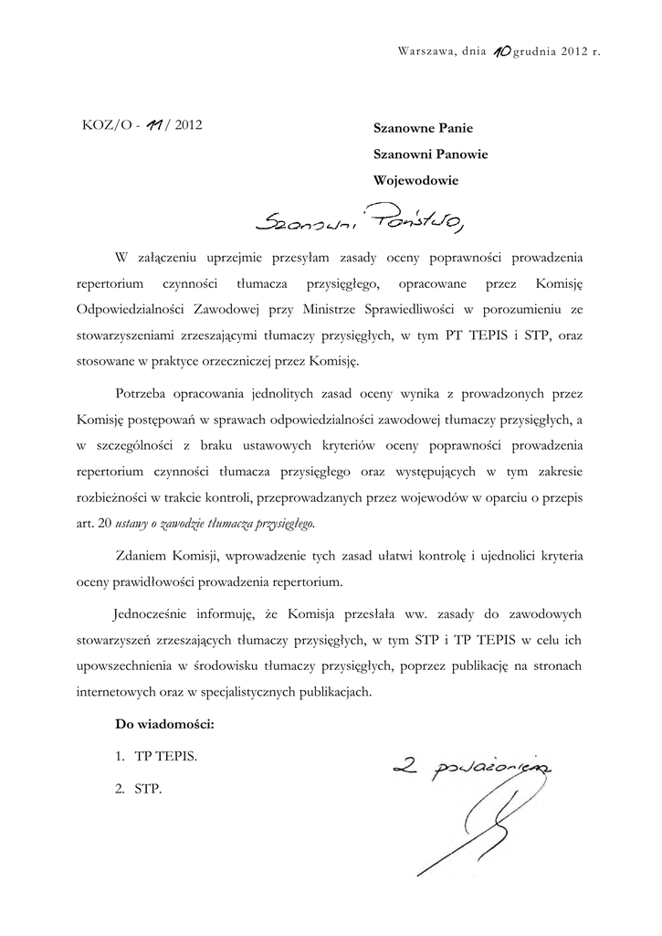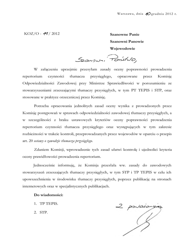 Warszawa, d nia KOZ/O - / 2012 grud nia 2012 r. Szanowne Panie Szanowni Panowie Wojewodowie W załączeniu uprzejmie przesyłam zasady oceny poprawności prowadzenia repertorium czynności tłumacza przysięgłego, opracowane przez Komisję Odpowiedzialności Zawodowej przy Ministrze Sprawiedliwości w porozumieniu ze stowarzyszeniami zrzeszającymi tłumaczy przysięgłych, w tym PT TEPIS i STP, oraz stosowane w praktyce orzeczniczej przez Komisję. Potrzeba opracowania jednolitych zasad oceny wynika z prowadzonych przez Komisję postępowań w sprawach odpowiedzialności zawodowej tłumaczy przysięgłych, a w szczególności z braku ustawowych kryteriów oceny poprawności prowadzenia repertorium czynności tłumacza przysięgłego oraz występujących w tym zakresie rozbieżności w trakcie kontroli, przeprowadzanych przez wojewodów w oparciu o przepis art. 20 ustawy o zawodzie tłumacza przysięgłego. Zdaniem Komisji, wprowadzenie tych zasad ułatwi kontrolę i ujednolici kryteria oceny prawidłowości prowadzenia repertorium. Jednocześnie informuję, że Komisja przesłała ww. zasady do zawodowych stowarzyszeń zrzeszających tłumaczy przysięgłych, w tym STP i TP TEPIS w celu ich upowszechnienia w środowisku tłumaczy przysięgłych, poprzez publikację na stronach internetowych oraz w specjalistycznych publikacjach. Do wiadomości: 1. TP TEPIS. 2. STP. W związku z pojawieniem się na rynku wielu błędnie opracowanych wydań repertorium czynności tłumacza przysięgłego zarówno w postaci druków akcydensowych, jak i na nośnikach elektronicznych, Komisja Odpowiedzialności Zawodowej Tłumaczy Przysięgłych przy Ministrze Sprawiedliwości zawiadamia, że stosuje następujące zasady oceny poprawności prowadzenia repertorium czynności tłumacza przysięgłego zgodnie z art. 17 ust. 2 ustawy o zawodzie tłumacza przysięgłego oraz z zaleceniami Kodeksu tłumacza przysięgłego. Zasady te zostały omówione poniżej w kolejności punktów art. 17 ust. 2: 1) „Data przyjęcia zlecenia oraz zwrotu dokumentu wraz z tłumaczeniem" znajduje się w rubryce drugiej repertorium - nazywanej skrótowo „Data zlecenia" oraz w rubryce przedostatniej - nazywanej skrótowo „Zwrot dokumentu", zamiast poprawnie „Zwrot dokumentu wraz z tłumaczeniem". Zarówno data zlecenia, jak i data zwrotu dokumentu wraz z tłumaczeniem, powinny być podane cyframi arabskimi w pełnej formie, tj. z uwzględnieniem dnia, miesiąca i roku, przy czym data zwrotu nie musi być zgodnie z ustawą poświadczona podpisem zleceniodawcy. Dlatego wersje repertorium zawierające w tej rubryce pozycję „podpis" są błędne, zaś brak podpisu zleceniodawcy nie stanowi naruszenia zasad poprawności prowadzenia repertorium. Omawiana pozycja wpisu jest poprzedzona w repertorium pierwszą rubryką, opatrzoną skrótem „Lp." oznaczającym liczbę porządkową, która jest numerem kolejnym wpisu do repertorium. Liczba porządkowa powinna być pisana cyframi arabskimi, którymi oznacza się wpisy dokonywane od pierwszego do ostatniego dnia danego roku, dla każdego roku oddzielnie. Liczba porządkowa wpisu dotyczy zawsze jednego dokumentu, wpisywanie kilku dokumentów pod jednym numerem nie jest praktyką właściwą. „Oznaczenie zleceniodawcy albo zamawiającego wykonanie oznaczonego tłumaczenia" nie jest równoznaczne z błędnym określeniem występującym w różnych wersjach repertorium jako „nazwisko (nazwa) i adres zleceniodawcy". Pomijając bowiem brak rozróżnienia między zleceniodawcą a zamawiającym, wyraz „oznaczenie" należy rozumieć wyłącznie jako imię i nazwisko osoby fizycznej lub nazwę osoby prawnej lub firmy. Można podać imię i nazwisko osoby będącej przedstawicielem osoby prawnej lub firmy. Umieszczanie w tej rubryce adresu zleceniodawcy lub zamawiającego nie jest więc obowiązkowe i brak tego elementu nie stanowi naruszenia zasad poprawności. 2) „Opis tłumaczonego dokumentu, wskazujący nazwę, datę, oznaczenie dokumentu, język, w którym go sporządzono, osobę lub instytucję, która sporządziła dokument, oraz uwagi o jego rodzaju, formie i stanie" obejmuje kilka kolejnych rubryk, które są omówione w kolejności ich występowania w ustawie. Rubryka „Nazwa, data i oznaczenie dokumentu". Jeśli nazwa dokumentu (np. skrócony odpis aktu urodzenia, dyplom ukończenia studiów wyższych) w ogóle nie występuje, co ma miejsce zwłaszcza w dokumentach obcojęzycznych, należy wpisać rodzaj dokumentu, określając go według własnego uznania (np. świadectwo szkolne, zaświadczenie). „Data dokumentu", podobnie jak w innych rubrykach, powinna być pełna, tj. podająca cyframi arabskimi dzień, miesiąc i rok. Natomiast zamiast „oznaczenie dokumentu" pojawia się błędny element w nazwie tej rubryki: „numer dokumentu". Oczywiście numer dokumentu może być w tej rubryce wpisany jako oznaczenie dokumentu, jeśli dokument jest opatrzony numerem, jeśli jednak dokument nie ma swojego numeru - należy wpisać każde inne oznaczenie, na przykład składające się z samych liter lub liter i cyfr. W razie braku daty lub oznaczenia dokumentu, należy ten fakt odnotować zwrotem „bez oznaczenia" lub skrótami „b.d." albo „b.o.". Rubryka „Język, w którym sporządzono dokument". Poprawny wpis w tej rubryce powinien zawierać każdorazowo co najmniej skróconą nazwę danego języka, nawet jeśli tłumacz ma uprawnienia do tłumaczenia tylko na jeden język obcy i z tego języka. Rubryka „Osoba lub instytucja, która sporządziła dokument". Podobnie jak w rubryce „oznaczenie zleceniodawcy" poprawny wpis w tę rubrykę nie wymaga odnotowania adresu ww. osoby lub instytucji. W przypadku występowania kilku osób lub instytucji sporządzających dokument wystarczy wymienić jedną z nich, najlepiej merytorycznie najważniejszą. . Rubryka „Uwagi o rodzaju, formie i stanie dokumentu". Jeśli rodzaj dokumentu nie jest podany w jego nazwie (patrz rubr