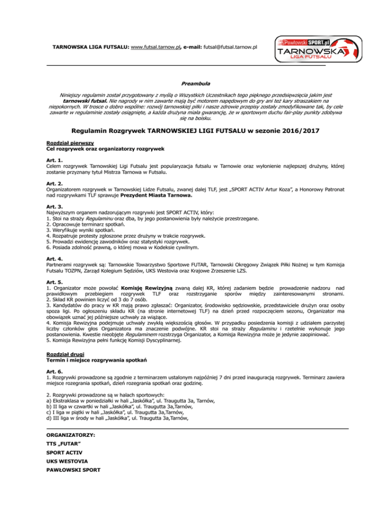 TARNOWSKA LIGA FUTSALU: www.futsal.tarnow.pl, e-mail: [email protected] Preambuła Niniejszy regulamin został przygotowany z myślą o Wszystkich Uczestnikach tego pięknego przedsięwzięcia jakim jest tarnowski futsal. Nie nagrody w nim zawarte mają być motorem napędowym do gry ani też kary straszakiem na niepokornych. W trosce o dobro wspólne: rozwój tarnowskiej piłki i nasze zdrowie przepisy zostały zmodyfikowane tak, by cele zawarte w regulaminie zostały osiągnięte, a każda drużyna miała gwarancję, że w sportowym duchu fair-play punkty zdobywa się na boisku. Regulamin Rozgrywek TARNOWSKIEJ LIGI FUTSALU w sezonie 2016/2017 Rozdział pierwszy Cel rozgrywek oraz organizatorzy rozgrywek Art. 1. Celem rozgrywek Tarnowskiej Ligi Futsalu jest popularyzacja futsalu w Tarnowie oraz wyłonienie najlepszej drużyny, której zostanie przyznany tytuł Mistrza Tarnowa w Futsalu. Art. 2. Organizatorem rozgrywek w Tarnowskiej Lidze Futsalu, zwanej dalej TLF, jest „SPORT ACTIV Artur Koza”, a Honorowy Patronat nad rozgrywkami TLF sprawuje Prezydent Miasta Tarnowa. Art. 3. Najwyższym organem nadzorującym rozgrywki jest SPORT ACTIV, który: 1. Stoi na straży Regulaminu oraz dba, by jego postanowienia były należycie przestrzegane. 2. Opracowuje terminarz spotkań. 3. Weryfikuje wyniki spotkań. 4. Rozpatruje protesty zgłoszone przez drużyny w trakcie rozgrywek. 5. Prowadzi ewidencję zawodników oraz statystyki rozgrywek. 6. Posiada zdolność prawną, o której mowa w Kodeksie cywilnym. Art. 4. Partnerami rozgrywek są: Tarnowskie Towarzystwo Sportowe FUTAR, Tarnowski Okręgowy Związek Piłki Nożnej w tym Komisja Futsalu TOZPN, Zarząd Kolegium Sędziów, UKS Westovia oraz Krajowe Zrzeszenie LZS. Art. 5. 1. Organizator może powołać Komisję Rewizyjną zwaną dalej KR, której zadaniem będzie prowadzenie nadzoru nad prawidłowym przebiegiem rozgrywek TLF oraz rozstrzyganie sporów między zainteresowanymi stronami. 2. Skład KR powinien liczyć od 3 do 7 osób. 3. Kandydatów do pracy w KR mają prawo zgłaszać: Organizator, środowisko sędziowskie, przedstawiciele drużyn oraz osoby spoza ligi. Po ogłoszeniu składu KR (na stronie internetowej TLF) na dzień przed rozpoczęciem sezonu, Organizator ma obowiązek uznać jej późniejsze uchwały za wiążące. 4. Komisja Rewizyjna podejmuje uchwały zwykłą większością głosów. W przypadku posiedzenia komisji z udziałem parzystej liczby członków głos Organizatora ma znaczenie podwójne. KR stoi na straży Regulaminu i rzetelnie wykonuje jego postanowienia. Kwestie nieobjęte Regulaminem rozstrzyga Organizator, a Komisja Rewizyjna może je jedynie zaopiniować. 5. Komisja Rewizyjna pełni funkcję Komisji Dyscyplinarnej. Rozdział drugi Termin i miejsce rozgrywania spotkań Art. 6. 1. Rozgrywki prowadzone są zgodnie z terminarzem ustalonym najpóźniej 7 dni przed inauguracją rozgrywek. Terminarz zawiera miejsce rozegrania spotkań, dzień rozegrania spotkań oraz godzinę. 2. Rozgrywki prowadzone są w halach sportowych: a) Ekstraklasa w poniedziałki w hali „Jaskółka”, ul. Traugutta 3a, Tarnów, b) II liga w czwartki w hali „Jaskółka”, ul. Traugutta 3a,Tarnów, c) I liga w piątki w hali „Jaskółka”, ul. Traugutta 3a,Tarnów, d) III liga w środy w hali „Jaskółka”, ul. Traugutta 3a,Tarnów, ORGANIZATORZY: TTS „FUTAR” SPORT ACTIV UKS WESTOVIA PAWŁOWSKI SPORT TARNOWSKA LIGA FUTSALU: www.futsal.tarnow.pl, e-mail: [email protected] 3. W sytuacjach szczególnych spotkania mogą zostać przeniesione na jedną z wymienionych wyżej hal. 4. Spotkanie można przełożyć za zgodą kierownictwa rywalizujących drużyn. W takim wypadku na drużynę składającą wniosek o przełożenie meczu spada odpowiedzialność za zarezerwowanie hali, opłacenie sędziów oraz dostarczenie protokołu meczowego do organizatora rozgrywek. Ekwiwalent dla jednego sędziego wynosi w takim przypadku 30 zł. 5. Przełożone spotkania powinny zostać rozegrane najpóźniej na dwie kolejki przed końcem sezonu. Ostatnie dwie kolejki spotkań w sezonie powinny być rozegrane w dniach przewidzianych w terminarzu. 6. W przypadkach szczególnych Organizator ma prawo nakazać zespołom rozegranie spotkania w innym terminie niezależnie od zgody kierownictwa zainteresowanych drużyn. 7. Rozgrywki TLF mogą być dokumentowane zdjęciami i filmami przez podmioty mające zezwolenie Organizatora. Organizator posiada wyłączność na udostępnianie i publikację zdjęć i filmów ze spotkań TLF. 8. Uczestnicy TLF, którzy zostali uwzględnieni w dokumentach: Formularz Zgłoszeniowy, Kwestionariusz Osobowy, Protokół Meczowy itp. wydanych przez Organizatora, wyrażają zgodę na publikację zdjęć i filmów ze swoim udziałem w internecie, a także za pośrednictwem telewizji i innych mediów posiadających zezwolenie Organizatora. Rozdział trzeci Warunki uczestnictwa drużyn w rozgrywkach Art. 7. Do rozgrywek zostają dopuszczone zespoły, które w terminie ustalonym przez organizatora: 1. Przedstawią pisemne zgłoszenie „Formularz Zgłoszeniowy”, które zawiera: dokładną nazwę drużyny, imię i nazwisko oraz numer telefonu przedstawiciela drużyny (Menedżera Drużyny). 2. Przedstawią aktualne badania lekarskie zawodników lub oświadczenie o dobrym stanie zdrowia i niewystępowaniu przeciwwskazań do uprawiania sportu oraz uczestnictwa w rozgrywkach na własną odpowiedzialność. 3. Przedłożą przed pierwszym spotkaniem wypełnioną Kartę Drużyny. 4. Dokonają wpłaty u Organizatora lub wyznaczonego przedstawiciela wg stawek dla danej ligi. Art. 8. 1. Przyjęcie przez Organizatora Formularza Zgłoszeniowego, o którym mowa w art. 7 pkt 1 wywołuje skutki prawne zgodnie z art. 56 Kodeksu cywilnego. Od tej chwili istnieje stosunek cywilnoprawny w formie zobowiązania, które zgodnie z art. 353 Kodeksu cywilnego „polega na tym, że wierzyciel może żądać od dłużnika świadczenie, a dłużnik pow