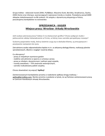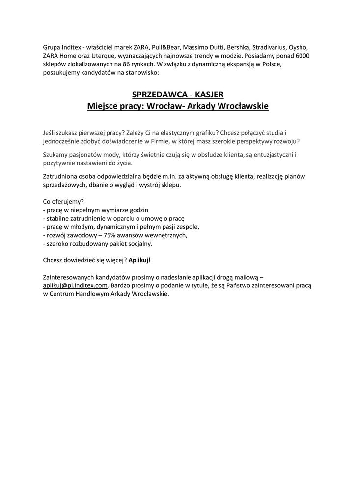Grupa Inditex - właściciel marek ZARA, Pull&Bear, Massimo Dutti, Bershka, Stradivarius, Oysho, ZARA Home oraz Uterque, wyznaczających najnowsze trendy w modzie. Posiadamy ponad 6000 sklepów zlokalizowanych na 86 rynkach. W związku z dynamiczną ekspansją w Polsce, poszukujemy kandydatów na stanowisko: SPRZEDAWCA - KASJER Miejsce pracy: Wrocław- Arkady Wrocławskie Jeśli szukasz pierwszej pracy? Zależy Ci na elastycznym grafiku? Chcesz połączyć studia i jednocześnie zdobyć doświadczenie w Firmie, w której masz szerokie perspektywy rozwoju? Szukamy pasjonatów mody, którzy świetnie czują się w obsłudze klienta, są entuzjastyczni i pozytywnie nastawieni do życia. Zatrudniona osoba odpowiedzialna będzie m.in. za aktywną obsługę klienta, realizację planów sprzedażowych, dbanie o wygląd i wystrój sklepu. Co oferujemy? - pracę w niepełnym wymiarze godzin - stabilne zatrudnienie w oparciu o umowę o pracę - pracę w młodym, dynamicznym i pełnym pasji zespole, - rozwój zawodowy – 75% awansów wewnętrznych, - szeroko rozbudowany pakiet socjalny. Chcesz dowiedzieć się więcej? Aplikuj! Zainteresowanych kandydatów prosimy o nadesłanie aplikacji drogą mailową – [email protected]. Bardzo prosimy o podanie w tytule, że są Państwo zainteresowani pracą w Centrum Handlowym Arkady Wrocławskie.