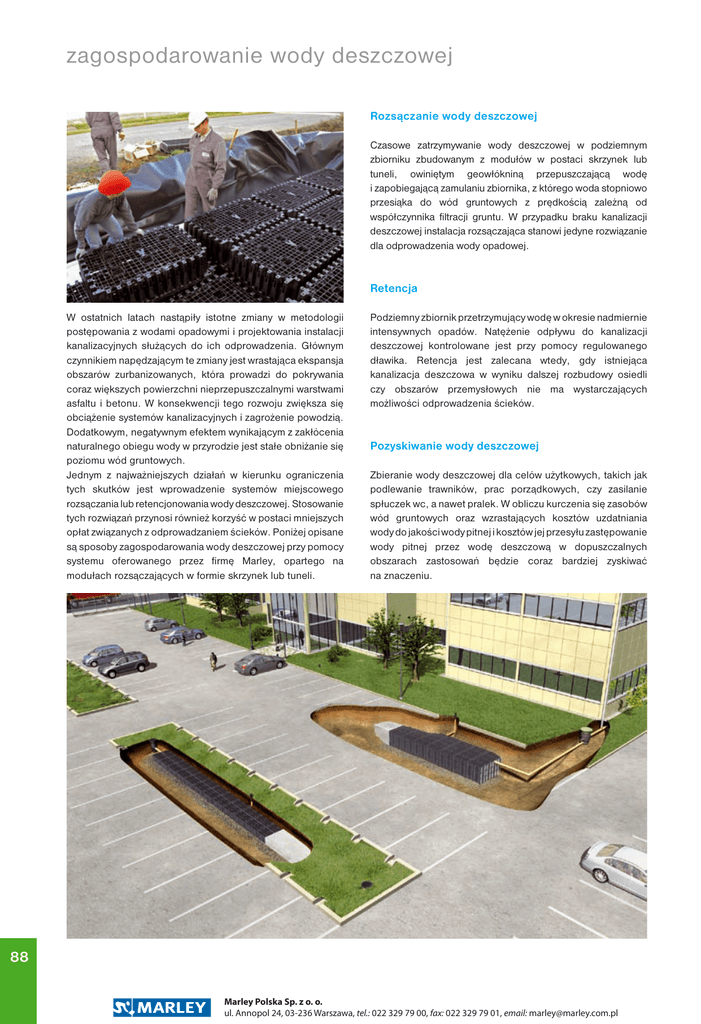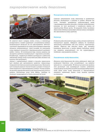 zagospodarowanie wody deszczowej Rozsączanie wody deszczowej Czasowe zatrzymywanie wody deszczowej w podziemnym zbiorniku zbudowanym z modułów w postaci skrzynek lub tuneli, owiniętym geowłókniną przepuszczającą wodę i zapobiegającą zamulaniu zbiornika, z którego woda stopniowo przesiąka do wód gruntowych z prędkością zależną od współczynnika filtracji gruntu. W przypadku braku kanalizacji deszczowej instalacja rozsączająca stanowi jedyne rozwiązanie dla odprowadzenia wody opadowej. Retencja W ostatnich latach nastąpiły istotne zmiany w metodologii postępowania z wodami opadowymi i projektowania instalacji kanalizacyjnych służących do ich odprowadzenia. Głównym czynnikiem napędzającym te zmiany jest wrastająca ekspansja obszarów zurbanizowanych, która prowadzi do pokrywania coraz większych powierzchni nieprzepuszczalnymi warstwami asfaltu i betonu. W konsekwencji tego rozwoju zwiększa się obciążenie systemów kanalizacyjnych i zagrożenie powodzią. Dodatkowym, negatywnym efektem wynikającym z zakłócenia naturalnego obiegu wody w przyrodzie jest stałe obniżanie się poziomu wód gruntowych. Jednym z najważniejszych działań w kierunku ograniczenia tych skutków jest wprowadzenie systemów miejscowego rozsączania lub retencjonowania wody deszczowej. Stosowanie tych rozwiązań przynosi również korzyść w postaci mniejszych opłat związanych z odprowadzaniem ścieków. Poniżej opisane są sposoby zagospodarowania wody deszczowej przy pomocy systemu oferowanego przez firmę Marley, opartego na modułach rozsączających w formie skrzynek lub tuneli. Podziemny zbiornik przetrzymujący wodę w okresie nadmiernie intensywnych opadów. Natężenie odpływu do kanalizacji deszczowej kontrolowane jest przy pomocy regulowanego dławika. Retencja jest zalecana wtedy, gdy istniejąca kanalizacja deszczowa w wyniku dalszej rozbudowy osiedli czy obszarów przemysłowych nie ma wystarczających możliwości odprowadzenia ścieków. Pozyskiwanie wody deszczowej Zbieranie wody deszczowej dla celów użytkowych, takich jak podlewanie trawników, prac porządkowych, czy zasilanie spłuczek wc, a nawet pralek. W obliczu kurczenia się zasobów wód gruntowych oraz wzrastających kosztów uzdatniania wody do jakości wody pitnej i kosztów jej przesyłu zastępowanie wody pitnej przez wodę deszczową w dopuszczalnych obszarach zastosowań będzie coraz bardziej zyskiwać na znaczeniu. 88 Marley Polska Sp. z o. o. ul. Annopol 24, 03-236 Warszawa, tel.: 022 329 79 00, fax: 022 329 79 01, email: [email protected] moduły rozsączające Skrzynki rozsączające służą do odwodnienia powierzchni dachów, placów oraz dróg w obiektach użyteczności publicznej oraz przemysłowych, jak również w budownictwie indywidualnym. Skrzynki można swobodnie łączyć wzdłuż i poprzecznie oraz w pionie osiągając dowolną potrzebną objętość. Kolumnowa konstrukcja jest w stanie wytrzymać duże obciążenia – przy przykryciu 800 mm warstwą ziemi dopuszczalny jest ruch samochodów ciężarowych po nawierzchni ponad instalacją. szerokość wysokość długość 600 420 1200 Dlatego można w dowolny sposób wykorzystać teren ponad skrzynkami, np.: na parking, wjazd lub powierzchnię składowania. Instalacje rozsączające na bazie skrzynek są o wiele bardziej wydajne od tradycyjnych metod. Skrzynka rozsączająca 300 l posiada 3-krotnie większą objętość magazynującą niż odwadniający rów żwirowy, czyli jeden moduł zastępuje ok. 800 kg żwiru lub ewentualnie 30 mb rury drenarskiej o przekroju ø 110. obciążenie podłączenia* długotrwałe ø 110 ø 160 index skrzynka rozsączająca 300 l, PP 360010 5 t / m² * – przyłącze dla rury o większej średnicy na specjalne zamówienie przykrycie ziemią przy obciążeniu ruchem samochodów ciężarowych: min. 800 mm maksymalna głębokość posadowienia: 5000 mm (spód skrzynki) obciążenie krótkotrwałe: 10 t/m² obciążenie długotrwałe: 5 t/m² Warunki posadowienia w zależności od obciążenia na powierzchni są dokładnie podane na str. 9 opakowanie index 10 szt. w opakowaniu 50 szt. w opakowaniu 369012 369021 index opakowanie rolka 2,5 x 50 m rolka 2,5 x 100 m rolka 4,0 x 175 m DT20/125 TS50/250 TS50/700 typ masa powierzchniowa wytrzymałość na rozciąganie wodoprzepuszczalność DT 20 TS 50 200g / m² 200g / m² 9 kN / m 15 kN / m 130 mm / s 75 mm / s wysokość średnica 550 110 geowłóknina index wywietrznik ø 110 202004 zagospodarowanie wody deszczowej typ DT 20 TS 50 TS 50 łącznik skrzynek 89 Marley Polska Sp. z o. o. ul. Annopol 24, 03-236 Warszawa, tel.: 022 329 79 00, fax: 022 329 79 01, email: [email protected] moduły rozsączające Tunel rozsączający 300 l służy do retencji i rozsączania wód opadowych odprowadzonych z dachów oraz powierzchni trwałych wokół budynków. Modułowa budowa tuneli pozwala łatwo je ze sobą łączyć w ciągi o dowolnej potrzebnej długości i pojemności, zamknięte z obu końców specjalnymi płytami. Ciągi tuneli można ustawiać równolegle, w jednej warstwie, jak również można łączyć je spodami otrzymując przez to dwukrotnie większą pojemność retencyjną na tej samej powierzchni. Przy wadze modułu 11 kg układanie nie sprawia żadnych trudności. Możliwe jest dowolne wykorzystanie powierzchni terenu ponad tunelem, ponieważ wytrzymuje on długotrwałe obciążenie 3,5 t/m2 (ruch samochodów osobowych). Dzięki specjalnej konstrukcji tunele można łatwo układać w stosy. Na jednej europalecie mieści się w ten sposób do 40 tuneli (12 000 l pojemności magazynującej), co pozwala zaoszczędzić na kosztach transportu i składowania. tunel rozsączający 300 l, PP szerokość wysokość 800 długość 510 podłączenia górne obciążenie długotrwałe index ø 110 ø 200 3,5 t / m² 230010 1160 przykrycie ziemią przy obciążeniu ruchem samochodów osobowych: min. 500 mm maksymalna głębokość posadowienia: 2