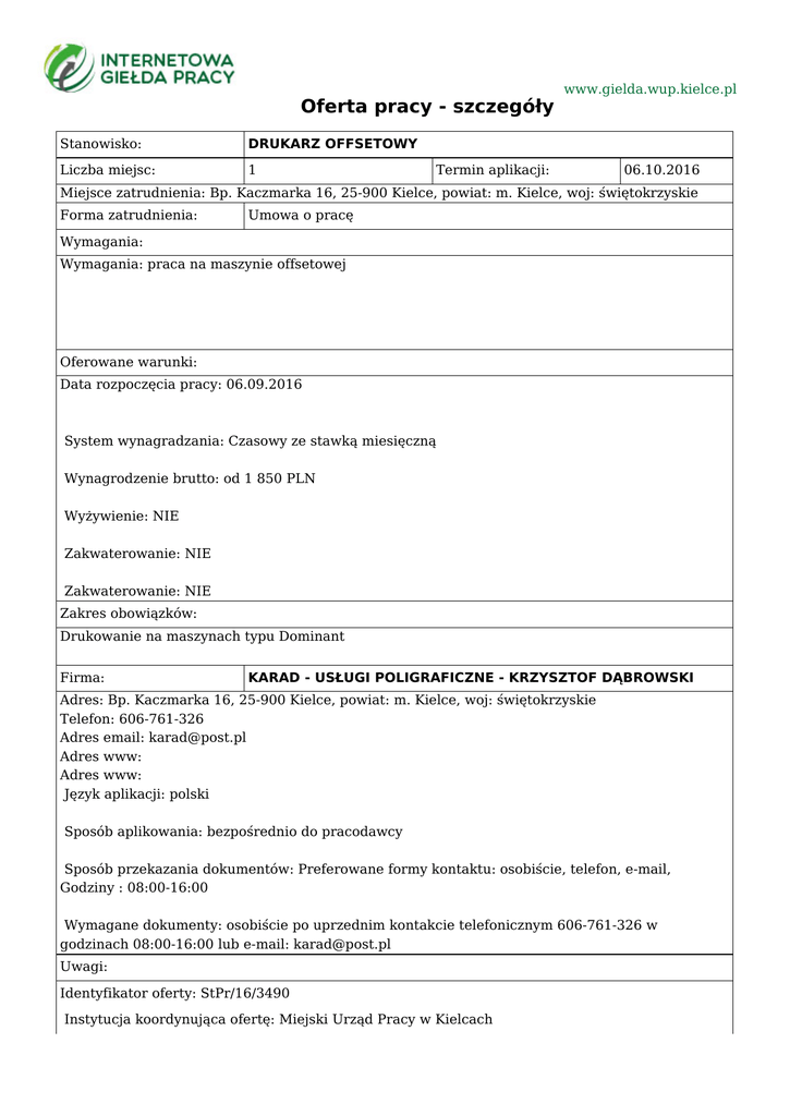 Oferta pracy - szczegóły Stanowisko: DRUKARZ OFFSETOWY Liczba miejsc: 1 www.gielda.wup.kielce.pl Termin aplikacji: 06.10.2016 Miejsce zatrudnienia: Bp. Kaczmarka 16, 25-900 Kielce, powiat: m. Kielce, woj: świętokrzyskie Forma zatrudnienia: Umowa o pracę Wymagania: Wymagania: praca na maszynie offsetowej Oferowane warunki: Data rozpoczęcia pracy: 06.09.2016 System wynagradzania: Czasowy ze stawką miesięczną Wynagrodzenie brutto: od 1 850 PLN Wyżywienie: NIE Zakwaterowanie: NIE Zakwaterowanie: NIE Zakres obowiązków: Drukowanie na maszynach typu Dominant Firma: KARAD - USŁUGI POLIGRAFICZNE - KRZYSZTOF DĄBROWSKI Adres: Bp. Kaczmarka 16, 25-900 Kielce, powiat: m. Kielce, woj: świętokrzyskie Telefon: 606-761-326 Adres email: [email protected] Adres www: Adres www: Język aplikacji: polski Sposób aplikowania: bezpośrednio do pracodawcy Sposób przekazania dokumentów: Preferowane formy kontaktu: osobiście, telefon, e-mail, Godziny : 08:00-16:00 Wymagane dokumenty: osobiście po uprzednim kontakcie telefonicznym 606-761-326 w godzinach 08:00-16:00 lub e-mail: [email protected] Uwagi: Identyfikator oferty: StPr/16/3490 Instytucja koordynująca ofertę: Miejski Urząd Pracy w Kielcach Urząd Pracy dokłada wszelkich starań, aby oferty pracy będące w zasobach urzędu, były rzetelne i wiarygodne. Ponieważ wszystkie oferty pracy pochodzą od osób trzecich Urząd Pracy zastrzega, że odpowiedzialność za ewentualne rozbieżności pomiędzy warunkami pracy zaprezentowanymi w niniejszej ofercie a warunkami zaproponowanymi przez potencjalnego pracodawcę ponosi pracodawca.
