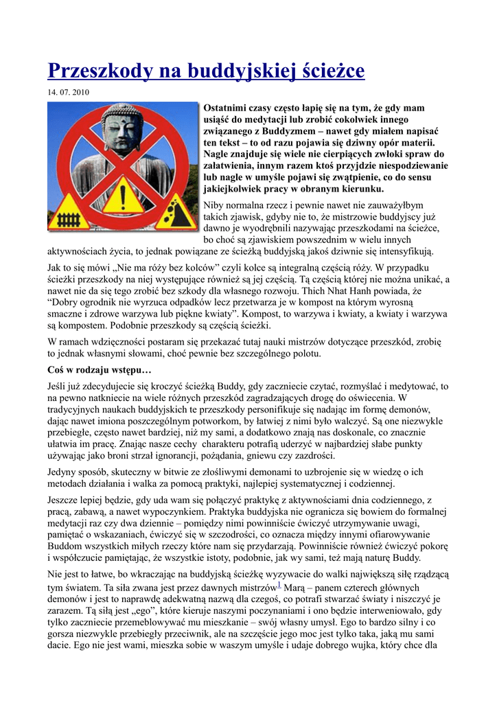 Przeszkody na buddyjskiej ścieżce 14. 07. 2010 Ostatnimi czasy często łapię się na tym, że gdy mam usiąść do medytacji lub zrobić cokolwiek innego związanego z Buddyzmem – nawet gdy miałem napisać ten tekst – to od razu pojawia się dziwny opór materii. Nagle znajduje się wiele nie cierpiących zwłoki spraw do załatwienia, innym razem ktoś przyjdzie niespodziewanie lub nagle w umyśle pojawi się zwątpienie, co do sensu jakiejkolwiek pracy w obranym kierunku. Niby normalna rzecz i pewnie nawet nie zauważyłbym takich zjawisk, gdyby nie to, że mistrzowie buddyjscy już dawno je wyodrębnili nazywając przeszkodami na ścieżce, bo choć są zjawiskiem powszednim w wielu innych aktywnościach życia, to jednak powiązane ze ścieżką buddyjską jakoś dziwnie się intensyfikują. Jak to się mówi „Nie ma róży bez kolców” czyli kolce są integralną częścią róży. W przypadku ścieżki przeszkody na niej występujące również są jej częścią. Tą częścią której nie można unikać, a nawet nie da się tego zrobić bez szkody dla własnego rozwoju. Thich Nhat Hanh powiada, że “Dobry ogrodnik nie wyrzuca odpadków lecz przetwarza je w kompost na którym wyrosną smaczne i zdrowe warzywa lub piękne kwiaty”. Kompost, to warzywa i kwiaty, a kwiaty i warzywa są kompostem. Podobnie przeszkody są częścią ścieżki. W ramach wdzięczności postaram się przekazać tutaj nauki mistrzów dotyczące przeszkód, zrobię to jednak własnymi słowami, choć pewnie bez szczególnego polotu. Coś w rodzaju wstępu… Jeśli już zdecydujecie się kroczyć ścieżką Buddy, gdy zaczniecie czytać, rozmyślać i medytować, to na pewno natkniecie na wiele różnych przeszkód zagradzających drogę do oświecenia. W tradycyjnych naukach buddyjskich te przeszkody personifikuje się nadając im formę demonów, dając nawet imiona poszczególnym potworkom, by łatwiej z nimi było walczyć. Są one niezwykle przebiegłe, często nawet bardziej, niż my sami, a dodatkowo znają nas doskonale, co znacznie ułatwia im pracę. Znając nasze cechy charakteru potrafią uderzyć w najbardziej słabe punkty używając jako broni strzał ignorancji, pożądania, gniewu czy zazdrości. Jedyny sposób, skuteczny w bitwie ze złośliwymi demonami to uzbrojenie się w wiedzę o ich metodach działania i walka za pomocą praktyki, najlepiej systematycznej i codziennej. Jeszcze lepiej będzie, gdy uda wam się połączyć praktykę z aktywnościami dnia codziennego, z pracą, zabawą, a nawet wypoczynkiem. Praktyka buddyjska nie ogranicza się bowiem do formalnej medytacji raz czy dwa dziennie – pomiędzy nimi powinniście ćwiczyć utrzymywanie uwagi, pamiętać o wskazaniach, ćwiczyć się w szczodrości, co oznacza między innymi ofiarowywanie Buddom wszystkich miłych rzeczy które nam się przydarzają. Powinniście również ćwiczyć pokorę i współczucie pamiętając, że wszystkie istoty, podobnie, jak wy sami, też mają naturę Buddy. Nie jest to łatwe, bo wkraczając na buddyjską ścieżkę wyzywacie do walki największą siłę rządzącą tym światem. Ta siła zwana jest przez dawnych mistrzów1 Marą – panem czterech głównych demonów i jest to naprawdę adekwatną nazwą dla czegoś, co potrafi stwarzać światy i niszczyć je zarazem. Tą siłą jest „ego”, które kieruje naszymi poczynaniami i ono będzie interweniowało, gdy tylko zaczniecie przemeblowywać mu mieszkanie – swój własny umysł. Ego to bardzo silny i co gorsza niezwykle przebiegły przeciwnik, ale na szczęście jego moc jest tylko taka, jaką mu sami dacie. Ego nie jest wami, mieszka sobie w waszym umyśle i udaje dobrego wujka, który chce dla was jak najlepiej, tymczasem to „najlepiej” jest dobre tylko dla niego, a was coraz bardziej pogrąża w Samarze. Jeśli usłyszycie w umyśle słowa „ja chcę, to jest fajne, potrzebuję tego, to jest moje” to na pewno będzie wasz „dobry wujek ego”. Podobnie będzie jeśli usłyszycie: - Jaka ja jestem postępowa - Moherowe bereciki są infantylne - Ale ona ma obciachową kieckę - Buddyzm jest najlepszy albo: - Jestem wspaniały, taki piękny i mądry - O czym on mówi, ja już to wiem - jestem dobrym buddystą - Napiszę książkę i będę sławny… (coś mi to przypomina) To też będzie ten dobry wujek, tak dobry i szczery jak dobry był wujaszek Stalin, Hitler, czy inni, podobni im mili panowie. Celowo rozpisałem się o ego, bo to właśnie ono rzuca nam kłody pod nogi gdy kroczymy na buddyjskiej ścieżce. Wszystkie, nawet te pozornie zewnętrzne pochodzą z naszego zwykłego umysłu sterowanego przez egoizm. Wszyscy praktykujący, czy to dawniej, czy obecnie napotykają i napotykać będą te same przeszkody, bowiem umysł działa zawsze tak samo. Trzeba je znać, by kiedyś nie okazało się, że miast drogą Buddy kroczymy całkiem inną ścieżką wprost do świata demonów. Jakich więc przeszkód możemy się spodziewać? 1. LENISTWO Pierwszą i najbardziej powszechną przeszkodą jest lenistwo, które za swoje usprawiedliwienie ma aktywności tak zwanej szarej codzienności. To taka naturalna prawidłowość, że zawsze na początku mamy w sobie wiele zapału do pracy i wiele ufności w ścieżkę, która jednak wraz z upływem czasu słabnie i słabnie. Zapał pojawia się znowu, gdy spotykamy się z mistrzem, słuchamy wykładu lub przeczytamy jakąś naprawdę inspirującą książkę o buddyzmie. Potem jednak znowu pojawia się szara rzeczywistość – nauka, praca, codzienne obowiązki i należne przyjemności. Zaczynamy odkładać praktykę na później, najpierw na jutro, potem na weekend, na wakacje… Przychodzimy z pracy, zmęczeni – trzeba odpocząć, później trzeba przemyśleć kilka spraw związanych z finansami, zjeść obiadek, posprzątać iść do sklepu na zakupy, zrobić plany na jutro, zaplanować sobie wycieczkę weekendową. Przychodzi żona z pracy wypadałoby pobyć 