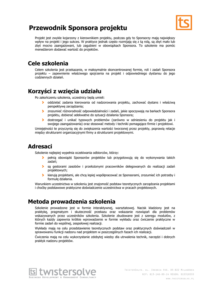 Przewodnik Sponsora projektu Projekt jest zwykle kojarzony z kierownikiem projektu, podczas gdy to Sponsorzy mają największy wpływ na projekt i jego sukces. W praktyce jednak często rozmijają się z tą rolą, są zbyt mało lub zbyt mocno zaangażowani, lub zagubieni w obowiązkach Sponsora. To szkolenie ma pomóc menedżerom dodawać wartość do projektów. Cele szkolenia Celem szkolenia jest przekazanie, w maksymalnie skoncentrowanej formie, roli i zadań Sponsora projektu – zapewnienie właściwego spojrzenia na projekt i odpowiedniego dystansu do jego codziennych działań. Korzyści z wzięcia udziału Po zakończeniu szkolenia, uczestnicy będą umieli: oddzielać zadania kierowania od nadzorowania projektu, zachować dystans i właściwą perspektywę zarządzania; zrozumieć różnorodność odpowiedzialności i zadań, jakie spoczywają na barkach Sponsora projektu, dobierać adekwatne do sytuacji działania Sponsora; dostrzegać i unikać typowych problemów (zarówno w odniesieniu do projektu jak i swojego zaangażowania) oraz stosować metody i techniki pomagające firmie i projektowi. Umiejętności te przyczynią się do zwiększenia wartości tworzonej przez projekty, poprawią relacje między strukturami organizacyjnymi firmy a strukturami projektowymi. Adresaci Szkolenie najlepiej wypełnia oczekiwania odbiorców, którzy: pełnią obowiązki Sponsorów projektów lub przygotowują się do wykonywania takich zadań; są gestorami zasobów i przełożonymi pracowników delegowanych do realizacji zadań projektowych; kierują projektami, ale chcą lepiej współpracować ze Sponsorami, zrozumieć ich potrzeby i formułę działania. Warunkiem uczestnictwa w szkoleniu jest znajomość podstaw teoretycznych zarządzania projektami i choćby podstawowe praktyczne doświadczenie uczestnictwa w pracach projektowych. Metoda prowadzenia szkolenia Szkolenie prowadzone jest w formie interaktywnej, warsztatowej. Nacisk kładziony jest na praktykę, pragmatyzm i skuteczność przekazu oraz wskazanie rozwiązań dla problemów wskazywanych przez uczestników szkolenia. Szkolenie zbudowane jest z szeregu modułów, z których każdy zapewnia krótkie wprowadzenie w formie wykładu oraz ćwiczenie praktyczne w formie zadań do wspólnej, zespołowej realizacji. Wykłady mają na celu przedstawienie teoretycznych podstaw oraz praktycznych doświadczeń w sprawowaniu funkcji nadzoru nad projektem w poszczególnych fazach ich realizacji. Ćwiczenia mają na celu wykorzystanie zdobytej wiedzy dla utrwalenia technik, narzędzi i dobrych praktyk nadzoru projektów. TwisterSolve, ul. Średnia 44A, 05-822 Milanówek NIP: 813-146-89-14 REGON: 015318555 www.twistersolve.pl Tytuł szkolenia: Przewodnik Sponsora projektu Autor: Sebastian Konkol, TwisterSolve 2/2 Zakres szkolenia Tematyka szkolenia: Projekt z perspektywy Sponsora. Różnica między zarządzaniem projektem a nadzorem projektu. Model organizacji projektu, kluczowe role i formuły działań. Wielostronność roli „buldożer”, łącznik. Sponsora projektu. Mentor, przywódca, katalizator, strażnik, Zadania Sponsora projektu. Project Brief i inne zadania wykonywane w czasie inicjowania projektu. Zaangażowanie konieczne w późniejszych fazach. Sponsor a kierownik projektu. Sponsor a zespół projektowy. Komunikacja, motywacja, podtrzymywanie morale. Komunikacja i postępy realizacji projektu. Typowe problemy (środowisko projektu, zespół, kierownik projektu, kierownictwo firmy) i efektywne sposoby ich rozwiązywania. Sponsor jako źródło problemów. Techniki i metody działania skutecznych Sponsorów. Czas trwania: 1 dzień Liczba uczestników: 8-12 osób Trener: Sebastian Konkol Absolwent Instytutu Telekomunikacji Politechniki Warszawskiej oraz zarządzania projektami w George Washington University. Prowadził studia doktoranckie na SWPS (psychologia społeczna, analiza sieci społecznych) i Instytucie Badań Systemowych PAN (kontrola przeciążeń w sieci). Jest wieloletnim praktykiem zarządzania – zarówno w strukturach hierarchicznych jak i projektowych – posiada certyfikaty PMP i Prince2. Prowadzi niezależne doradztwo biznesowe, technologiczne i zarządcze, specjalizując się w sektorach telekomunikacji, nowych mediów elektronicznych i IT. Pomaga tworzyć metody i narzędzia nowoczesnego zarządzania wartością firmy, budować strategie rozwoju biznesu w oparciu o technologie telekomunikacyjne i informatyczne. Ma na koncie kilkadziesiąt projektów zrealizowanych z sukcesem. Jest autorem publikowanych w Polsce i USA opracowań poświęconych skuteczności zarządzania w biznesie, a także książki pt. „Marketing mobilny”. Jest członkiem elitarnego stowarzyszenia Cutter Consortium, twórcą autorskich metod planowania rozwoju informatyki w przedsiębiorstwie oraz refactoringu architektury korporacyjnej. TwisterSolve, ul. Średnia 44A, 05-822 Milanówek NIP: 813-146-89-14 REGON: 015318555 www.twistersolve.pl
