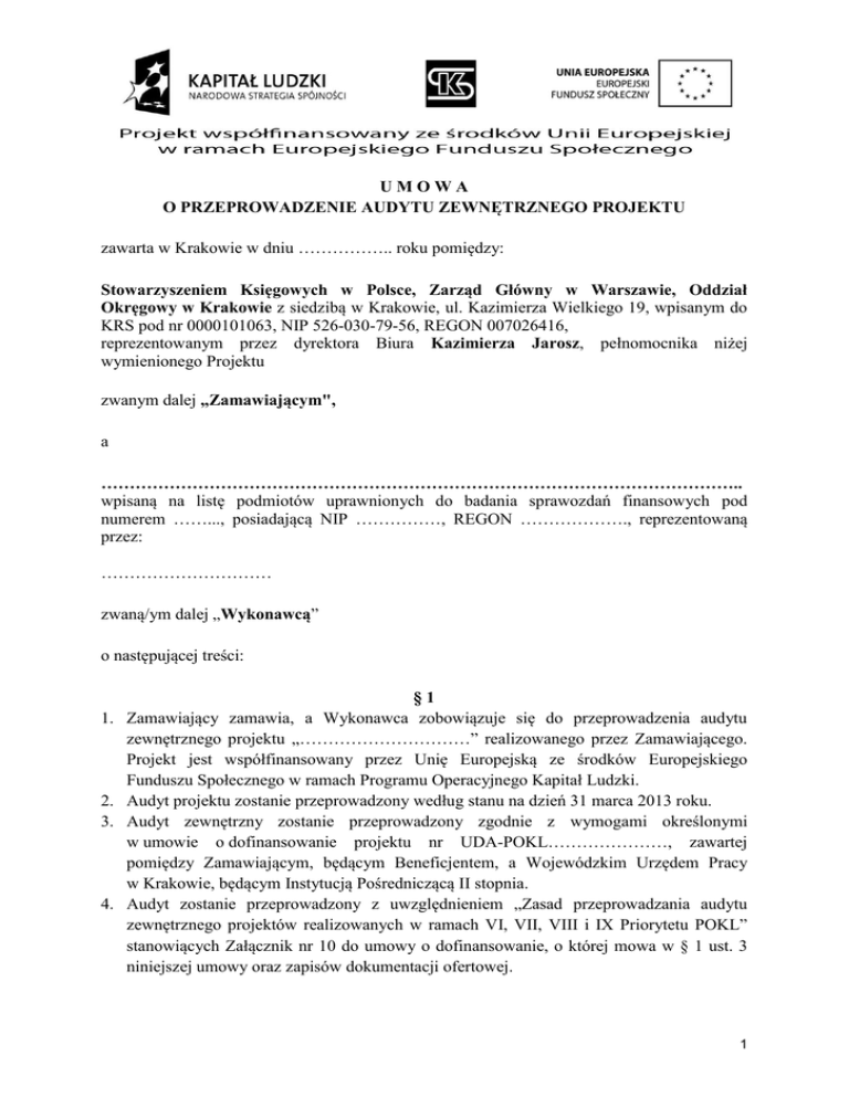 UMOWA O PRZEPROWADZENIE AUDYTU ZEWNĘTRZNEGO PROJEKTU zawarta w Krakowie w dniu …………….. roku pomiędzy: Stowarzyszeniem Księgowych w Polsce, Zarząd Główny w Warszawie, Oddział Okręgowy w Krakowie z siedzibą w Krakowie, ul. Kazimierza Wielkiego 19, wpisanym do KRS pod nr 0000101063, NIP 526-030-79-56, REGON 007026416, reprezentowanym przez dyrektora Biura Kazimierza Jarosz, pełnomocnika niżej wymienionego Projektu zwanym dalej „Zamawiającym", a ………………………………………………………………………………………………….. wpisaną na listę podmiotów uprawnionych do badania sprawozdań finansowych pod numerem ……..., posiadającą NIP ……………, REGON ………………., reprezentowaną przez: ………………………… zwaną/ym dalej „Wykonawcą” o następującej treści: 1. 2. 3. 4. §1 Zamawiający zamawia, a Wykonawca zobowiązuje się do przeprowadzenia audytu zewnętrznego projektu „…………………………” realizowanego przez Zamawiającego. Projekt jest współfinansowany przez Unię Europejską ze środków Europejskiego Funduszu Społecznego w ramach Programu Operacyjnego Kapitał Ludzki. Audyt projektu zostanie przeprowadzony według stanu na dzień 31 marca 2013 roku. Audyt zewnętrzny zostanie przeprowadzony zgodnie z wymogami określonymi w umowie o dofinansowanie projektu nr UDA-POKL…………………, zawartej pomiędzy Zamawiającym, będącym Beneficjentem, a Wojewódzkim Urzędem Pracy w Krakowie, będącym Instytucją Pośredniczącą II stopnia. Audyt zostanie przeprowadzony z uwzględnieniem „Zasad przeprowadzania audytu zewnętrznego projektów realizowanych w ramach VI, VII, VIII i IX Priorytetu POKL” stanowiących Załącznik nr 10 do umowy o dofinansowanie, o której mowa w § 1 ust. 3 niniejszej umowy oraz zapisów dokumentacji ofertowej. 1 5. W przypadku zmiany Zasad, o których mowa w § 1 ust. 4 w trakcie realizacji audytu Zamawiający zobowiązuje się niezwłocznie poinformować Wykonawcę o tym fakcie. 6. Zakres przedmiotowy audytu obejmować będzie w szczególności: a. ocenę prawidłowości rozliczeń finansowych, obejmującą w szczególności: 1. weryfikację na podstawie reprezentatywnej próby oryginałów dokumentów księgowych dokumentujących wydatki poniesione w ramach projektu, które zostały rozliczone w zatwierdzonych wnioskach o płatność i w szczególności wydatków poniesionych w ramach cross-financingu, w tym weryfikację opisu dokumentów księgowych o poniesieniu wydatku w ramach projektu oraz ponoszonych kosztów pośrednich, 2. weryfikację dowodów zapłaty i innych dokumentów potwierdzających fakt zakupu zamówionych towarów i usług, 3. sprawdzenie, czy prowadzona jest wyodrębniona ewidencja wydatków dla projektu zgodnie z zasadami określonymi dla programu operacyjnego w Systemie Realizacji Programu Operacyjnego Kapitał Ludzki 2007-2013, 4. sprawdzenie, czy wkład własny jest wniesiony zgodnie z harmonogramem projektu i jeśli to możliwe, ujęty w wyodrębnionej ewidencji wydatków projektu (w przypadku gdy w projekcie przewidziany jest wkład własny, w tym w przypadku projektów objętych pomocą publiczną), 5. sprawdzenie zgodności przepływów środków pieniężnych z księgami rachunkowymi beneficjenta, 6. sprawdzenie, czy w ramach projektu nie finansuje się zwykłej działalności jednostki realizującej projekt, a jedynie koszty związane z realizacją projektu w ramach POKL, 7. sprawdzenie statusu podatkowego beneficjenta, 8. sprawdzenie prawidłowości przepływów finansowych pomiędzy beneficjentem i partnerem projektu (pomiędzy liderem i partnerem, jeśli dotyczy). b. ocenę sposobu rekrutacji uczestników projektu (sprawdzenie kwalifikowalności przynajmniej 10% uczestników projektu w ramach danego projektu poprzez odniesienie zapisów Szczegółowego Opisu Priorytetów Programu Operacyjnego Kapitał Ludzki 2007-2013, Wytycznych w zakresie kwalifikowania wydatków w ramach POKL, dokumentacji konkursowej oraz założeń projektu do dokumentacji przedłożonej beneficjentowi przez potencjalnych uczestników projektu na etapie ich rekrutacji, np. formularzy, oświadczeń, itp.) c. ocenę przestrzegania zasad przejrzystości i konkurencyjności wydatków, zasady efektywnego zarządzania finansami) 2 d. ocenę przestrzegania zasad ponoszenia kosztów związanych z angażowaniem personelu e. ocenę sposobu pozyskiwania i przechowywania oraz przetwarzania danych o uczestnikach projektu (w ramach Podsystemu PEFS) zgodnie z Ustawą z dnia 29 sierpnia 1997 r. o ochronie danych osobowych, f. ocenę zgodności danych przekazywanych we wniosku o płatność w części dotyczącej postępu rzeczowego, Załącznika nr 2 oraz postępu finansowego z dokumentacją dotyczącą realizacji projektu dostępną w siedzibie beneficjenta (oraz partnera, jeśli dotyczy), g. Ocenę poprawności udzielania pomocy de minimis (jeśli dotyczy), obejmującą w szczególności: 1. zweryfikowanie kompletności i poprawności dokumentacji wymaganej przy ubieganiu się o przyznanie pomocy, 2. zweryfikowanie, czy beneficjent posiada kopię oświadczenia beneficjenta pomocy o kwocie udzielonej pomocy de minimis w ciągu ostatnich trzech lat kalendarzowych (pomoc nie może przekroczyć 200 tys. EUR w ciągu ostatnich trzech lat kalendarzowych), 3. zweryfikowanie, czy beneficjent wydaje zaświadczenia o kwocie udzielonej pomocy de minimis; h. Sprawdzenie, czy beneficjent wdrożył zalecenia przeprowadzonych kontroli oraz usunął nieprawidłowości, jeśli takie zostały wykryte, Sprawdzenie, czy beneficjent posiada ścieżkę audytu w zakresie finansowo – księgowym, Sprawdzenie sposobu realizacji działań promocyjnych, Sprawdzenie sposobu prowadzenia i archiwizacji dokumentacji projektu Sprawdzenie zgodności z właściwymi politykami i zasadami wspólnotowymi (w tym: polityką równych szans i koncepcją zrównoważonego rozwoju). i. j. k
