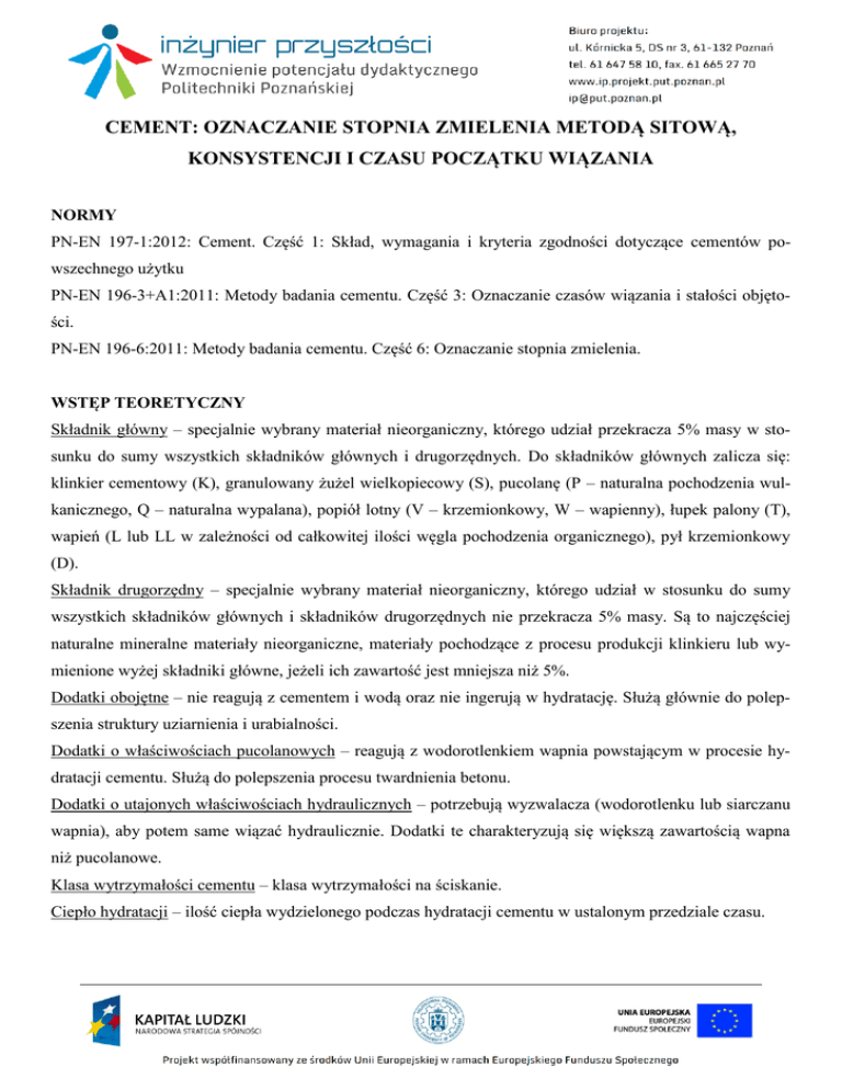 CEMENT: OZNACZANIE STOPNIA ZMIELENIA METODĄ SITOWĄ, KONSYSTENCJI I CZASU POCZĄTKU WIĄZANIA NORMY PN-EN 197-1:2012: Cement. Część 1: Skład, wymagania i kryteria zgodności dotyczące cementów powszechnego użytku PN-EN 196-3+A1:2011: Metody badania cementu. Część 3: Oznaczanie czasów wiązania i stałości objętości. PN-EN 196-6:2011: Metody badania cementu. Część 6: Oznaczanie stopnia zmielenia. WSTĘP TEORETYCZNY Składnik główny – specjalnie wybrany materiał nieorganiczny, którego udział przekracza 5% masy w stosunku do sumy wszystkich składników głównych i drugorzędnych. Do składników głównych zalicza się: klinkier cementowy (K), granulowany żużel wielkopiecowy (S), pucolanę (P – naturalna pochodzenia wulkanicznego, Q – naturalna wypalana), popiół lotny (V – krzemionkowy, W – wapienny), łupek palony (T), wapień (L lub LL w zależności od całkowitej ilości węgla pochodzenia organicznego), pył krzemionkowy (D). Składnik drugorzędny – specjalnie wybrany materiał nieorganiczny, którego udział w stosunku do sumy wszystkich składników głównych i składników drugorzędnych nie przekracza 5% masy. Są to najczęściej naturalne mineralne materiały nieorganiczne, materiały pochodzące z procesu produkcji klinkieru lub wymienione wyżej składniki główne, jeżeli ich zawartość jest mniejsza niż 5%. Dodatki obojętne – nie reagują z cementem i wodą oraz nie ingerują w hydratację. Służą głównie do polepszenia struktury uziarnienia i urabialności. Dodatki o właściwościach pucolanowych – reagują z wodorotlenkiem wapnia powstającym w procesie hydratacji cementu. Służą do polepszenia procesu twardnienia betonu. Dodatki o utajonych właściwościach hydraulicznych – potrzebują wyzwalacza (wodorotlenku lub siarczanu wapnia), aby potem same wiązać hydraulicznie. Dodatki te charakteryzują się większą zawartością wapna niż pucolanowe. Klasa wytrzymałości cementu – klasa wytrzymałości na ściskanie. Ciepło hydratacji – ilość ciepła wydzielonego podczas hydratacji cementu w ustalonym przedziale czasu. Cement – spoiwo hydrauliczne, tj. drobno zmielony materiał nieorganiczny, który po zmieszaniu z wodą tworzy masę, wiążącą i twardniejącą w wyniku reakcji i procesów hydratacji, zachowującą po stwardnieniu wytrzymałość i trwałość także pod wodą. Spoiwo w betonie – składnik, który w wyniku przemian fizycznych, chemicznych lub fizykochemicznych twardnieje, łącząc się w monolityczną całość z kruszywem. Wyróżnia się spoiwa powietrzne i hydrauliczne. Spoiwo powietrzne – spoiwa, dla których procesy wiązania i twardnienia zachodzą tylko na powietrzu. Należą do nich: wapno zwykłe, wapno suchogaszone (hydratyzowane), gips. Spoiwa hydrauliczne – spoiwa, które po zarobieniu wodą ulegają wiązaniu i twardnieniu zarówno na powietrzu, jak i wodzie. Należą do nich: wapno hydrauliczne, cementy. Zaczyn budowlany - mieszanina spoiwa mineralnego z wodą lub innym roztworem. Wyróżnia się zaczyny: cementowe, wapienne, cementowo-wapienne, gipsowe, gipsowo-wapienne. Zaprawa – mieszanina: spoiwa lub lepiszcz (względnie obu tych materiałów), drobnoziarnistych kruszyw, wody lub innej cieczy zarobowej, ewentualnych dodatków i domieszek, poprawiających właściwości zaprawy świeżej lub stwardniałej. Cementy powszechnego użytku dzieli się na pięć głównych rodzajów: CEM I – cement portlandzki, CEM II – cement portlandzki wieloskładnikowy, CEM III – cement hutniczy, CEM IV – cement pucolanowy, CEM V – cement wieloskładnikowy. Rodzaje cementów powszechnego użytku oraz ich skład: Skład (w procentach masya) Składniki główne Główne rodzaje CEM I Nazwa 27 rodzajów cementów powszechnego użytku Klinkier Żużel wielkopiecowy K S Db P Q V W T L LL CEM I 95100 - - - - - - - - - 0-5 CEM II/A-S 80-94 6-20 - - - - - - - - 0-5 CEM II/B-S 65-79 21-35 - - - - - - - - 0-5 Cement portlandzki krzemionkowy CEM II/A-D 90-94 - 6-10 - - - - - - - 0-5 Cement portlandzki CEM II/A-P 80-94 - - 6-20 - - - - - - 0-5 Cement portlandzki Cement portlandzki żużlowy CEM II Popiół lotny Pył krzemionnaturalna krzemionkowy naturalna wypalana kowy wapienny Skład niki drugorzędne Pucolana Łupek palony Wapień pucolanowy Cement portlandzki popiołowy Cement portlandzki łupkowy Cement portlandzki wapienny Cement portlandzki wieloskładnikowyc CEM III CEM IV CEM V Cement hutniczy Cement pucolanowyc Cement wieloskładnikowyc CEM II/B-P 65-79 - - 21-35 - - - - - - 0-5 CEM II/A-Q 80-94 - - - 6-20 - - - - - 0-5 CEM II/B-Q 65-79 - - - 21-35 - - - - - 0-5 CEM II/A-V 80-94 - - - - 6-20 - - - - 0-5 CEM II/B-V 65-79 - - - - 21-35 - - - - 0-5 CEM II/A-W 80-94 - - - - - 6-20 - - - 0-5 CEM II/B-W 65-79 - - - - - 21-35 - - - 0-5 CEM II/A-T 80-94 - - - - - - 6-20 - - 0-5 CEM II/B-T 65-79 - - - - - - 21-35 - - 0-5 CEM II/A-L 80-94 - - - - - - - 6-20 - 0-5 CEM II/B-L 65-79 - - - - - - - 21-35 - 0-5 CEM II/A-LL 80-94 - - - - - - - - 6-20 0-5 CEM II/B-LL 65-79 - - - - - - - - 21-35 0-5 CEM II/A-M 80-88 ---------------------------------------------------------12-20--------------------------------------------- 0-5 CEM II/B-M 65-79 --------------------------------------------------------------21-35---------------------------------------- 0-5 CEM III/A 35-64 36-65 - - - - - - - - 0-5 CEM III/B 20-34 66-80 - - - - - - - - 0-5 CEM III/C 5-19 81-95 - - - - - - - - 0-5 CEM IV/A 65-89 - ---------------------------------11-35-------------------- - - - 0-5 CEM IV/B 45-64 - ---------------------------------36-55-------------------- - - - 0-5 CEM V/A 40-64 18-30 - ---------------18-30------------ - - - - 0-5 CEM V/B 20-38 31-49 - ---------------31-49------------ - - - - 0-5 Wartości tablicy odnoszą się do sumy składników głównych i drugorzędnych Udział pyłu krzemionkowego jest ograniczony do 10% c W cementach portlandzkich wieloskładnikowych CEM II/A-M i CEM IIB-M, w cementach 