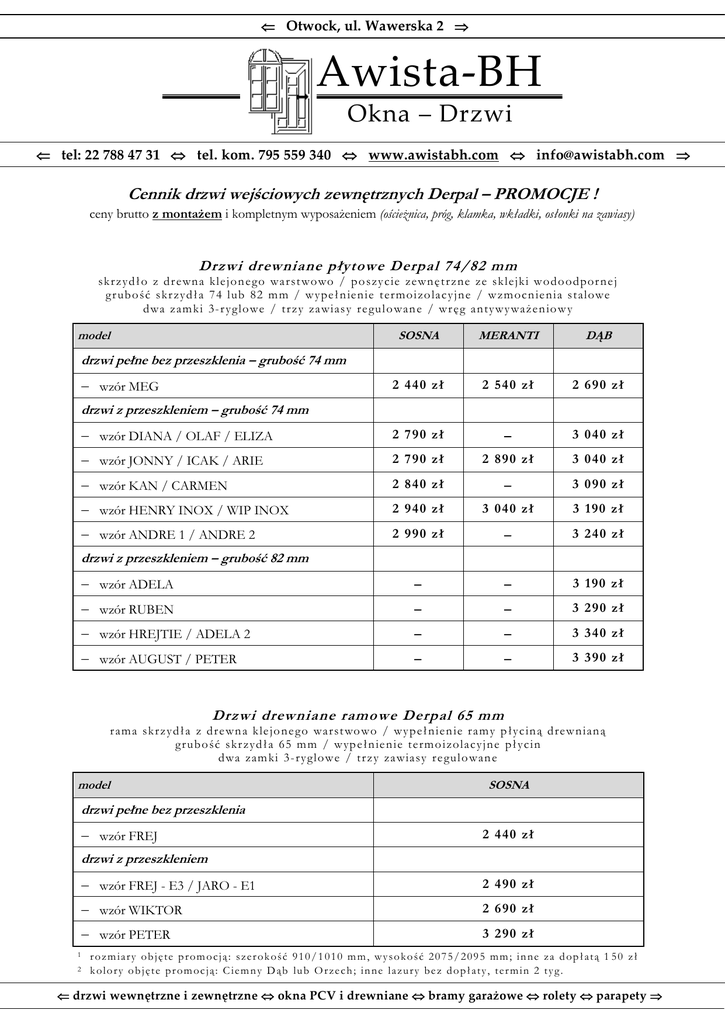 Otwock, ul. Wawerska 2 Awista-BH Okna – Drzwi tel: 22 788 47 31 tel. kom. 795 559 340 www.awistabh.com [email protected] Cennik drzwi wejściowych zewnętrznych Derpal – PROMOCJE ! ceny brutto z montażem i kompletnym wyposażeniem (ościeżnica, próg, klamka, wkładki, osłonki na zawiasy) Drzwi drewniane płytowe Derpal 7 4/82 mm skr zy dł o z dr e wn a kle jo n e go war st wo wo / p o szy c ie ze wn ę t r zne ze skle jki wo do o dpor n e j gr ub o ść skr zy dł a 74 lub 82 m m / wy pe ł n ie n ie t er mo izo lac y jn e / wzm oc n ie n ia st alowe dwa zam ki 3- r y glo we / t r zy zawiasy r e gul o wan e / wr ę g an ty wy waże n io w y model SOSNA MERANTI DĄB 2 440 zł 2 540 zł 2 690 zł wzór DIANA / OLAF / ELIZA 2 790 zł 3 040 zł wzór JONNY / ICAK / ARIE 2 790 zł 2 890 zł 3 040 zł wzór KAN / CARMEN 2 840 zł 3 090 zł wzór HENRY INOX / WIP INOX 2 940 zł 3 040 zł 3 190 zł wzór ANDRE 1 / ANDRE 2 2 990 zł 3 240 zł wzór ADELA 3 190 zł wzór RUBEN 3 290 zł wzór HREJTIE / ADELA 2 3 340 zł wzór AUGUST / PETER 3 390 zł drzwi pełne bez przeszklenia – grubość 74 mm wzór MEG drzwi z przeszkleniem – grubość 74 mm drzwi z przeszkleniem – grubość 82 mm Drzwi drewniane ramowe Derpal 65 mm r am a skr zy dł a z dr e wn a kle jo n e go war st wo wo / wy p eł n ie n ie r am y p ły c in ą dre wn ian ą gr ub o ść skr zy dł a 65 m m / wyp e łn ie n ie t e rm o izo lac y jn e pł y c in dwa zam ki 3- r y glo we / t r zy zawiasy r e gul o wan e model SOSNA drzwi pełne bez przeszklenia wzór FREJ 2 440 zł drzwi z przeszkleniem wzór FREJ - E3 / JARO - E1 2 490 zł wzór WIKTOR 2 690 zł wzór PETER 3 290 zł 1 2 rozmiary objęte promocją: szerokość 910/1010 mm, wysokość 2075/2095 mm; inne za dopłatą 1 50 zł kolory objęte promocją: Ciemny Dąb lub Orzech; inne lazury bez dopłaty, termin 2 tyg. drzwi wewnętrzne i zewnętrzne okna PCV i drewniane bramy garażowe rolety parapety