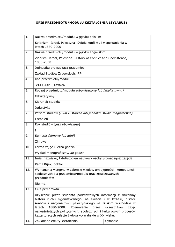 OPIS PRZEDMIOTU/MODUŁU KSZTAŁCENIA (SYLABUS) 1. Nazwa przedmiotu/modułu w języku polskim Syjonizm, Izrael, Palestyna- Dzieje konfliktu i współistnienia w latach 1880-2000 2. Nazwa przedmiotu/modułu w języku angielskim Zionism, Israel, Palestine- History of Conflict and Coexistence, 1880-2000 3. Jednostka prowadząca przedmiot Zakład Studiów Żydowskich, IFP 4. Kod przedmiotu/modułu 21-FL-J-S1-E1-WMon 5. Rodzaj przedmiotu/modułu (obowiązkowy lub fakultatywny) Fakultatywny 6. Kierunek studiów Judaistyka 7. Poziom studiów (I lub II stopień lub jednolite studia magisterskie) I stopień 8. Rok studiów (jeśli obowiązuje) I 9. Semestr (zimowy lub letni) Zimowy 10. Forma zajęć i liczba godzin Wykład monograficzny, 30 godzin 11. Imię, nazwisko, tytuł/stopień naukowy osoby prowadzącej zajęcia Kamil Kijek, doktor 12. Wymagania wstępne w zakresie wiedzy, umiejętności i kompetencji społecznych dla przedmiotu/modułu oraz zrealizowanych przedmiotów Nie ma. 13. Cele przedmiotu Uzyskanie przez studenta podstawowych informacji z dziedziny historii ruchu syjonistycznego, na świecie i w Izraelu, historii Arabów i nacjonalizmu palestyńskiego na Bliskim Wschodzie w latach 1880-2000. Rozumienie przez uczestników zajęć najważniejszych politycznych, społecznych i kulturowych procesów kształtujących relacje żydowsko-arabskie w XX wieku. 14. Zakładane efekty kształcenia Symbole kierunkowych efektów kształcenia, np.: K_W01*, K_U05, K_K03 Student ma świadomość miejsca polszczyzny wśród innych języków i konieczności doskonalenia sprawności językowej w języku polskim zna podstawowe fakty i procesy rozwoju języka nowohebrajskiego, w formie wysokiej i masowej, w XX wieku, zajmujące się nim teorie i szkoły badawcze w ramach filologii hebrajskiej, a zwłaszcza ich zastosowanie do analiz problemów konflikty bliskowschodniego i historii syjonizmu. ma podstawową wiedzę o instytucjach żydowskiego życia kulturalnego i społecznego, ogólną orientację we współczesnym żydowskim życiu kulturalnym i społecznym w tzw. jiszuwie i Izraelu na przestrzeni XX wieku potrafi samodzielnie zdobywać wiedzę i rozwijać umiejętności badawcze w zakresie literaturoznawstwa, językoznawstwa lub kulturoznawstwa dotyczących współczesności, historii i kultury syjonizmu i Izraela, wykorzystując wskazówki opiekuna naukowego i literaturę przedmiotu rozumie potrzebę uczenia się przez całe życie, zwłaszcza w zakresie rozwijania umiejętności językowych ma świadomość znaczenia zasad etyki zawodowej i uczciwości intelektualnej w działaniach własnych i innych osób; postępuje zgodnie z tymi zasadami stosuje w praktyce zasady odnoszące się do ochrony prawa autorskiego K1_W05, K1_W06, K1_W08, K1_W11, K1_U03, K1_K01, K1_K04, K1_K05 15. Treści programowe Co to jest i kiedy powstał syjonizm? Wyodrębnianie się narodu palestyńskiego z narodu arabskiego. Wpływ historii Żydów w Europie na dzieje Bliskiego Wschodu w latach 1880-1948. Kolonializm a kształtowanie się nowoczesnej arabskiej podmiotowości politycznej na Bliskim Wschodzie. Powstanie Izraela i jego znaczenie dla świata żydowskiego. ‘Nakba’ (katastrofa), jej znaczenie dla dziejów narodu palestyńskiego i Bliskiego Wschodu. Historia społeczna i polityczna Izraela w latach 1948-2000. Historia społeczna i polityczna Palestyńczyków w latach 1948-2000. 16. Zalecana literatura (podręczniki) David Engel „Zionism”, Harlow, New York 2009. Baruch Kimmerling, Joseph A. Migdal „The Palestinian People. A History.”, Cambridge Mass., 2003 Rashid Khalidi “Palestinian Identity: the construction of modern national consciousness”, New York 2010. Benny Morris “Righteous Victims. A History of the Zionist-Arab Conflict, 1881-2001”, New York 2001. Anita Shapira „Israel. A History”, Waltham Mass., 2012 17. Forma zaliczenia poszczególnych komponentów przedmiotu/modułu, sposób sprawdzenia osiągnięcia zamierzonych efektów kształcenia: wykład: zaliczenie na ocenę w formie kolokwium końcowego 18. Język wykładowy Polski 19. Obciążenie pracą studenta Forma aktywności studenta Średnia liczba godzin na zrealizowanie aktywności Godziny zajęć (wg planu studiów) z nauczycielem: - wykład: 30 30 Praca własna studenta np.: - przygotowanie do zajęć: 15 30 - przygotowanie do kolokwium:15 Suma godzin 60 Liczba punktów ECTS 2