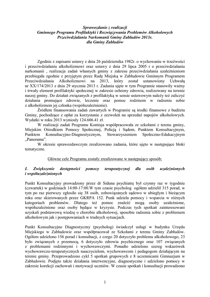 Sprawozdanie z realizacji Gminnego Programu Profilaktyki i Rozwiązywania Problemów Alkoholowych Przeciwdziałania Narkomanii Gminy Zabłudów 2013r. dla Gminy Zabłudów Zgodnie z zapisami ustawy z dnia 26 października 1982r. o wychowaniu w trzeźwości i przeciwdziałaniu alkoholizmowi oraz ustawy z dnia 29 lipca 2005 r o przeciwdziałaniu narkomanii , realizacja zadań własnych gminy z zakresu przeciwdziałania uzależnieniom przebiegała zgodnie z przyjętym przez Radę Miejską w Zabłudowie Gminnym Programem Przeciwdziałania Alkoholizmowi na 2013, który został ustanowiony Uchwałą nr XX/174/2013 z dnia 29 stycznia 2013 r. Zadania ujęte w tym Programie stanowiły ważny i trwały element profilaktyki społecznej w zakresie ochrony zdrowia, realizowany na terenie naszej gminy. Do działań związanych z profilaktyką w sensie ustawowym należy też zaliczyć działania promujące zdrowie, leczenie oraz pomoc rodzinom w radzeniu sobie z alkoholizmem jej członka (współuzależnienie). Źródłem finansowania zadań zawartych w Programie są środki finansowe z budżetu Gminy, pochodzące z opłat za korzystanie z zezwoleń na sprzedaż napojów alkoholowych. Wydatki w roku 2013 wyniosły 124.606.41 zł. W realizacji zadań Programu Komisja współpracowała ze szkołami z terenu gminy, Miejskim Ośrodkiem Pomocy Społecznej, Policją i Sądem, Punktem Konsultacyjnym, Punktem Konsultacyjno-Diagnostycznym, Stowarzyszeniem Społeczno-Edukacyjnym „Panorama”. W okresie sprawozdawczym zrealizowano zadania, które ujęto w następujące bloki tematyczne. Główne cele Programu zostały zrealizowane w następujący sposób: I. Zwiększenie dostępności i współuzależnionych pomocy terapeutycznej dla osób uzależnionych Punkt Konsultacyjny prowadzony przez dr Siduna psychiatrę był czynny raz w tygodniu (czwartek) w godzinach 14:00-17:00.W tym czasie psycholog ogółem udzielił 315 porad, w tym po raz pierwszy zgłosiło się 38 osób, zobowiązanych sądowo w ubiegłym i bieżącym roku oraz skierowanych przez GKRPA 152. Punk udziela pomocy i wsparcia w różnych kategoriach problemów. Dlatego też pomoc znaleźć mogą osoby uzależnione, współuzależnione oraz osoby będące w kryzysie. Podczas tych spotkań zainteresowani uzyskali podstawową wiedzę o chorobie alkoholowej, sposobie radzenia sobie z problemem alkoholowym jak i postępowaniach w trudnych sytuacjach. Punkt Konsultacyjno Diagnostyczny (psycholog) świadczył usługi w budynku Urzędu Miejskiego w Zabłudowie oraz współpracował ze Szkołami z terenu Gminy Zabłudów. Ogółem udzielono 156 porad i konsultacji, z czego 20 dotyczyło problemu alkoholowego, 23 było związanych z przemocą, 6 dotyczyło zdrowia psychicznego oraz 107 związanych z problemami rodzinnymi i wychowawczymi. Ponadto udzielono szereg wskazówek wychowawczo-terapeutycznych nauczycielom, wychowawcom i pedagogom działającym na terenie gminy. Przeprowadzono cykl 5 spotkań grupowych z 8 uczennicami Gimnazjum w Zabłudowie. Podjęto także działania interwencyjne, diagnostyczne i udzielono pomocy w zakresie korekcji zachowań i motywacji uczniów. W czasie spotkań i konsultacji prowadzono 1 działania psychoedukacyjne, profilaktyczne i psychoterapeutyczne. Wiele spraw i zgłaszanych problemów udało się rozwiązać, jednakowo nadal pozostaje wydatny obszar wymagający dalszych działań psycho-korekcyjno-diagnostycznych i terapeutycznych adresowanych do mieszkańców gminy Zabłudów. Prace Komisji W 2013 roku do pracy w Komisji zostało powołanych 10 osób Zarządzeniem Burmistrza Zabłudowa Nr VI/312/13 z dnia 30 lipca 2013 roku w sprawie zmiany składu GKRPA zmieniającego Zarządzenie Nr VI/20/07z dnia 14 lutego 2007 roku w sprawie powołania GKRPA.W skład komisji powołane zostały osoby wskazane przez instytucje działające w obrębie profilaktyki i przeciwdziałania alkoholizmowi, tj: -pracownicy Miejskiego Ośrodka Pomocy Społecznej w Zabłudowie: - pracownik Posterunku Policji w Zabłudowie; -pracownik Urzędu Miejskiego w Zabłudowie; -pracownicy placówek oświatowo-wychowawczych. 1.Posiedzenia W 2013 roku odbyły się 13 posiedzeń Komisji, podczas których omawiano sprawy: - uzależnień oraz przeprowadzano rozmowy interwencyjo-motywujące z osobami dotkniętymi problemem alkoholowym; - wniosków skierowanych do Komisji o przymusowe leczenie odwykowe od alkoholu; -zaopiniowania wniosków o wydanie zezwolenia na sprzedaż i podawanie napojów alkoholowych; - ofert programowych, które dotyczyły profilaktyki alkoholowej dla dzieci i młodzieży; - ofert szkoleniowych; - oferty wypoczynku letniego dla dzieci i młodzieży; - harmonogramu kontroli punktów sprzedaży i podawania napojów alkoholowych; - zaplanowania budżetu Komisji; - zaprojektowania Gminnego Programu na rok 2013; - innych spraw bieżących i związanych ze zmianami, jakie następowały w funkcjonowaniu Komisji. 2.Wnioski Sądowe Zadaniem Komisji zgodnie z wymogami ustawowymi było inicjowanie zadań związanych z profilaktyką i rozwiązywaniem problemów alkoholowych oraz podejmowanie czynności zmierzających do orzeczenia o zastosowaniu wobec osób uzależnionych od alkoholu obowiązku poddania się leczeniu w zakładzie lecznictwa odwykowego. Dodatkowo Komisja podczas posiedzeń każdorazowo podejmowała czynności mające na celu zmotywowanie osób uzależnionych do podjęcia leczenia odwykowego oraz do uświadomienia im specyfiki choroby alkoholowej W 2013 roku do GKRPA wpłynęło 62 wniosków o przeprowadzenie rozmów profilaktycznomotywujących i podjęcia leczenia przez osoby uzależnione od alkoholu, które w związku z nadużywaniem alkoholu powodują rozkład życia rodzinnego, demoralizację nieletnich, uchylają się od pracy lub systematycznie zakłócają porządek publiczny. We wszystkich przypadkach zgromadzono pełną dokumentację wraz z wywiadami środowiskowymi i policyjnymi. Statystyka dotycząca wniosków złożonych o ws