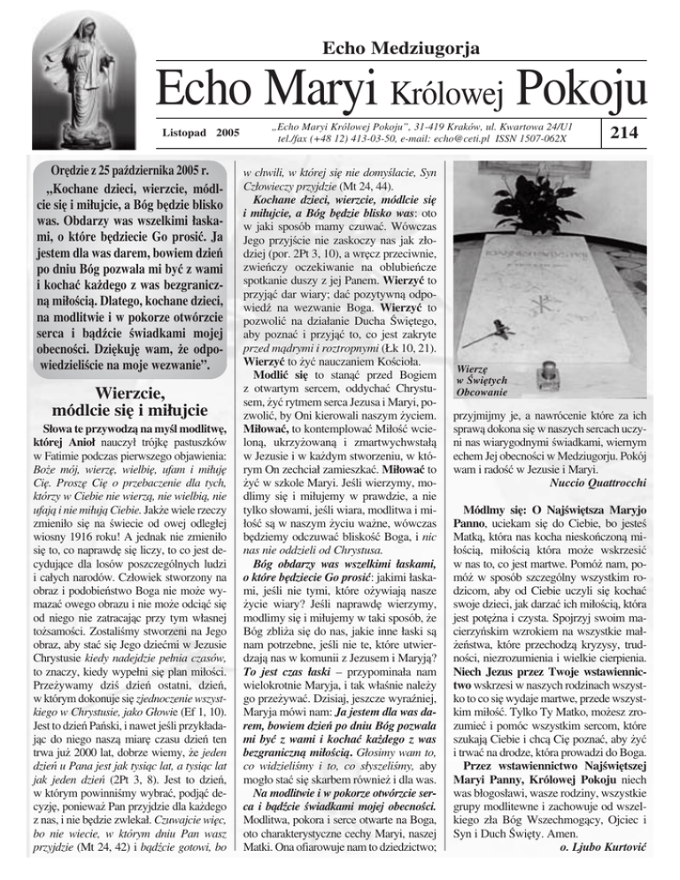 Echo Medziugorja Echo Maryi Królowej Pokoju Listopad 2005 Or´dzie z 25 pa˝dziernika 2005 r. „Kochane dzieci, wierzcie, módlcie si´ i mi∏ujcie, a Bóg b´dzie blisko was. Obdarzy was wszelkimi ∏askami, o które b´dziecie Go prosiç. Ja jestem dla was darem, bowiem dzieƒ po dniu Bóg pozwala mi byç z wami i kochaç ka˚dego z was bezgranicznà mi∏oÊcià. Dlatego, kochane dzieci, na modlitwie i w pokorze otwórzcie serca i bàd˝cie Êwiadkami mojej obecnoÊci. Dzi´kuj´ wam, ˚e odpowiedzieliÊcie na moje wezwanie”. Wierzcie, módlcie si´ i mi∏ujcie S∏owa te przywodzà na myÊl modlitw´, której Anio∏ nauczy∏ trójk´ pastuszków w Fatimie podczas pierwszego objawienia: Bo˚e mój, wierz´, wielbi´, ufam i mi∏uj´ Ci´. Prosz´ Ci´ o przebaczenie dla tych, którzy w Ciebie nie wierzà, nie wielbià, nie ufajà i nie mi∏ujà Ciebie. Jak˚e wiele rzeczy zmieni∏o si´ na Êwiecie od owej odleg∏ej wiosny 1916 roku! A jednak nie zmieni∏o si´ to, co naprawd´ si´ liczy, to co jest decydujàce dla losów poszczególnych ludzi i ca∏ych narodów. Cz∏owiek stworzony na obraz i podobieƒstwo Boga nie mo˚e wymazaç owego obrazu i nie mo˚e odciàç si´ od niego nie zatracajàc przy tym w∏asnej to˚samoÊci. ZostaliÊmy stworzeni na Jego obraz, aby staç si´ Jego dzieçmi w Jezusie Chrystusie kiedy nadejdzie pe∏nia czasów, to znaczy, kiedy wype∏ni si´ plan mi∏oÊci. Prze˚ywamy dziÊ dzieƒ ostatni, dzieƒ, w którym dokonuje si´ zjednoczenie wszystkiego w Chrystusie, jako G∏owie (Ef 1, 10). Jest to dzieƒ Paƒski, i nawet jeÊli przyk∏adajàc do niego naszà miar´ czasu dzieƒ ten trwa ju˚ 2000 lat, dobrze wiemy, ˚e jeden dzieƒ u Pana jest jak tysiàc lat, a tysiàc lat jak jeden dzieƒ (2Pt 3, 8). Jest to dzieƒ, w którym powinniÊmy wybraç, podjàç decyzj´, poniewa˚ Pan przyjdzie dla ka˚dego z nas, i nie b´dzie zwleka∏. Czuwajcie wi´c, bo nie wiecie, w którym dniu Pan wasz przyjdzie (Mt 24, 42) i bàd˝cie gotowi, bo „Echo Maryi Królowej Pokoju”, 31-419 Kraków, ul. Kwartowa 24/U1 tel./fax (+48 12) 413-03-50, e-mail: [email protected] ISSN 1507-062X w chwili, w której si´ nie domyÊlacie, Syn Cz∏owieczy przyjdzie (Mt 24, 44). Kochane dzieci, wierzcie, módlcie si´ i mi∏ujcie, a Bóg b´dzie blisko was: oto w jaki sposób mamy czuwaç. Wówczas Jego przyjÊcie nie zaskoczy nas jak z∏odziej (por. 2Pt 3, 10), a wr´cz przeciwnie, zwieƒczy oczekiwanie na oblubieƒcze spotkanie duszy z jej Panem. Wierzyç to przyjàç dar wiary; daç pozytywnà odpowied˝ na wezwanie Boga. Wierzyç to pozwoliç na dzia∏anie Ducha Âwi´tego, aby poznaç i przyjàç to, co jest zakryte przed màdrymi i roztropnymi (∑k 10, 21). Wierzyç to ˚yç nauczaniem KoÊcio∏a. Modliç si´ to stanàç przed Bogiem z otwartym sercem, oddychaç Chrystusem, ˚yç rytmem serca Jezusa i Maryi, pozwoliç, by Oni kierowali naszym ˚yciem. Mi∏owaç, to kontemplowaç Mi∏oÊç wcielonà, ukrzy˚owanà i zmartwychwsta∏à w Jezusie i w ka˚dym stworzeniu, w którym On zechcia∏ zamieszkaç. Mi∏owaç to ˚yç w szkole Maryi. JeÊli wierzymy, modlimy si´ i mi∏ujemy w prawdzie, a nie tylko s∏owami, jeÊli wiara, modlitwa i mi∏oÊç sà w naszym ˚yciu wa˚ne, wówczas b´dziemy odczuwaç bliskoÊç Boga, i nic nas nie oddzieli od Chrystusa. Bóg obdarzy was wszelkimi ∏askami, o które b´dziecie Go prosiç: jakimi ∏askami, jeÊli nie tymi, które o˚ywiajà nasze ˚ycie wiary? JeÊli naprawd´ wierzymy, modlimy si´ i mi∏ujemy w taki sposób, ˚e Bóg zbli˚a si´ do nas, jakie inne ∏aski sà nam potrzebne, jeÊli nie te, które utwierdzajà nas w komunii z Jezusem i Maryjà? To jest czas ∏aski – przypomina∏a nam wielokrotnie Maryja, i tak w∏aÊnie nale˚y go prze˚ywaç. Dzisiaj, jeszcze wyra˝niej, Maryja mówi nam: Ja jestem dla was darem, bowiem dzieƒ po dniu Bóg pozwala mi byç z wami i kochaç ka˚dego z was bezgranicznà mi∏oÊcià. G∏osimy wam to, co widzieliÊmy i to, co s∏yszeliÊmy, aby mog∏o staç si´ skarbem równie˚ i dla was. Na modlitwie i w pokorze otwórzcie serca i bàd˝cie Êwiadkami mojej obecnoÊci. Modlitwa, pokora i serce otwarte na Boga, oto charakterystyczne cechy Maryi, naszej Matki. Ona ofiarowuje nam to dziedzictwo; 214 Wierz´ w Âwi´tych Obcowanie przyjmijmy je, a nawrócenie które za ich sprawà dokona si´ w naszych sercach uczyni nas wiarygodnymi Êwiadkami, wiernym echem Jej obecnoÊci w Medziugorju. Pokój wam i radoÊç w Jezusie i Maryi. Nuccio Quattrocchi Módlmy si´: O NajÊwi´tsza Maryjo Panno, uciekam si´ do Ciebie, bo jesteÊ Matkà, która nas kocha nieskoƒczonà mi∏oÊcià, mi∏oÊcià która mo˚e wskrzesiç w nas to, co jest martwe. Pomó˚ nam, pomó˚ w sposób szczególny wszystkim rodzicom, aby od Ciebie uczyli si´ kochaç swoje dzieci, jak darzaç ich mi∏oÊcià, która jest pot´˚na i czysta. Spojrzyj swoim macierzyƒskim wzrokiem na wszystkie ma∏˚eƒstwa, które przechodzà kryzysy, trudnoÊci, niezrozumienia i wielkie cierpienia. Niech Jezus przez Twoje wstawiennictwo wskrzesi w naszych rodzinach wszystko to co si´ wydaje martwe, przede wszystkim mi∏oÊç. Tylko Ty Matko, mo˚esz zrozumieç i pomóc wszystkim sercom, które szukajà Ciebie i chcà Ci´ poznaç, aby ˚yç i trwaç na drodze, która prowadzi do Boga. Przez wstawiennictwo NajÊwi´tszej Maryi Panny, Królowej Pokoju niech was b∏ogos∏awi, wasze rodziny, wszystkie grupy modlitewne i zachowuje od wszelkiego z∏a Bóg Wszechmogàcy, Ojciec i Syn i Duch Âwi´ty. Amen. o. Ljubo Kurtoviç ~2~ Z ˚ycia KoÊcio∏a Próg wielkiej tajemnicy „«Jest czas rodzenia i czas umierania» – powiada Eklezjastes w swojej Ksi´dze. Oby i mnie dane by∏o narodziç si´ w odpowiednim czasie i umrzeç w pomyÊlnym. Narodziny naturalne nie zale˚à od woli niewiasty ani te˚ Êmierç, nie podlega wolnemu wyborowi umierajàcego. Dlatego wypada zastanowiç si´ czym sà narodziny w 