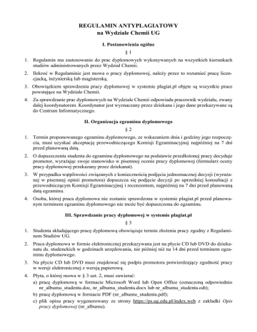 REGULAMIN ANTYPLAGIATOWY na Wydziale Chemii UG I. Postanowienia ogólne §1 1. Regulamin ma zastosowanie do prac dyplomowych wykonywanych na wszystkich kierunkach studiów administrowanych przez Wydział Chemii. 2. Ilekroć w Regulaminie jest mowa o pracy dyplomowej, należy przez to rozumieć pracę licencjacką, inżynierską lub magisterską. 3. Obowiązkiem sprawdzenia pracy dyplomowej w systemie plagiat.pl objęte są wszystkie prace powstające na Wydziale Chemii. 4. Za sprawdzanie prac dyplomowych na Wydziale Chemii odpowiada pracownik wydziału, zwany dalej koordynatorem. Koordynator jest wyznaczany przez dziekana i jego dane przekazywane są do Centrum Informatycznego. II. Organizacja egzaminu dyplomowego §2 1. Termin proponowanego egzaminu dyplomowego, ze wskazaniem dnia i godziny jego rozpoczęcia, musi uzyskać akceptację przewodniczącego Komisji Egzaminacyjnej najpóźniej na 7 dni przed planowaną datą. 2. O dopuszczeniu studenta do egzaminu dyplomowego na podstawie przedłożonej pracy decyduje promotor, wyrażając swoje stanowisko w pisemnej ocenie pracy dyplomowej (formularz oceny pracy dyplomowej przekazany przez dziekanat). 3. W przypadku wątpliwości związanych z koniecznością podjęcia jednoznacznej decyzji (wyrażanej w pisemnej opinii promotora) dopuszcza się podjęcie decyzji po uprzedniej konsultacji z przewodniczącym Komisji Egzaminacyjnej i recenzentem, najpóźniej na 7 dni przed planowaną datą egzaminu. 4. Osoba, której praca dyplomowa nie zostanie sprawdzona w systemie plagiat.pl przed planowanym terminem egzaminu dyplomowego nie może być dopuszczona do egzaminu. III. Sprawdzanie pracy dyplomowej w systemie plagiat.pl §3 1. Studenta składającego pracę dyplomową obowiązuje termin złożenia pracy zgodny z Regulaminem Studiów UG. 2. Praca dyplomowa w formie elektronicznej przekazywana jest na płycie CD lub DVD do dziekanatu ds. studenckich w godzinach urzędowania, nie później niż na 14 dni przed terminem egzaminu dyplomowego. 3. Na płycie CD lub DVD musi znajdować się podpis promotora potwierdzający zgodność pracy w wersji elektronicznej z wersją papierową. 4. Płyta, o której mowa w § 3 ust. 2, musi zawierać: a) pracę dyplomową w formacie Microsoft Word lub Open Office (oznaczoną odpowiednio nr_albumu_studenta.doc, nr_albumu_studenta.docx lub nr_albumu_studenta.odt); b) pracę dyplomową w formacie PDF (nr_albumu_studenta.pdf); c) plik opisu pracy wygenerowany ze strony https://ps.ug.edu.pl/index.web z zakładki Opis pracy dyplomowej (nr_albumu). 5. Płyta, o której mowa w § 3 ust. 2, powinna być podpisana, pisakiem do tego przeznaczonym, w następujący sposób: a) nazwisko i imię studenta; b) nr albumu studenta; c) kierunek, stopień, tryb studiów (np. Chemia, II stopień, studia stacjonarne); d) nazwisko i imię promotora; e) podpis promotora. 6. Płyta niespełniająca § 3 ust. 3‐6 nie będzie przyjęta do sprawdzenia w systemie plagiat.pl. 7. Po sprawdzeniu przez dziekanat ds. studenckich poprawności danych na płycie, płyta zostaje przekazana koordynatorowi do sprawdzenia w systemie plagiat.pl. §4 1. Po przyjęciu płyty z pracą dyplomową jej zawartość zostaje przegrana do katalogu: Nazwisko_Imię_ nr albumu. 2. Plik o nazwie nr_albumu_studenta.doc, nr_albumu_studenta.docx lub nr_albumu_studenta.odt zostaje wprowadzony do sprawdzenia w systemie plagiat.pl. 3. Praca dyplomowa jest sprawdzana w systemie plagiat.pl niezwłocznie po jej otrzymaniu. IV. Przekazywanie raportów ze sprawdzonych prac dyplomowych promotorom §5 1. Po otrzymaniu raportu z systemu plagiat.pl nagrywana jest druga płyta, na której znajdują się: a) oryginalna zawartość płyty przyniesionej przez studenta nagrana w katalogu o nazwie: Nazwisko_Imię_nr albumu; b) do katalogu wymienionego w § 5 ust. 1 lit. a) dogrywane są dwa pliki z systemu plagiat.pl: - skrócony, RaportPlagiat_Nazwisko_Imię‐skrócony.html - pełny, RaportPlagiat_Nazwisko_Imię.html 2. Płyta nagrywana jest przez osobę uprawnioną do przekazywania raportów. 3. Do nagranej płyty dołączany jest skrócony raport z systemu plagiat.pl w wersji papierowej. Wersja papierowa jest podpisana przez osobę sporządzającą raport. 4. Raport w wersji papierowej, oryginalna płyta studenta i płyta z nagranymi raportami trafiają do dziekanatu ds. studenckich w ciągu 3 dni od wygenerowania raportu. 5. Dziekanat ma obowiązek przekazać raport skrócony w formie elektronicznej właściwemu promotorowi nie później niż następnego dnia roboczego po nagraniu płyty. V. Promotorzy §6 1. Współczynnik podobieństwa, bez względu na jego wartość liczbową, nie może być wyłączną podstawą oceny pracy dyplomowej, a zwłaszcza stanowić jedynego kryterium decydującego o jej akceptacji albo odrzuceniu. 2. Po sprawdzeniu pracy dyplomowej w systemie plagiat.pl i stwierdzeniu, np. na podstawie wysokiego współczynnika podobieństwa, iż przedstawiona przez studenta praca jest w niewystarczającym stopniu samodzielna w świetle wymagań stawianych pracom dyplomowym oraz wskazuje na podejrzenie popełnienia przez studenta czynu będącego naruszeniem ustawy o prawie autorskim i prawach pokrewnych (czynu polegającego na przypisaniu sobie autorstwa istotnego fragmentu lub innych elementów cudzego utworu), promotor wnioskuje do dziekana o niedopuszczenie studenta do egzaminu dyplomowego oraz podejmuje decyzję o poprawieniu pracy albo napisaniu nowej pracy. 3. Po sprawdzeniu pracy dyplomowej w systemie plagiat.pl promotor przygotowuje pisemną opinię dotyczącą raportu z serwisu antyplagiatowego. Opinia promotora dotycząca raportu podobieństwa dołączana jest do oceny pracy dyplomowej i przekazywana do teczki z aktami studenta. 4. Płyta musi być dostępna w trakcie egzaminu dyplomowego, aby członkowie Komisji Egzaminacyjnej w razie wątpliwości, w każdej chwili mogli zapoznać się ze szczegółowym raportem podobieństwa. VI. Odrzucona praca dyplomowa