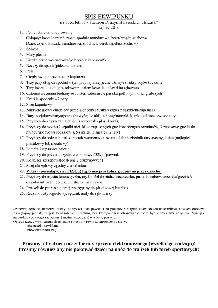 SPIS EKWIPUNKU na obóz letni 17 Szczepu Drużyn Harcerskich „Brzask” Lipiec 2016 1. Pełne letnie umundurowanie Chłopcy: koszula mundurowa, spodnie mundurowe, beret/czapka zuchowa Dziewczyny: koszula mundurowa, spódnica, beret/kapelusz zuchowy 2. Śpiwór 3. Mały plecak 4. Kurtka przeciwdeszczowa/peleryna(z kapturem!) 5. Rzeczy do spania(pidżama lub dres) 6. Polar 7. Ciepły sweter oraz bluza z kapturem 8. Trzy pary długich spodni(w tym przynajmniej jedne dżinsy/sztruksy/bojówki czarne 9. Trzy koszulki z długim rękawem, osiem koszulek z krótkim rękawem 10. Czternaście zmian bielizny osobistej, czternaście par skarpet(w tym kilka grubszych) 11. Krótkie spodenki - 2 pary 12. Strój kąpielowy 13. Nakrycie głowy chroniące przed słońcem(chustka/czapka z daszkiem/kapelusz) 14. Buty: wojskowe/turystyczne (powyżej kostki), adidasy/trampki, klapki, kalosze, ew. sandały. 15. Przybory do czyszczenia butów(szczoteczka plastikowa), 16. Przybory do szycia(2 szpulki nici, kilka zapasowych guzików różnych rozmiarów, 3 zapasowe guziki do munduru(obydwu rodzajów!), 5 szpilek, 5 agrafek, 2 igły) 17. Przybory do jedzenia: miska metalowa/menażka, sztućce lub niezbędnik turystyczny, kubek(najlepiej plastikowy lub metalowy), 18. Latarka i zapasowe baterie 19. Przybory do pisania, czysty, cienki zeszyt(32k), śpiewnik 20. Koszulka szczepowa(dostępna u drużynowych) 21. Strój obrzędowy zgodny z ustaleniami 22. Ważna (posiadająca nr PESEL) legitymacja szkolna, podpisana przez dziecko! 23. Przybory do mycia: kosmetyczka, mydło, żel do ciała, szczoteczka, pasta do zębów, szczotka/grzebień, dezodorant, krem do rąk, chusteczki nawilżane. 24. Proszek do prania(najlepiej przesypany do plastikowej butelki) 25. Ręcznik duży kąpielowy, ręcznik mały do rąk/twarzy Szanowni rodzice, harcerze, zuchy, powyższa lista powstała na podstawie długich doświadczeń uczestników naszych obozów. Pamiętajmy jednak, że jest to absolutne minimum, bez którego nasze obozowanie może być momentami uciążliwe. Spis jak najbardziej(do czego zachęcamy) można wzbogacić o własne pozycje. Oprócz rzeczy wymienionych na liście polecamy również zaopatrzenie się w: -chusteczki nawilżane -niewielką poduszkę Prosimy, aby dzieci nie zabierały sprzętu elektronicznego (wszelkiego rodzaju)! Prosimy również aby nie pakować dzieci na obóz do walizek lub toreb sportowych!