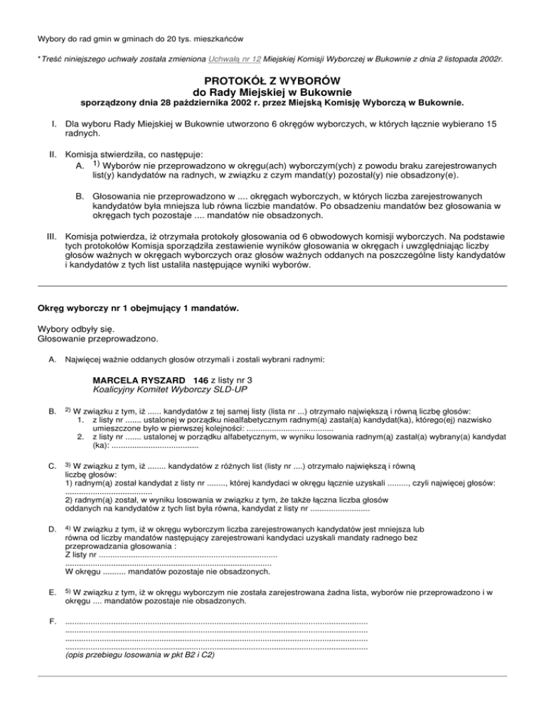 Wybory do rad gmin w gminach do 20 tys. mieszka ców *Tre niniejszego uchwały została zmieniona Uchwał nr 12 Miejskiej Komisji Wyborczej w Bukownie z dnia 2 listopada 2002r. PROTOKÓŁ Z WYBORÓW do Rady Miejskiej w Bukownie sporz dzony dnia 28 pa dziernika 2002 r. przez Miejsk Komisj Wyborcz w Bukownie. I. Dla wyboru Rady Miejskiej w Bukownie utworzono 6 okr gów wyborczych, w których ł cznie wybierano 15 radnych. II. Komisja stwierdziła, co nast puje: A. 1) Wyborów nie przeprowadzono w okr gu(ach) wyborczym(ych) z powodu braku zarejestrowanych list(y) kandydatów na radnych, w zwi zku z czym mandat(y) pozostał(y) nie obsadzony(e). B. Głosowania nie przeprowadzono w .... okr gach wyborczych, w których liczba zarejestrowanych kandydatów była mniejsza lub równa liczbie mandatów. Po obsadzeniu mandatów bez głosowania w okr gach tych pozostaje .... mandatów nie obsadzonych. III. Komisja potwierdza, i otrzymała protokoły głosowania od 6 obwodowych komisji wyborczych. Na podstawie tych protokołów Komisja sporz dziła zestawienie wyników głosowania w okr gach i uwzgl dniaj c liczby głosów wa nych w okr gach wyborczych oraz głosów wa nych oddanych na poszczególne listy kandydatów i kandydatów z tych list ustaliła nast puj ce wyniki wyborów. Okr g wyborczy nr 1 obejmuj cy 1 mandatów. Wybory odbyły si . Głosowanie przeprowadzono. A. Najwi cej wa nie oddanych głosów otrzymali i zostali wybrani radnymi: MARCELA RYSZARD 146 z listy nr 3 Koalicyjny Komitet Wyborczy SLD-UP B. 2) C. 3) W zwi zku z tym, i ........ kandydatów z ró nych list (listy nr ....) otrzymało najwi ksz i równ liczb głosów: 1) radnym( ) został kandydat z listy nr ........, której kandydaci w okr gu ł cznie uzyskali ........., czyli najwi cej głosów: ...................................... 2) radnym( ) został, w wyniku losowania w zwi zku z tym, e tak e ł czna liczba głosów oddanych na kandydatów z tych list była równa, kandydat z listy nr .......................... D. 4) W zwi zku z tym, i w okr gu wyborczym liczba zarejestrowanych kandydatów jest mniejsza lub równa od liczby mandatów nast puj cy zarejestrowani kandydaci uzyskali mandaty radnego bez przeprowadzania głosowania : Z listy nr .............................................................................. .......................................................................................... W okr gu .......... mandatów pozostaje nie obsadzonych. E. 5) F. .................................................................................................................................... .................................................................................................................................... .................................................................................................................................... .................................................................................................................................... (opis przebiegu losowania w pkt B2 i C2) W zwi zku z tym, i ...... kandydatów z tej samej listy (lista nr ...) otrzymało najwi ksz i równ liczb głosów: 1. z listy nr ....... ustalonej w porz dku niealfabetycznym radnym( ) zastał(a) kandydat(ka), którego(ej) nazwisko umieszczone było w pierwszej kolejno ci: ...................................... 2. z listy nr ....... ustalonej w porz dku alfabetycznym, w wyniku losowania radnym( ) zastał(a) wybrany(a) kandydat (ka): ...................................... W zwi zku z tym, i w okr gu wyborczym nie została zarejestrowana adna lista, wyborów nie przeprowadzono i w okr gu .... mandatów pozostaje nie obsadzonych. Okr g wyborczy nr 2 obejmuj cy 3 mandatów. Wybory odbyły si . Głosowanie przeprowadzono. A. Najwi cej wa nie oddanych głosów otrzymali i zostali wybrani radnymi: KUBA SKI STANISŁAW 144 z listy nr 14 "Ruch Samorz dowy Mieszka ców Bukowna" ŁYPACZEWSKI JANUSZ 196 z listy nr 14 "Ruch Samorz dowy Mieszka ców Bukowna" KOŁTON WENDELIN 165 z listy nr 18 "W SAMORZ DZIE DLA MIESZKA CÓW" B. 2) W zwi zku z tym, i ...... kandydatów z tej samej listy (lista nr ...) otrzymało najwi ksz i równ liczb głosów: 1. z listy nr ....... ustalonej w porz dku niealfabetycznym radnym( ) zastał(a) kandydat(ka), którego(ej) nazwisko umieszczone było w pierwszej kolejno ci: ................................... 2. z listy nr ....... ustalonej w porz dku alfabetycznym, w wyniku losowania radnym( ) został(a) wybrany(a) kandydat (ka): ...................................... C. 3) W zwi zku z tym, i ........ kandydatów z ró nych list (listy nr ....) otrzymało najwi ksz i równ liczb głosów: 1. radnym( ) został kandydat z listy nr ........, której kandydaci w okr gu ł cznie uzyskali ....................., czyli najwi cej głosów: .............................................. 2. radnym( ) został, w wyniku losowania w zwi zku z tym, e tak e ł czna liczba głosów oddanych na kandydatów z tych list była równa, kandydat z listy nr .......... .............................................. D. 4) E. 5) F. .................................................................................................................................... .................................................................................................................................... .................................................................................................................................... .................................................................................................................................... (opis przebiegu losowania w pkt B2 i C2) W zwi zku z tym, i w okr gu wyborczym liczba zarejestrowanych kandydatów jest mniejsza lub równa od liczby mandatów nast puj cy zarejestrowani kandydaci uzyskali mandaty radnego bez przeprowadzania głosowania : Z listy nr .......... ..................................................................... ..............