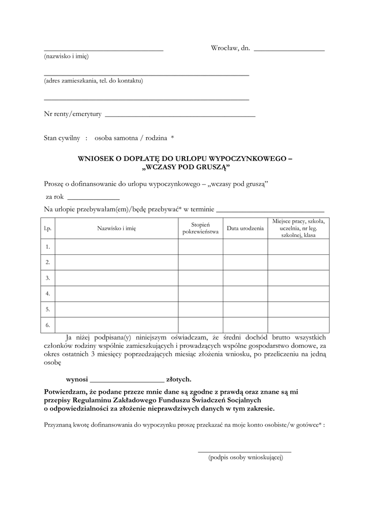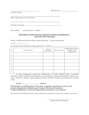 ________________________________ Wrocław, dn. ___________________ (nazwisko i imię) _______________________________________________________ (adres zamieszkania, tel. do kontaktu) _______________________________________________________ Nr renty/emerytury ____________________________________________ Stan cywilny : osoba samotna / rodzina * WNIOSEK O DOPŁATĘ DO URLOPU WYPOCZYNKOWEGO – „WCZASY POD GRUSZĄ” Proszę o dofinansowanie do urlopu wypoczynkowego – „wczasy pod gruszą” za rok ______________ Na urlopie przebywałam(em)/będę przebywać* w terminie _____________________________ l.p. Nazwisko i imię Stopień pokrewieństwa Data urodzenia Miejsce pracy, szkoła, uczelnia, nr leg. szkolnej, klasa 1. 2. 3. 4. 5. 6. Ja niżej podpisana(y) niniejszym oświadczam, że średni dochód brutto wszystkich członków rodziny wspólnie zamieszkujących i prowadzących wspólne gospodarstwo domowe, za okres ostatnich 3 miesięcy poprzedzających miesiąc złożenia wniosku, po przeliczeniu na jedną osobę wynosi ____________________ złotych. Potwierdzam, że podane przeze mnie dane są zgodne z prawdą oraz znane są mi przepisy Regulaminu Zakładowego Funduszu Świadczeń Socjalnych o odpowiedzialności za złożenie nieprawdziwych danych w tym zakresie. Przyznaną kwotę dofinansowania do wypoczynku proszę przekazać na moje konto osobiste/w gotówce* : _________________________ (podpis osoby wnioskującej) KADRY: Potwierdzam urlop wypoczynkowy w/w pracownika w terminie:_________________________ ________________________________________ (podpis i pieczątka pracownika) ___________________________________________________________________________ PROPOZYCJA KOMISJI SOCJALNEJ W dniu ________________ odbyło się posiedzenie Komisji ds. Funduszu Świadczeń Socjalnych w sprawie rozpatrzenia w/w podania. Podanie zaopiniowano pozytywnie / negatywnie* i wnioskuje się o udzielenie dofinansowania w kwocie _____________________ złotych, (słownie: __________________________________________________________________ ). Przewodniczący Komisji: _______________________ Członkowie: 1. ____________________ 2. __________________ 3. ___________________ 4. ____________________ 5. __________________ 6. ___________________ DECYZJA PRACODAWCY Przyznano* dofinansowanie / Nie przyznano* dofinansowania. ________________________ (podpis pracodawcy) *niepotrzebne skreślić UWAGA! Średni dochód brutto na osobę w rodzinie oblicza się jako wysokość wszystkich dochodów brutto uzyskiwanych przez wszystkie wspólnie zamieszkujące i prowadzące wspólne gospodarstwo domowe osoby w rodzinie, za okres ostatnich 3 miesięcy poprzedzających złożenie wniosku w następujący sposób: wynagrodzenie brutto minus koszty uzyskania przychodu dzielone przez liczbę osób w rodzinie. Do wniosku muszą być dołączone zeznania podatkowe PIT za rok ubiegły, potwierdzające uzyskany dochód. * W przypadku dochodu uzyskiwanego z gospodarstwa rolnego, podobnie jak przy świadczeniach rodzinnych (art. 5 ust. 8 ustawy z dnia 28 listopada 2003 r. – Dz. U. z 2006 r. Nr 139, poz. 992 ze zm.) przyjmuje się, że z 1 ha przeliczonego uzyskuje się dochód miesięczny w wysokości 1/12 dochodu ogłaszanego corocznie, w drodze obwieszczenia przez Prezesa Głównego Urzędu Statystycznego, na podstawie art. 18 ustawy z dnia 15 listopada 1984 r. o podatku rolnym (Dz. U. z 2006 r. nr 136, poz. 969 ze zm.