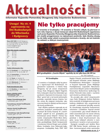 Informator Kujawsko-Pomorskiej Okręgowej Izby Inżynierów Budownictwa Uwaga! Na str. 4 zaproszenia na Dni Budowlanych do Włocławka i Bydgoszczy WŁADZE KONTAKTY Biuro KUP OIIB, 85-030 Bydgoszcz, ul. B. Rumińskiego 6 (Dom Technika), tel. (52) 366 70 50, fax 366 70 59., e-mail: [email protected] www.kup.piib.org.pl NR 10/2014 Nie tylko pracujemy 12 września w Grudziądzu i 18 września w Toruniu odbyły się pierwsze w tym roku imprezy z okazji ósmej już edycji Dni Budowlanych organizowanych przez Kujawsko-Pomorską Okręgową Izbę Inżynierów Budownictwa. Jak zwykle przygotowane na najwyższym poziomie, były idealną okazją, by nie tylko wziąć udział w poważnej rozmowie o branży, ale też świetnie się zabawić w dobrym towarzystwie. Biuro Izby pracuje w godzinach: Pon. 700-1500 Wt. 900-1700 Śr. 800-1600 Czw. 700-1500 Pt. 700-1500 Przyjęcia interesantów w godzinach: Wt. 1000-1700 Śr. 1000-1600 Czw. 800-1400 Punkty Informacyjne Izby: 86-300 Grudziądz, ul. J. Piłsudskiego 20, tel. (56) 46 101 70, fax 46 288 44 88-100 Inowrocław, ul. Orłowska 48, tel./fax (52) 357 46 66 87-100 Toruń, ul. Szeroka 34, tel. (56) 622 19 17, tel./fax 622 72 81 87-800 Włocławek, Pl. Wolności 1, tel./fax (54) 232 62 50 Punkt konsultacyjny Izby: 87-300 Brodnica, ul. Ogrodowa 12, tel. (56) 49 410 90 Dyżury członków władz: Przewodniczący Rady – poniedziałek, godz. 1400-1500 Zastępca Przewodniczącego Rady – poniedziałek, godz. 1400-1500 Przewodniczący Komisji Kwalifikacyjnej – środa, godz. 1500-1600 Sekretarz Komisji Kwalifikacyjnej – wtorek, godz. 1500-1700 Przewodniczący Sądu Dyscyplinarnego – wtorek, godz. 1500-1600 Rzecznik Odpowiedzialności Zawodowej – środa, godz. 1400-1600 Sekretarz Rady – środa, godz. 1500-1600 Skarbnik Rady – co drugi wtorek, godz. 1500-1700 W siedzibie Izby i w punktach informacyjnych dostępne są do wglądu materiały dotyczące umów FIDIC oraz zeszyty „Warunki techniczne wykonania i odbioru robót budowlanych” wydane przez Instytut Techniki Budowlanej. W biurze Izby można korzystać z komputerowego W grudziądzkim „Czarcim Młynie” zapełniły się nie tylko ławy dla VIP-ów Fot. Piotr Gajdowski W Grudziądzu 12 września w Grudziądzu odbył się pierwszy z tegorocznych Dni Budowlanych. Organizatorem wydarzenia, w imieniu Rady Okręgowej, był jak zawsze wiceprzewodniczący Rady Okręgowej Olgierd Nagórski, który tradycyjnie okazał się doskonałym gospodarzem. Zaproszeni do restauracji „Czarci Młyn” goście byli w tej kwestii jednomyślni, gratulując wspaniałej oprawy imprezy, bardzo cennej dla integracji środowiska, jako corocznej okazji do dyskusji nad kluczowymi dla branży problemami. Część oficjalna spotkania rozpoczęła się od powitania przybyłych przedstawicieli władz i ważnych dla branży instytucji. W „Czarcim Młynie” pojawili się m.in. grudziądzcy parlamentarzyści Janusz Dzięcioł i Tomasz Szymański, wiceprezydent Marek Sikora (który jest także członkiem naszej Izby), starosta powiatu grudziądzkiego Marek Szczepanowski i wicestarosta Edmund Korgol, pani architekt Miasta Grudziądza Anna Dekarczyk-Czajka, wiceprezes Grudziądzkiej Rady FSNT NOT Bogdan Pniewski, przedstawiciel Szkoły Wyższej Krzysztof Schroeder, prezes Miejskiego Przedsiębiorstwa Wodociągów i Oczyszczalni Krzysztof Dąbrowski, prezes Miejskiego Przedsiębiorstwa Gospodarki Nieruchomościami Zenon Różycki i prezes Grudziądzkiego Towarzystwa Budownictwa Społecznego Kazimierz Piotrowski (trzej ostatni z wymienionych również są członkami Izby). Na początku głos zabrał wiceprzewodniczący Rady Okręgowej Andrzej Myśliwiec, który stwierdził, że dobiegła końca już trzecia kadencja działalności Izby, przypomniał jej początki i zaakcentował specyfikę samorządu zawodowego inżynierów budownictwa, urbanistów i architektów. Poprosił również o wyrozumiałość, gdy wnioski składane do władz ustawodawczych nie zawsze odnoszą skutek. Później złożył wszystkim obecnym gratulacje z okazji dotychczasowych osiągnięć, życząc kolejnych sukcesów w życiu zawodowym i szczęścia w życiu prywatnym. Następnie wystąpiła pani dyrektor Biura KUP OIIB Renata Staszak, podnosząc problem kontrowersyjnych zmian wprowadzodokończenie na str. 2. Informator Kujawsko-Pomorskiej Okręgowej Izby Inżynierów Budownictwa październik 2014 dokończenie ze str. 1. nych przez przyjętą w tym roku tzw. ustawę deregulacyjną, która dotyczy również inżynierów budownictwa, architektów ale nie dotyczy już urbanistów. Ze względu na obecność wśród gości posła rządzącej Platformy Obywatelskiej Janusza Dzięcioła poprosiła go o uzasadnienie stanowiska w tej sprawie (poseł głosował za przyjęciem ustawy). Niestety, poseł Dzięcioł nie odniósł się od razu do wskazań pani Staszak usprawiedliwiając się koniecznością merytorycznego przygotowania do rzeczowej dyskusji. Poseł ograniczył się wobec tego do życzeń dla wszystkich zgromadzonych. Ciekawe było wystąpienie starosty Marka Szczepanowskiego, który nie poprzestał tylko na kurtuazyjnych życzeniach, akcentując uniwersalną rangę działalności budowlanych, którzy służą wspólnocie pozostawiając trwały, materialny ślad również wartości intelektualnych. Zaznaczył przy tym, jak ważna jest współpraca samorządu zawodowego z samorządem terytorialnym. Po dość zwięzłej części oficjalnej goście swobodnie przeszli do niezobowiązującej zabawy przy wspaniałym jedzeniu i przyjemnej składance złotych przebojów. A menu było naprawdę imponujące: dominowały ciepłe i zimne dania kuchni staropolskiej, a na deser – ciasta oczywiście z kawą i herbatą. Wszystkim dopisywały dobre humory, więc zabawa trwała do późnego wieczora. Miejmy nadzieję, że za rok będzie podobnie! W Toruniu 18 września toruński Dwór Artusa po raz kolejny stał się miejscem obchodów Dnia Budowlanych. Do wspaniałej 